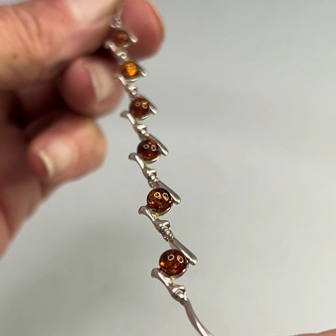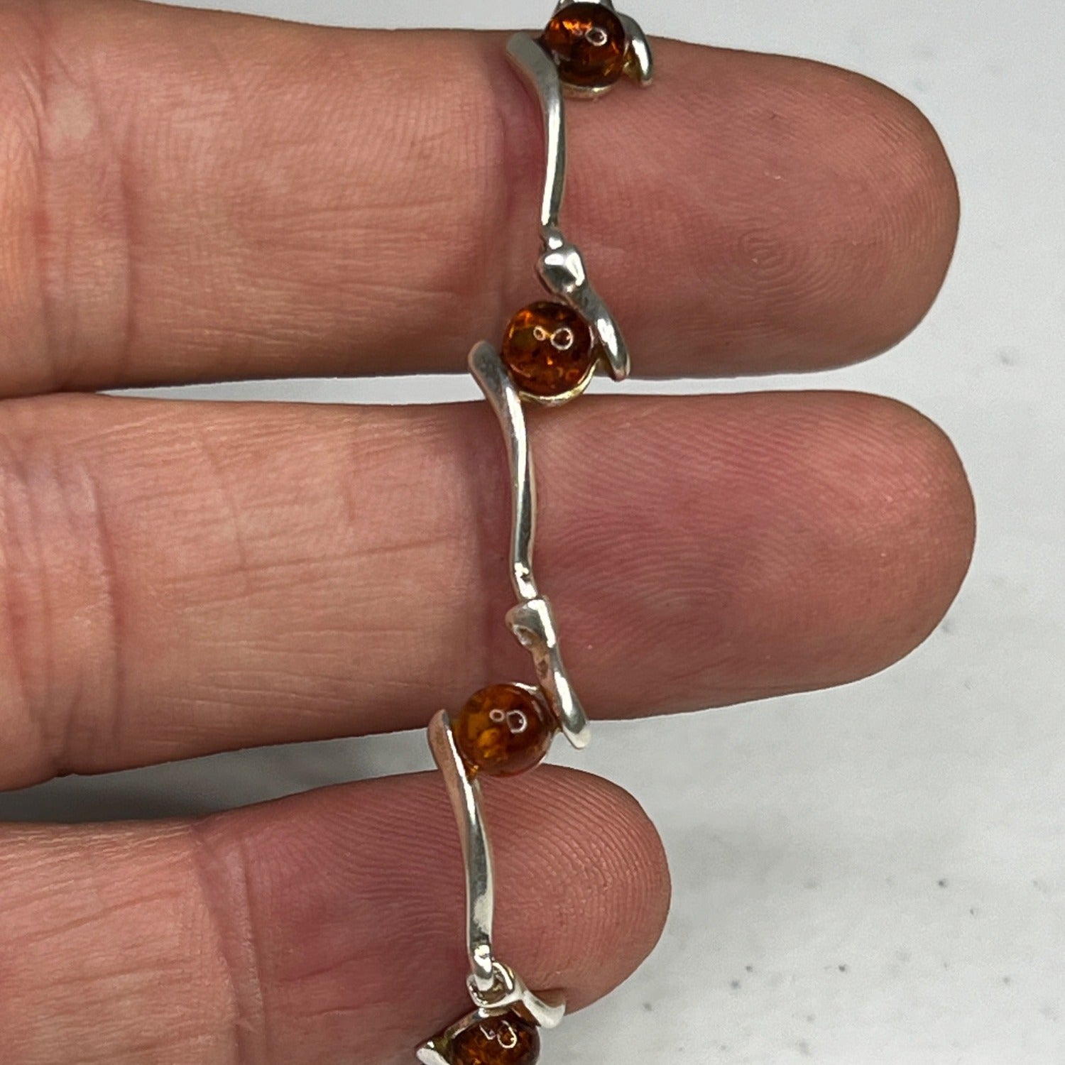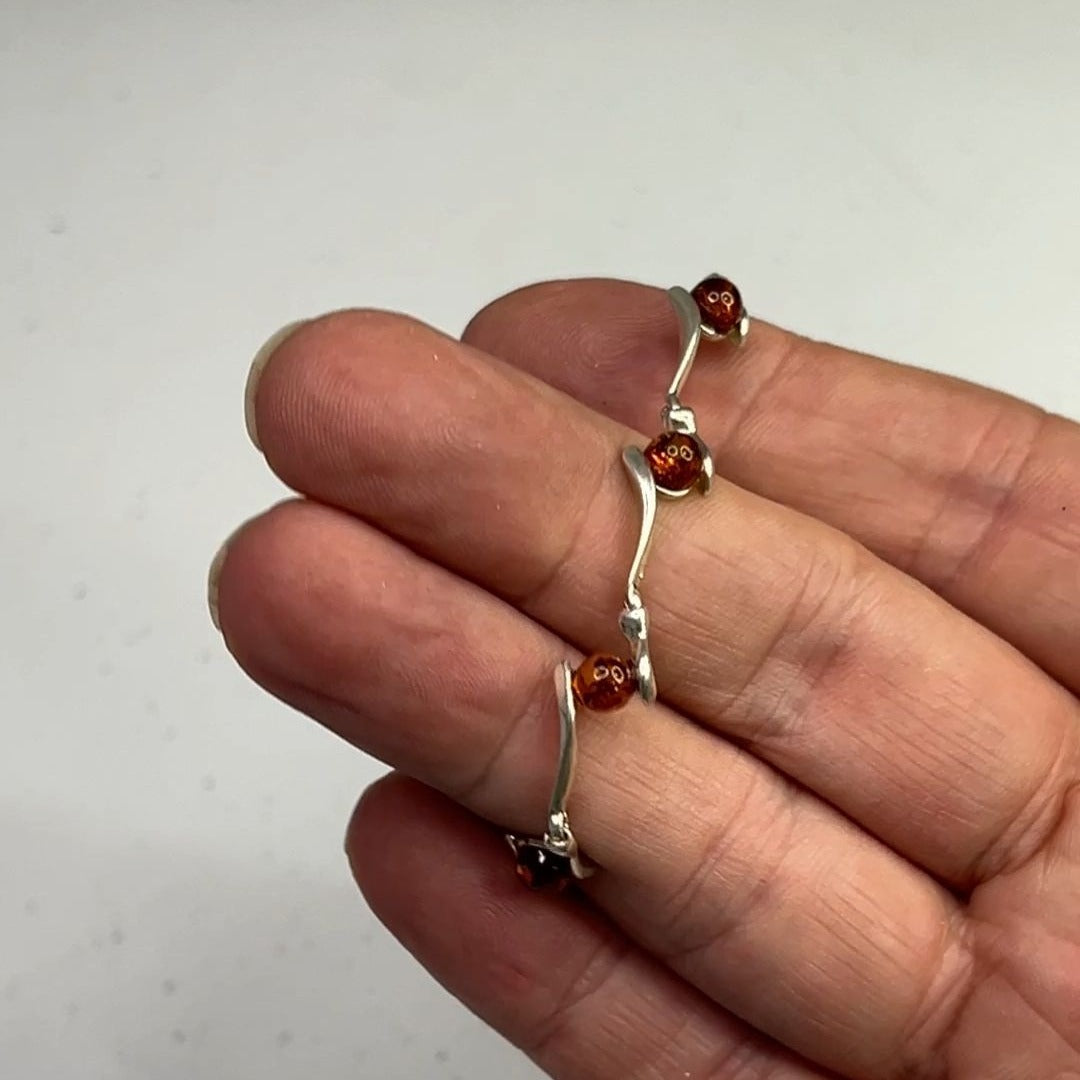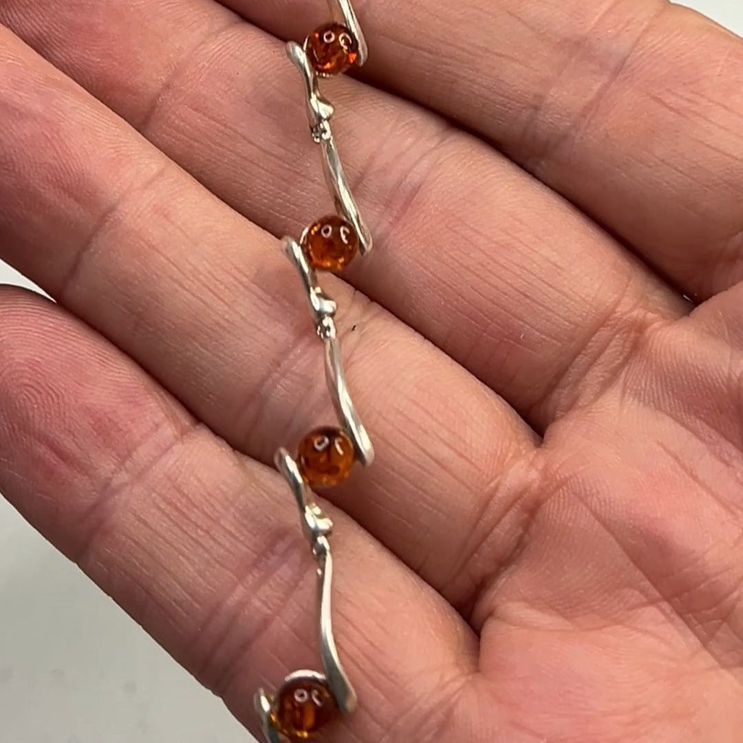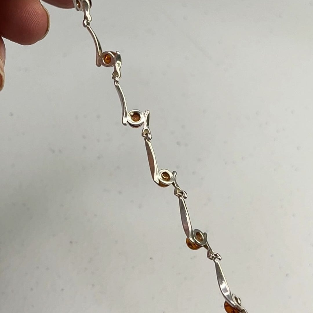 This delicate 7 stone amber set in 925 sterling silver bracelet showcases amber stones in a sterling silver 925 setting. Its petite size and refined design make it a sophisticated accessory.