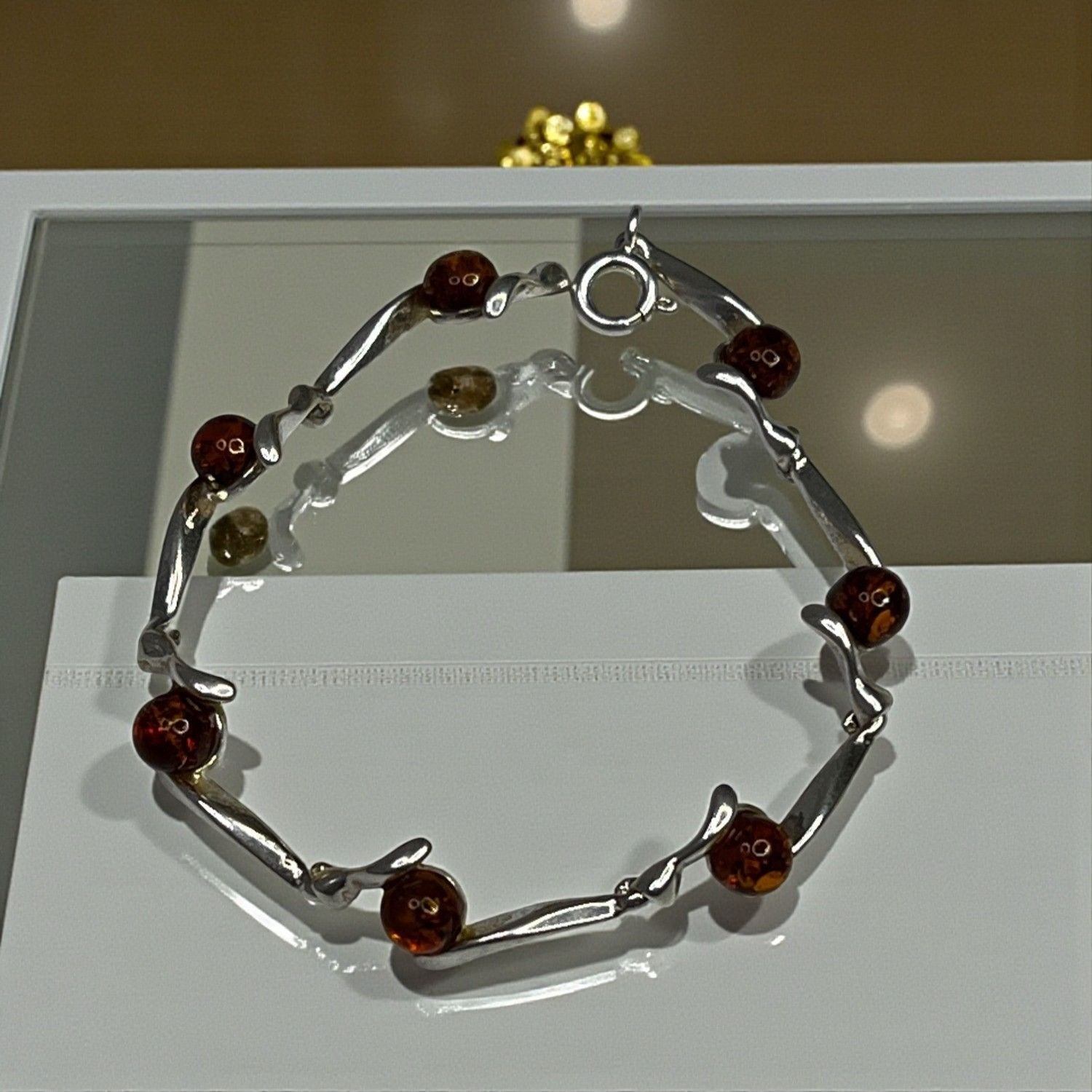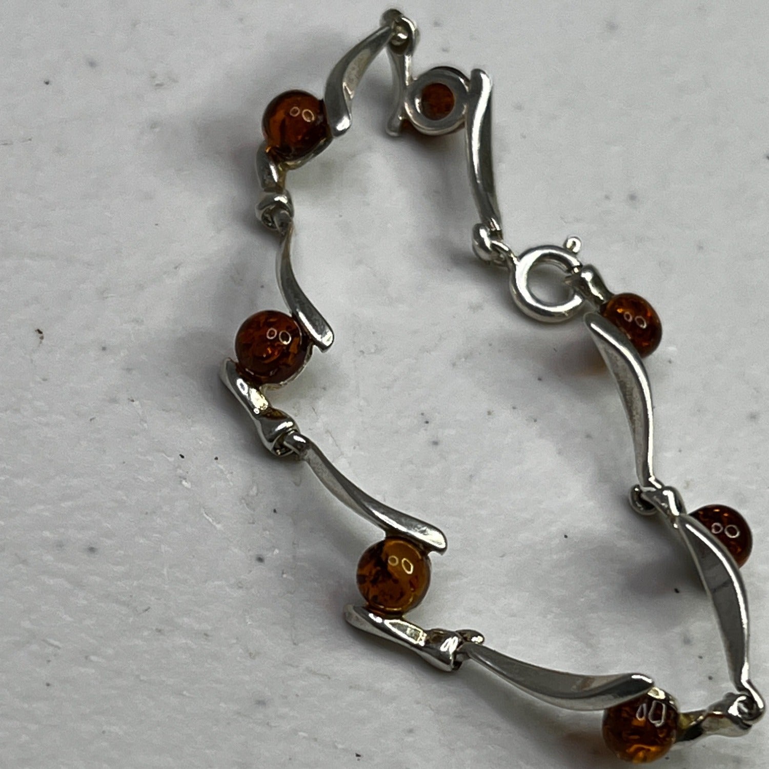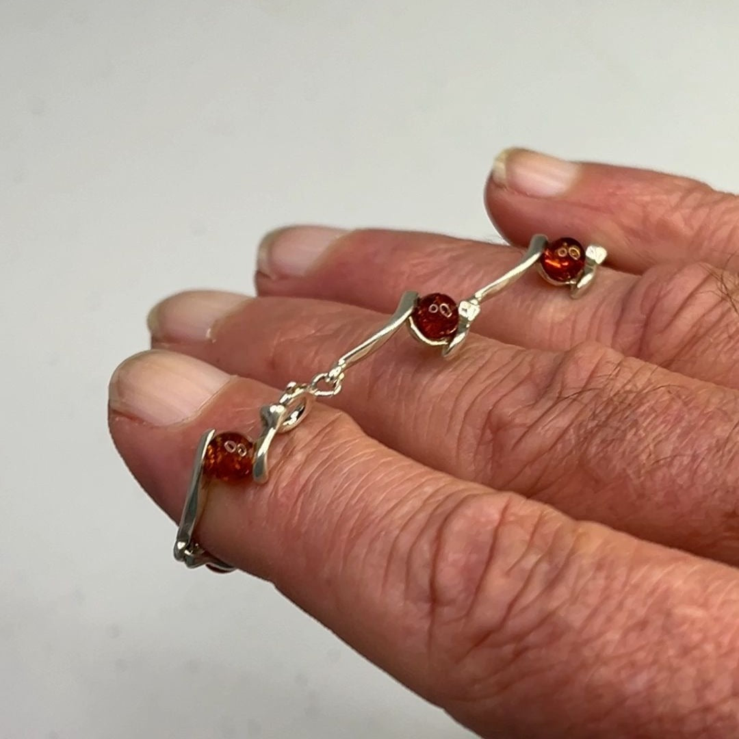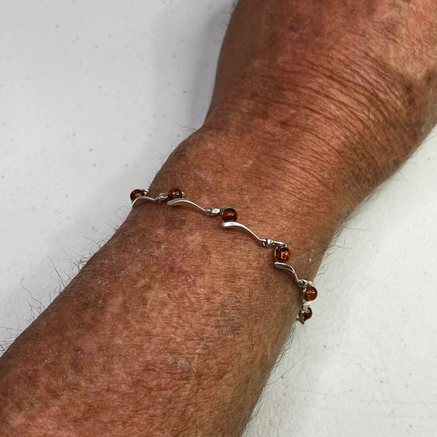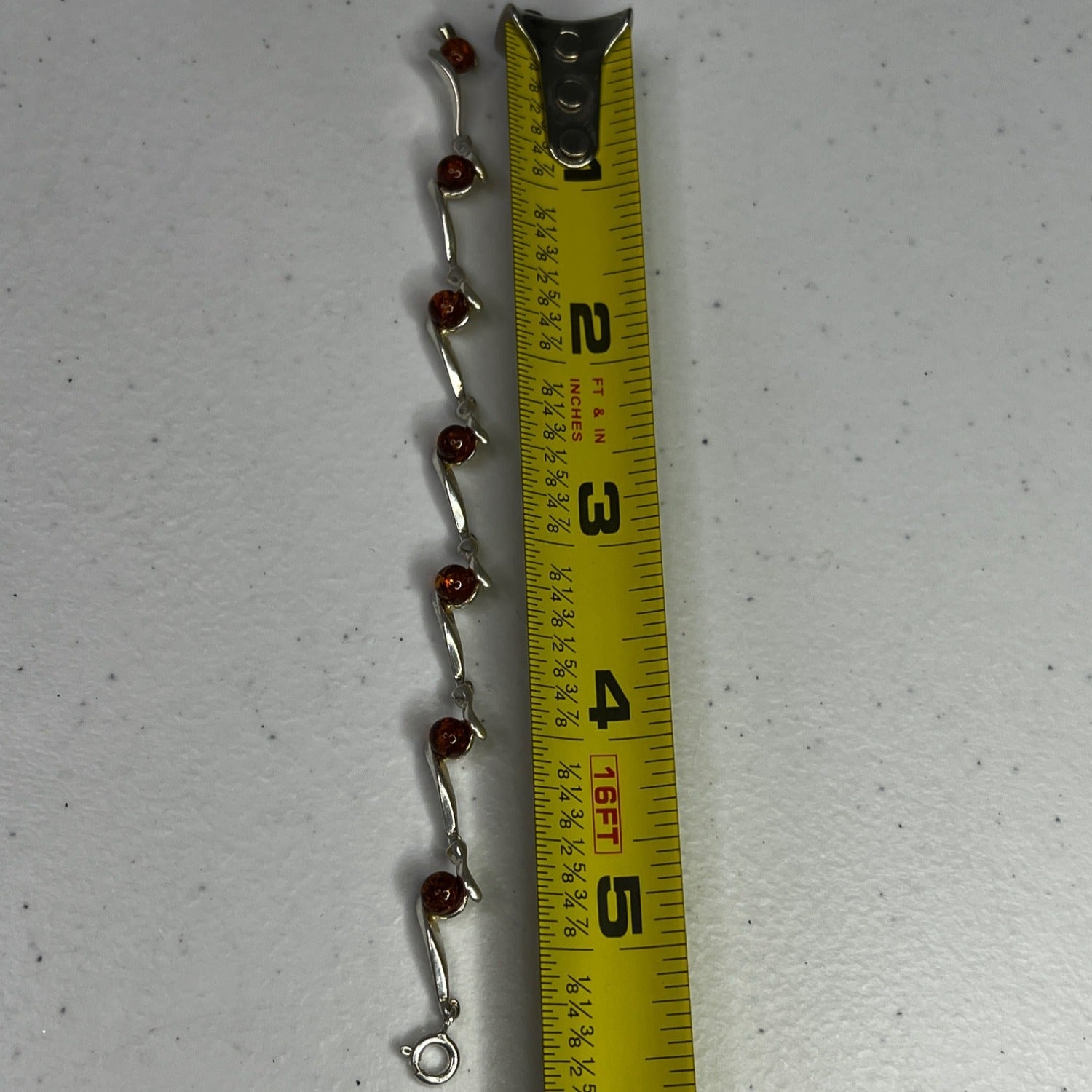 This delicate 7 stone amber set in 925 sterling silver bracelet showcases amber stones in a sterling silver 925 setting. Its petite size and refined design make it a sophisticated accessory.