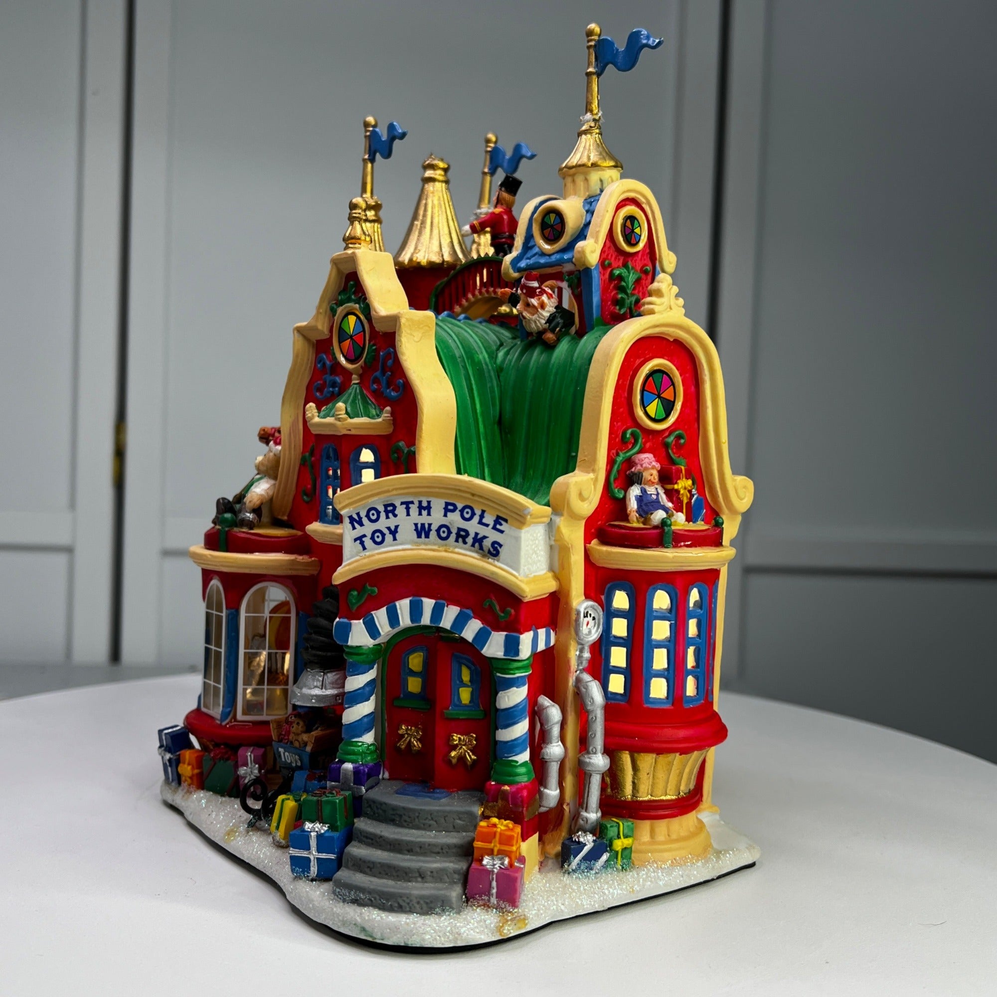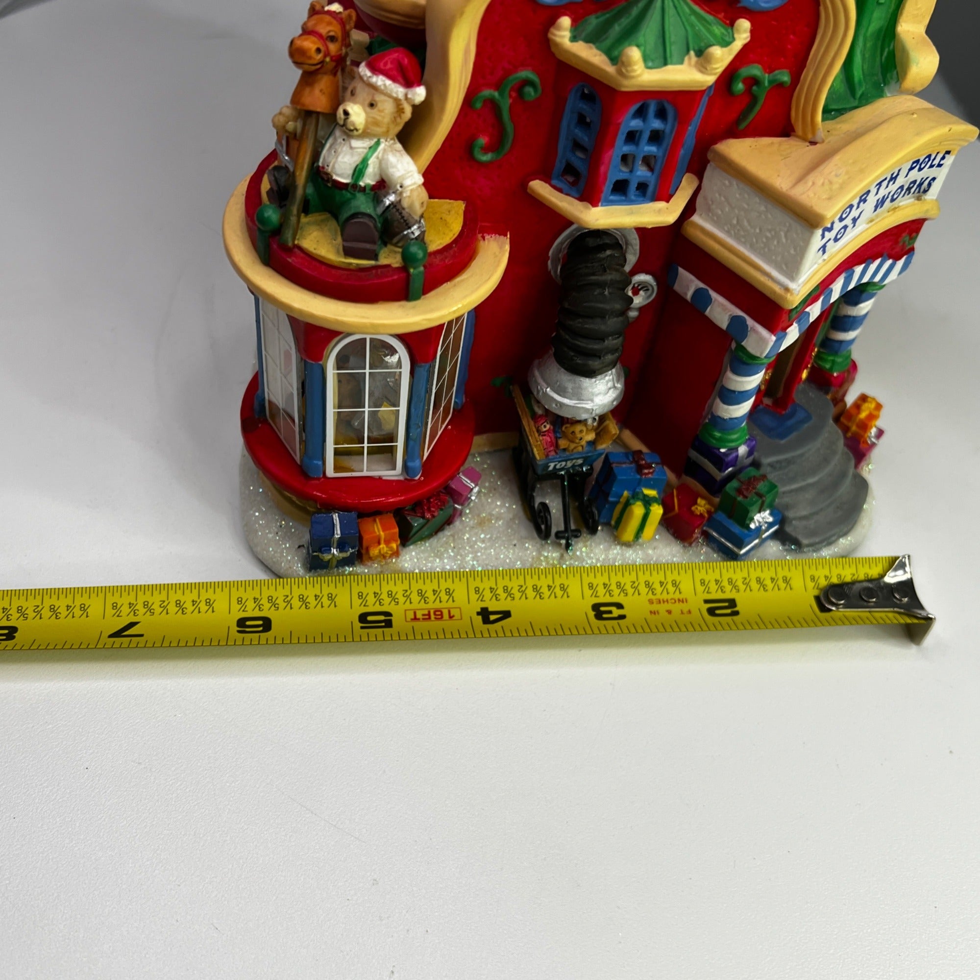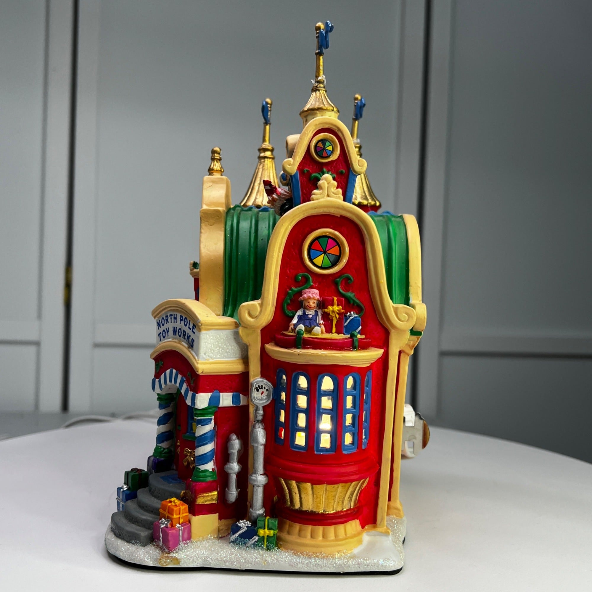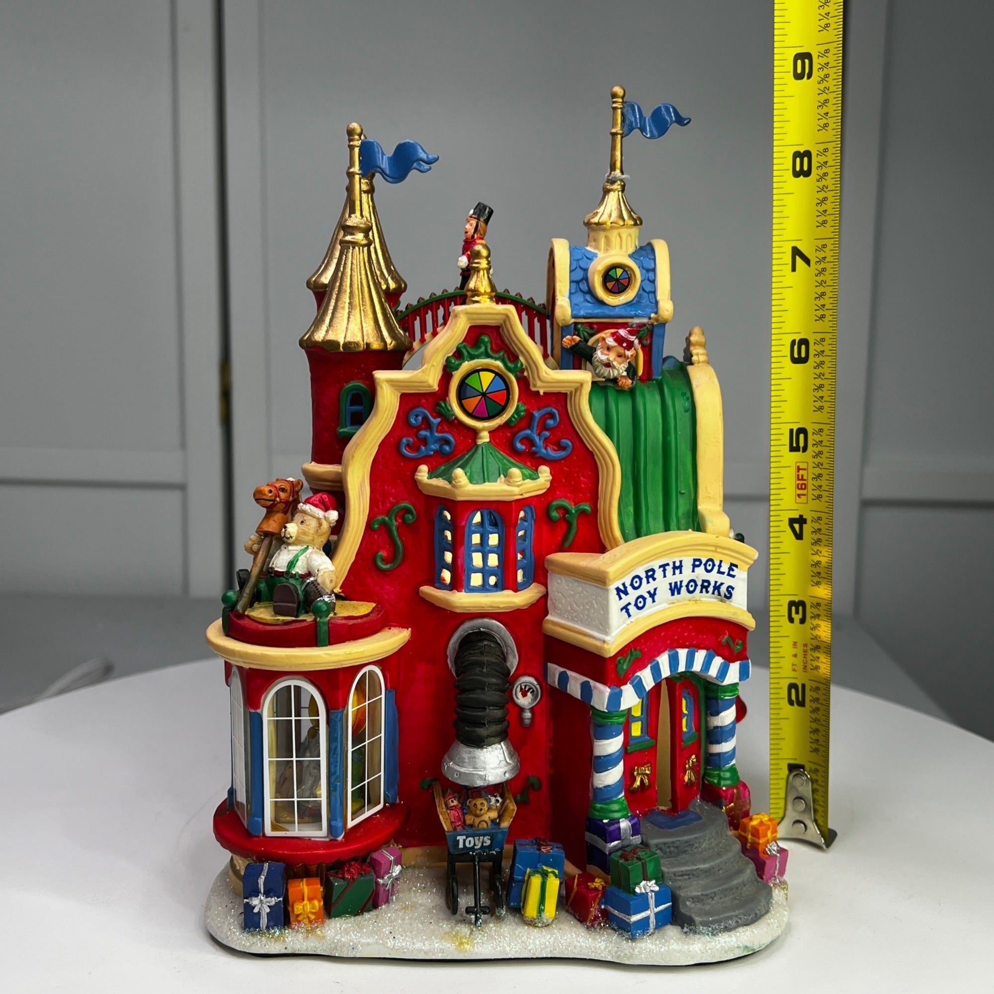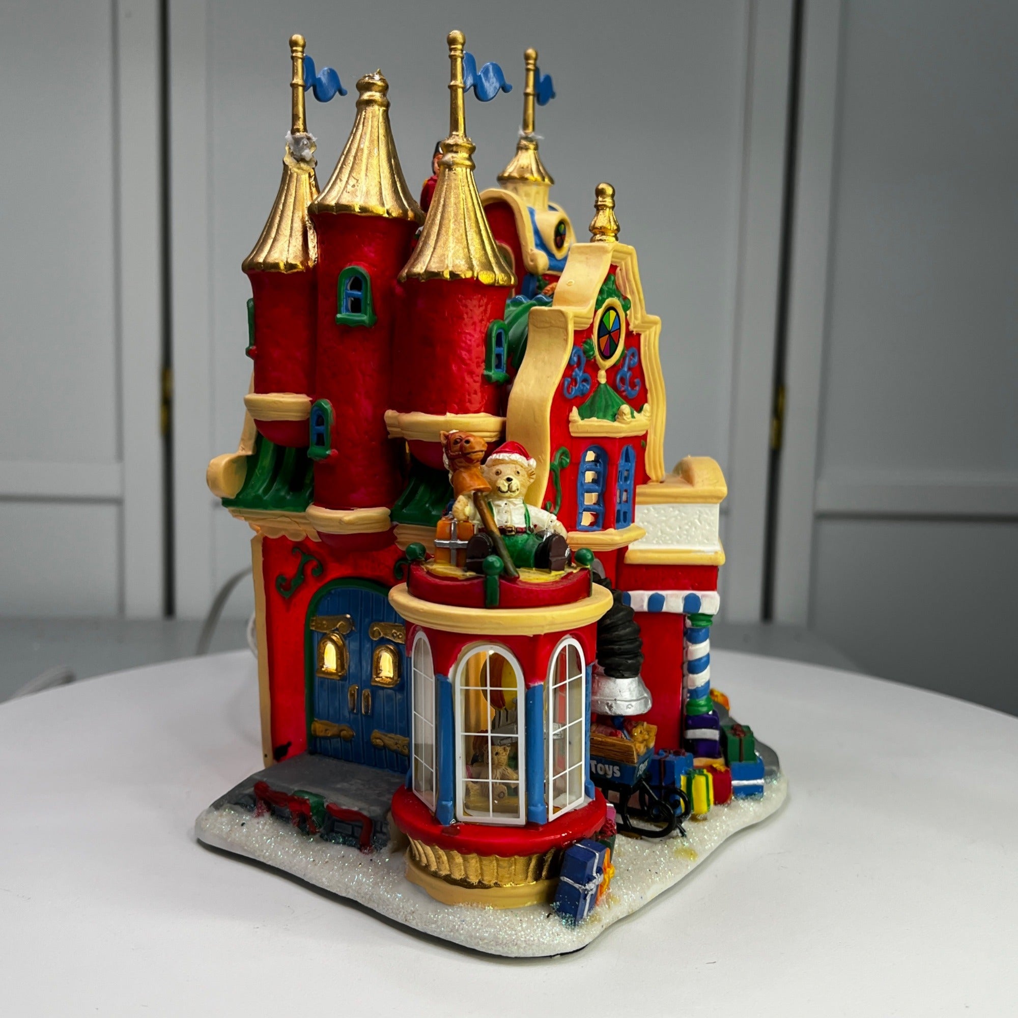 Lemax North Pole Toy Works, Carole Towne Christmas Village lighted building from 2006. Beautiful hand painted porcelain building. Endless amounts of intricate figures and miniature scenes to see and explore! There is an inside scene on the first floor display window with piles of dolls, bears, and airplanes, and numerous other elves and toy soldiers busy about in the toy factory, all the way up to the rooftop. The North Pole Toy Works looks beautiful when lit. Size: 8.7 × 6 × 5 in.