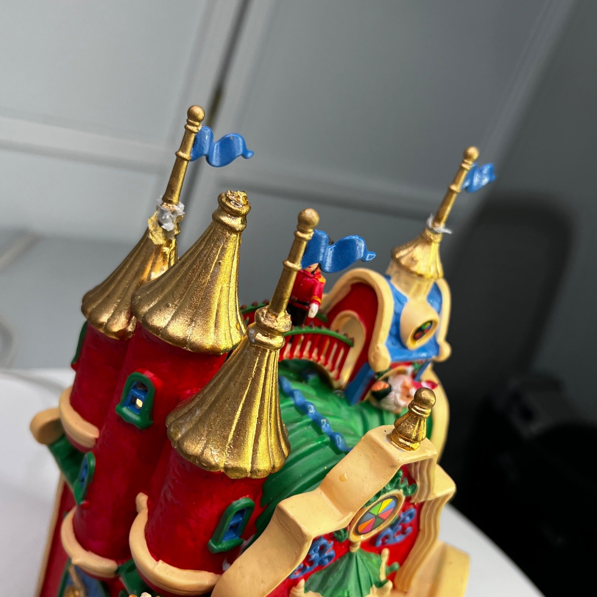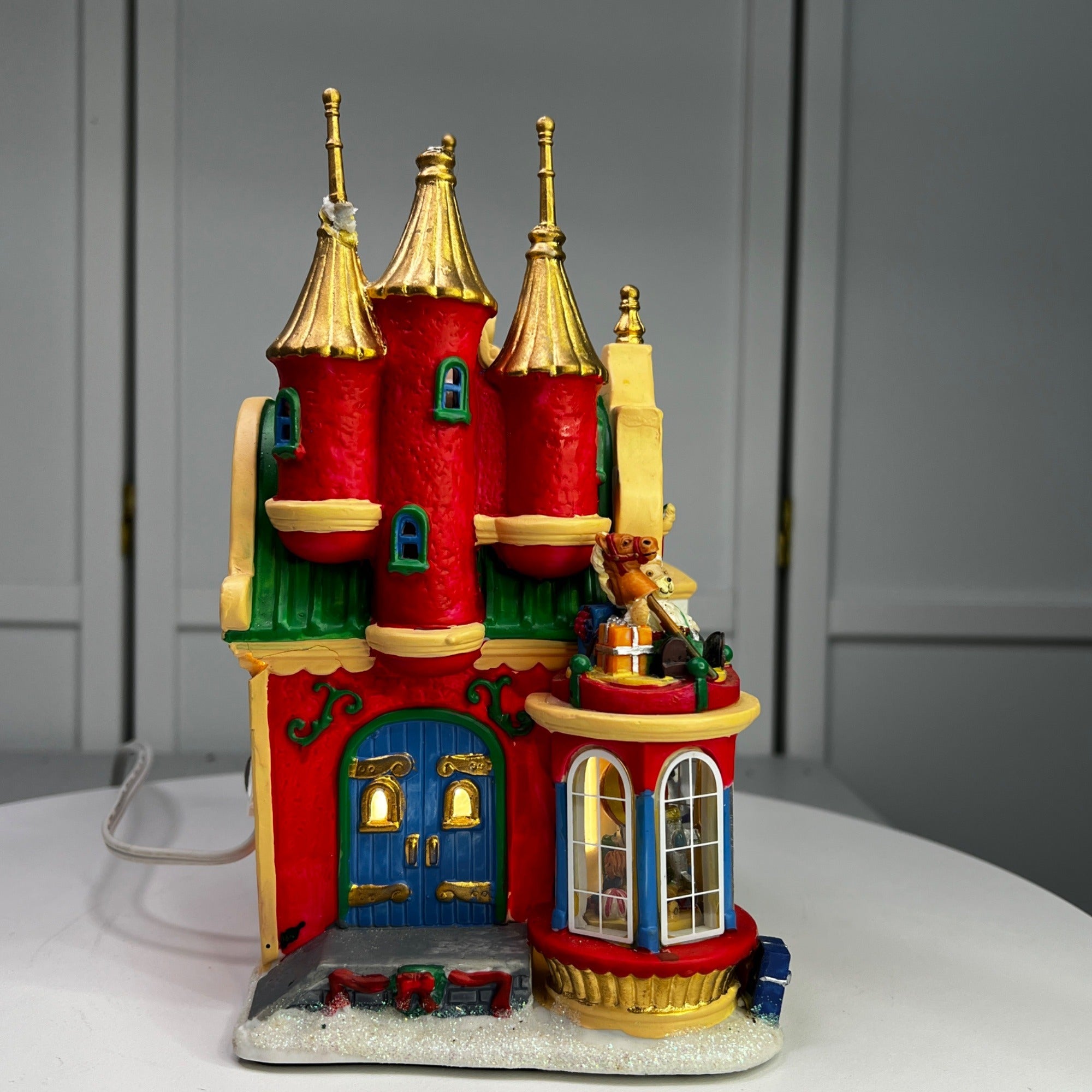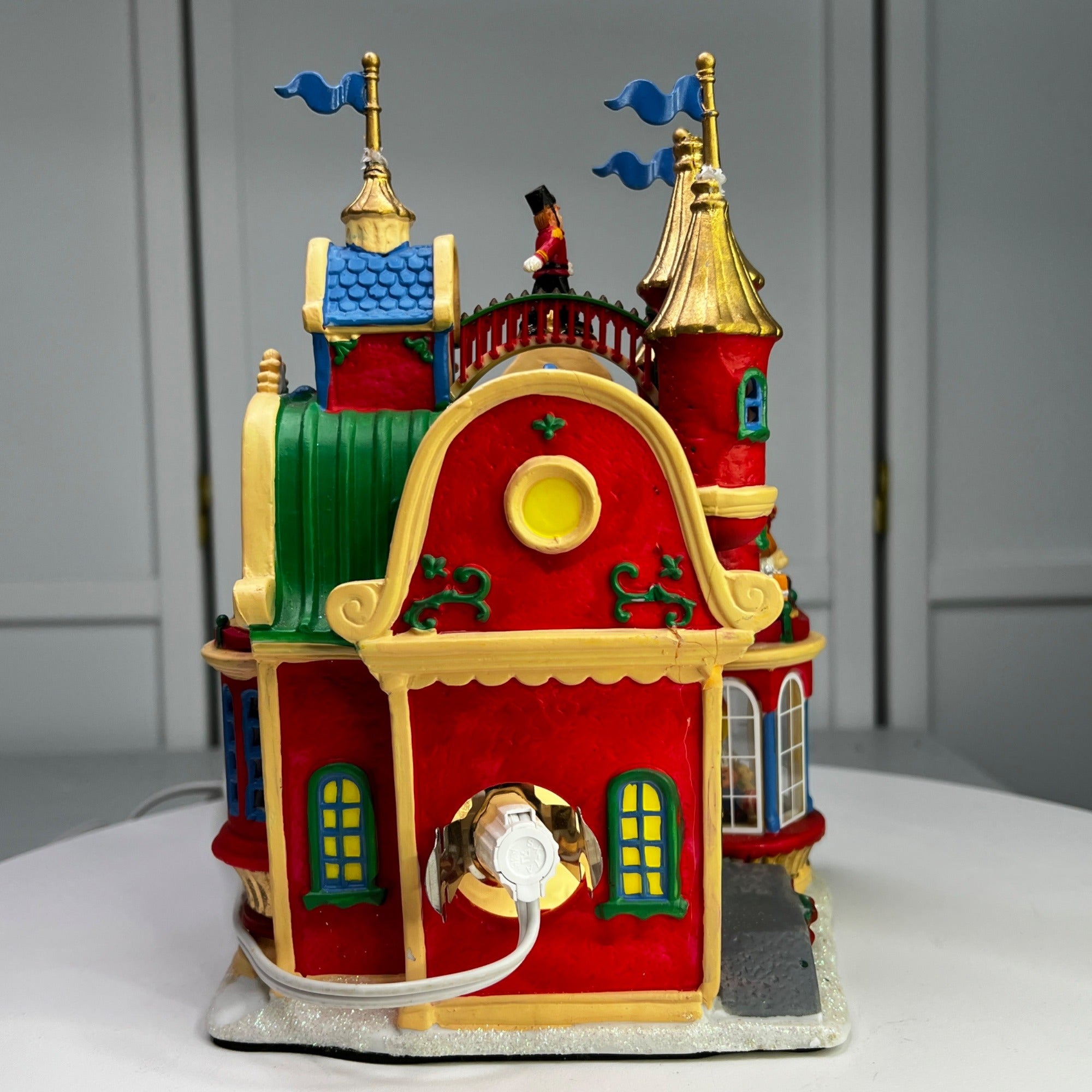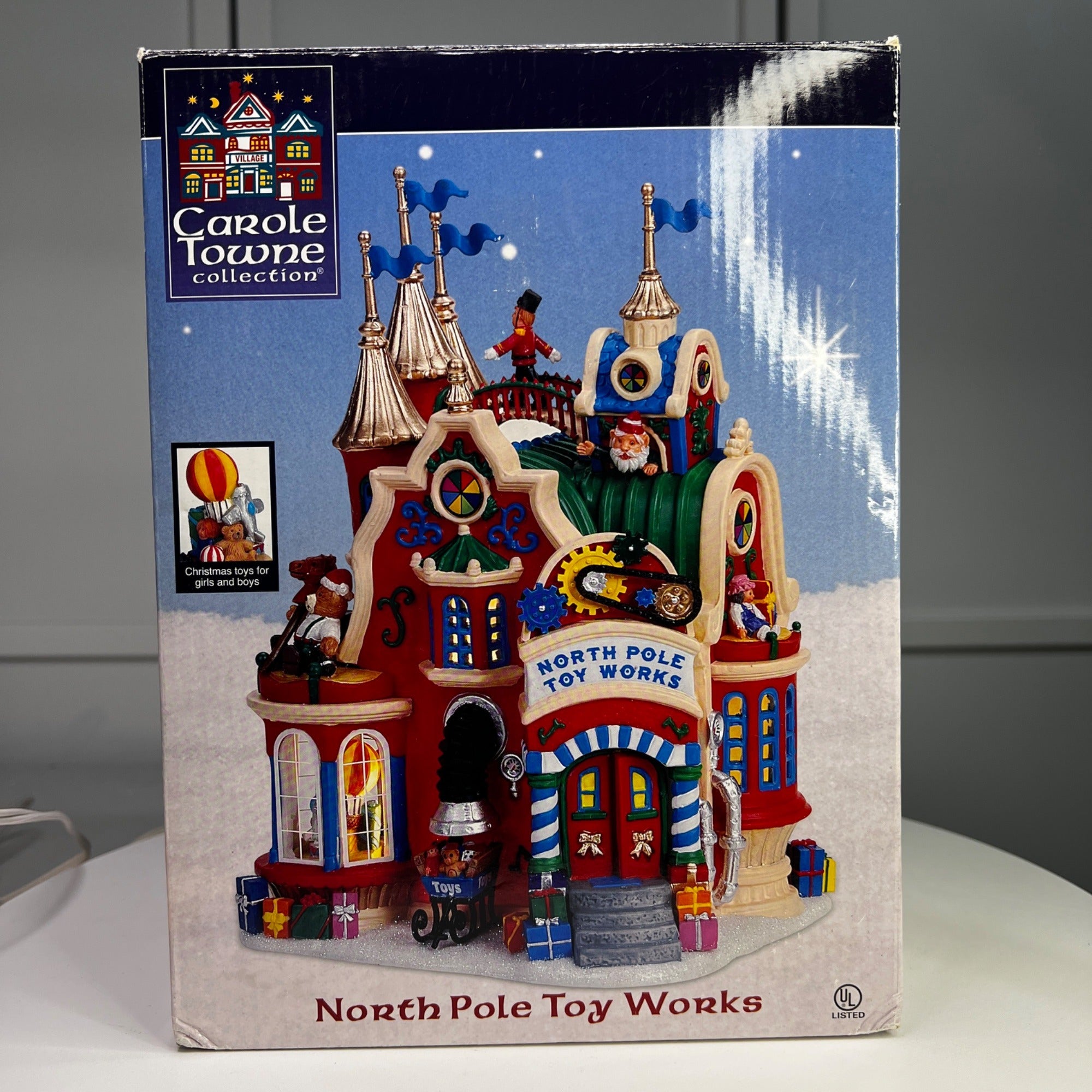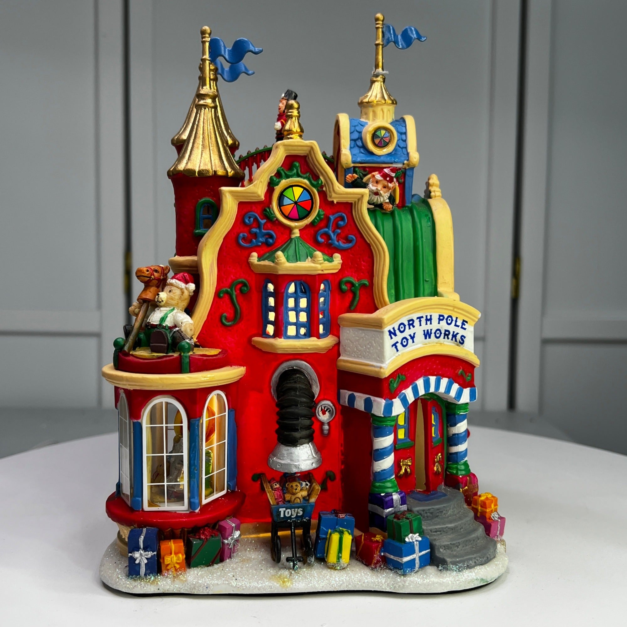 Lemax North Pole Toy Works, Carole Towne Christmas Village lighted building from 2006. Beautiful hand painted porcelain building. Endless amounts of intricate figures and miniature scenes to see and explore! There is an inside scene on the first floor display window with piles of dolls, bears, and airplanes, and numerous other elves and toy soldiers busy about in the toy factory, all the way up to the rooftop. The North Pole Toy Works looks beautiful when lit. Size: 8.7 × 6 × 5 in.