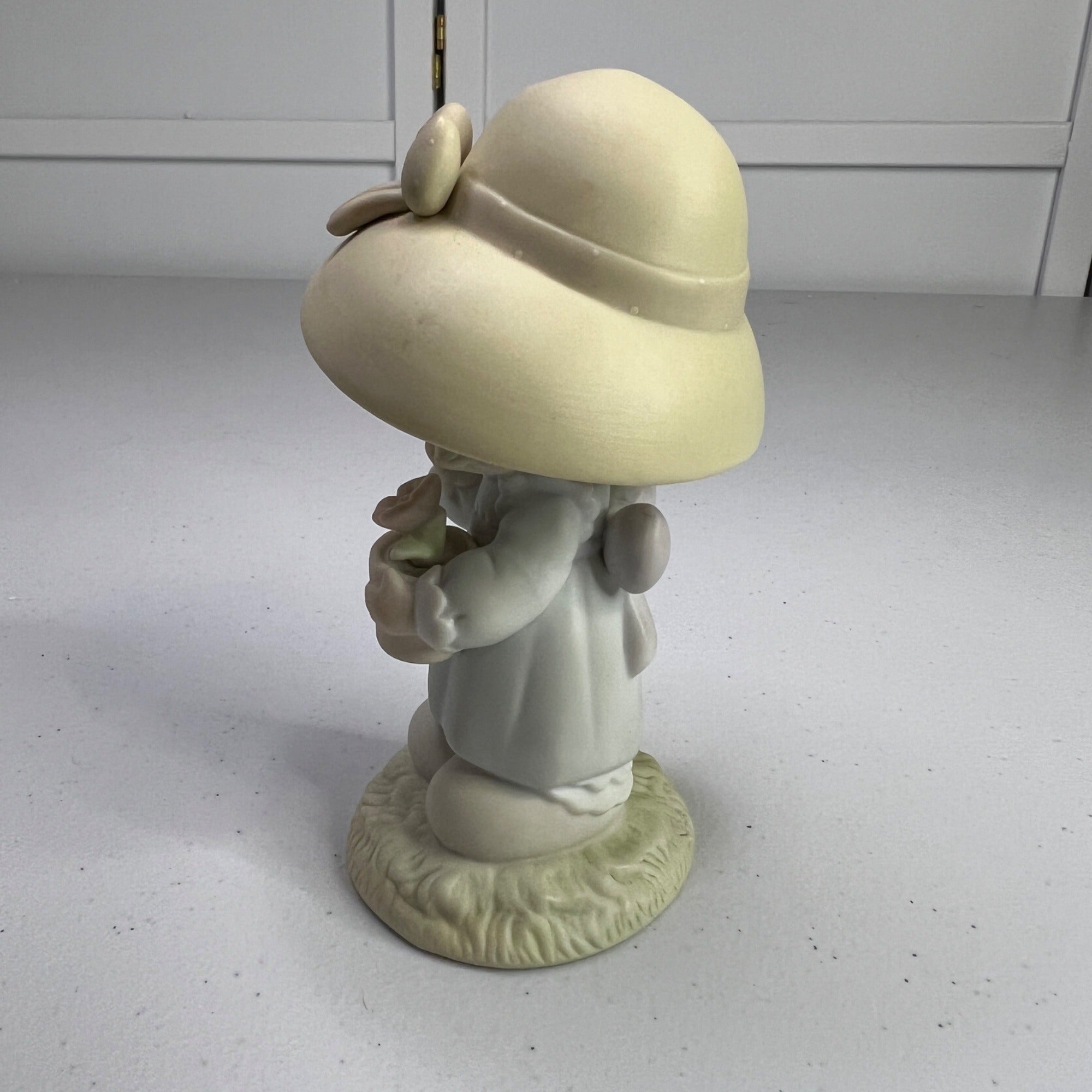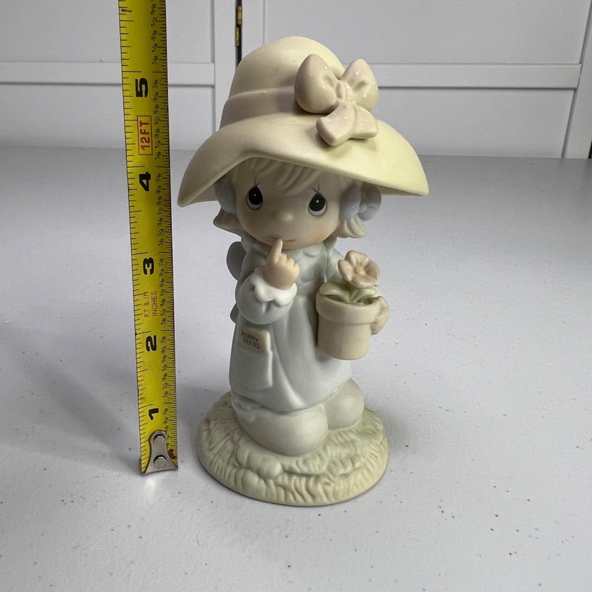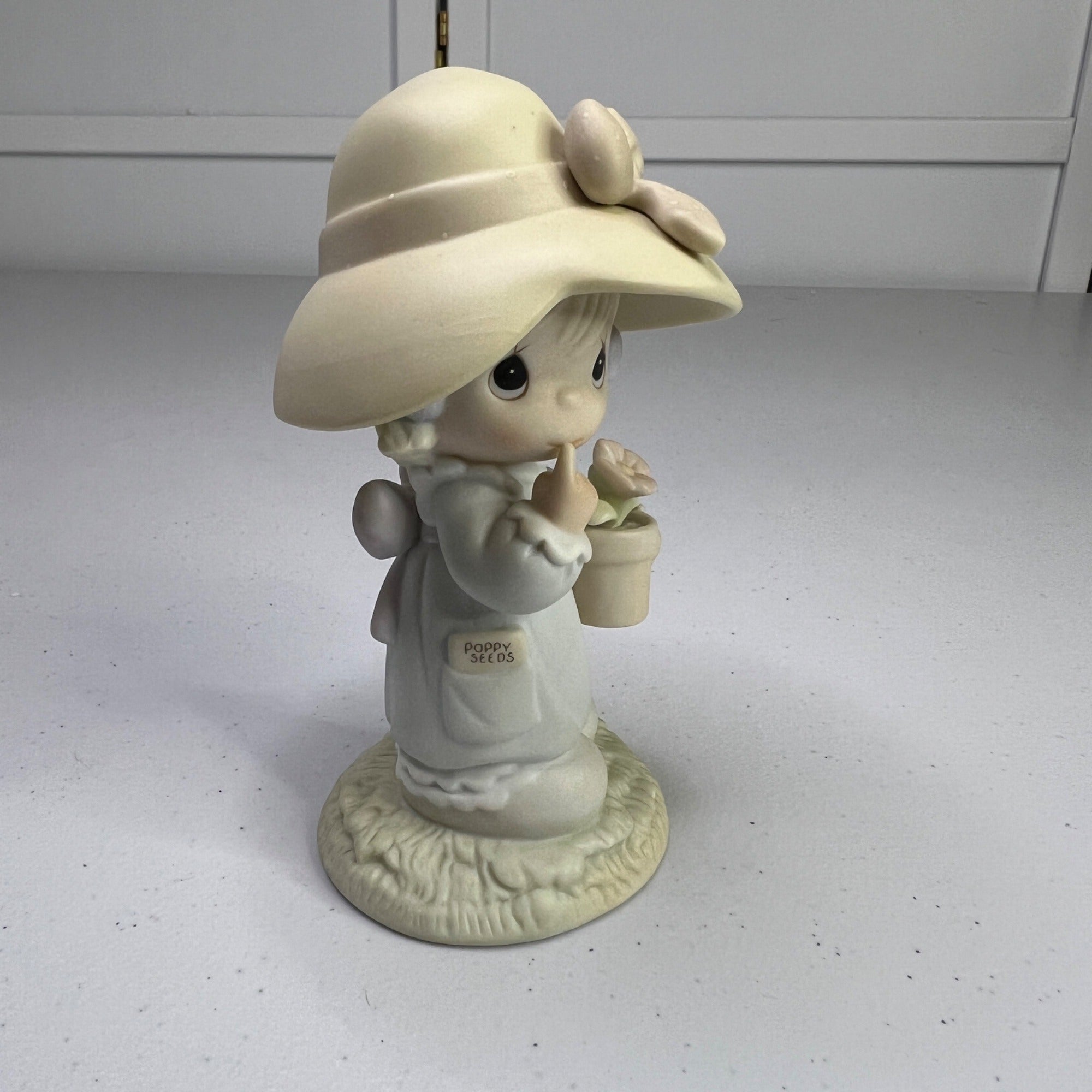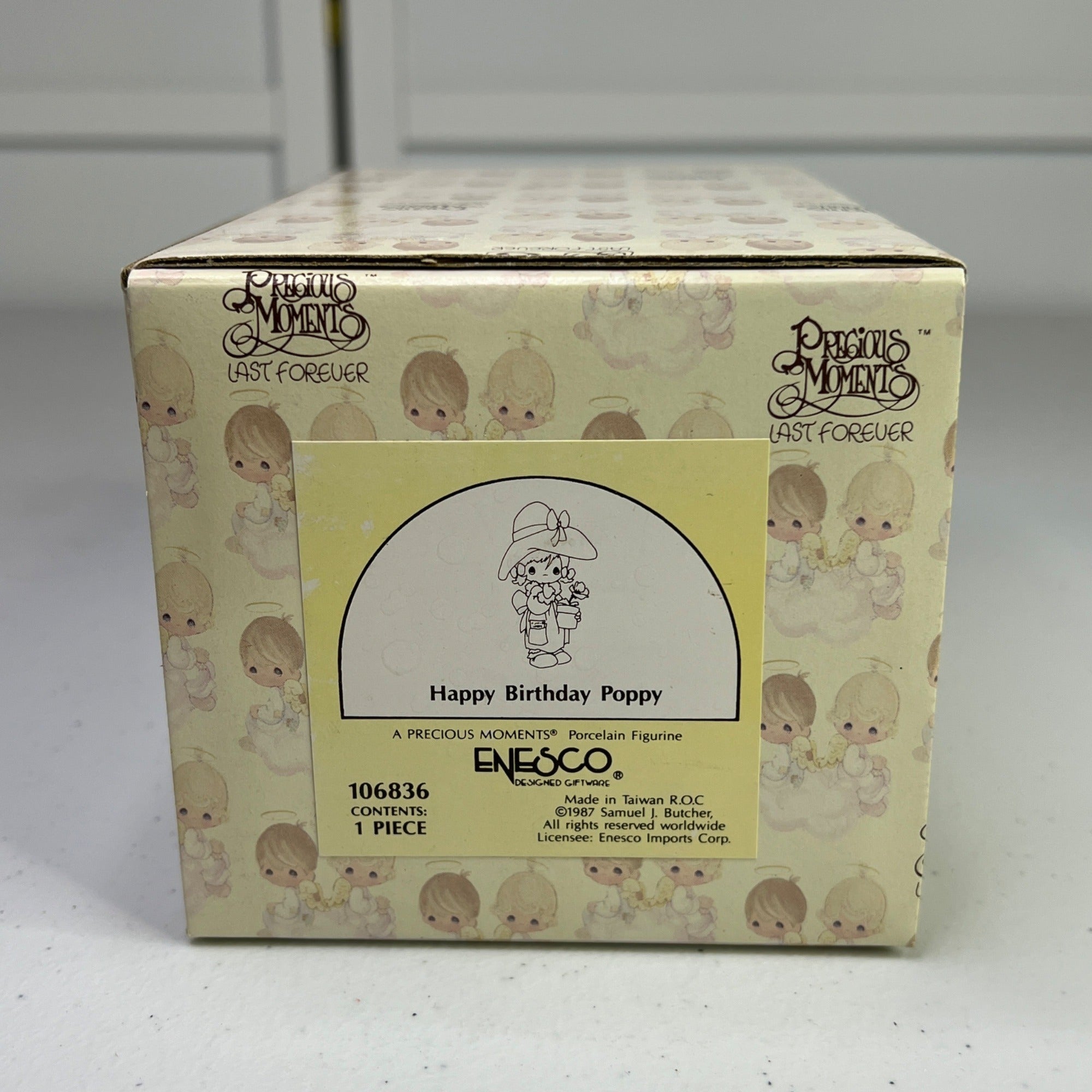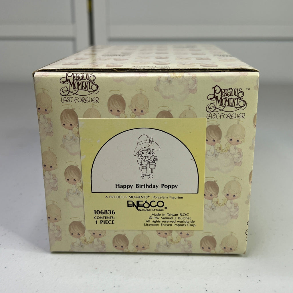 This porcelain figurine from the Precious Moments collection, titled "Happy Birthday Poppy," features intricate craftsmanship. Dated 1987, it includes the original box and accessories, ensuring its value as a collectible.