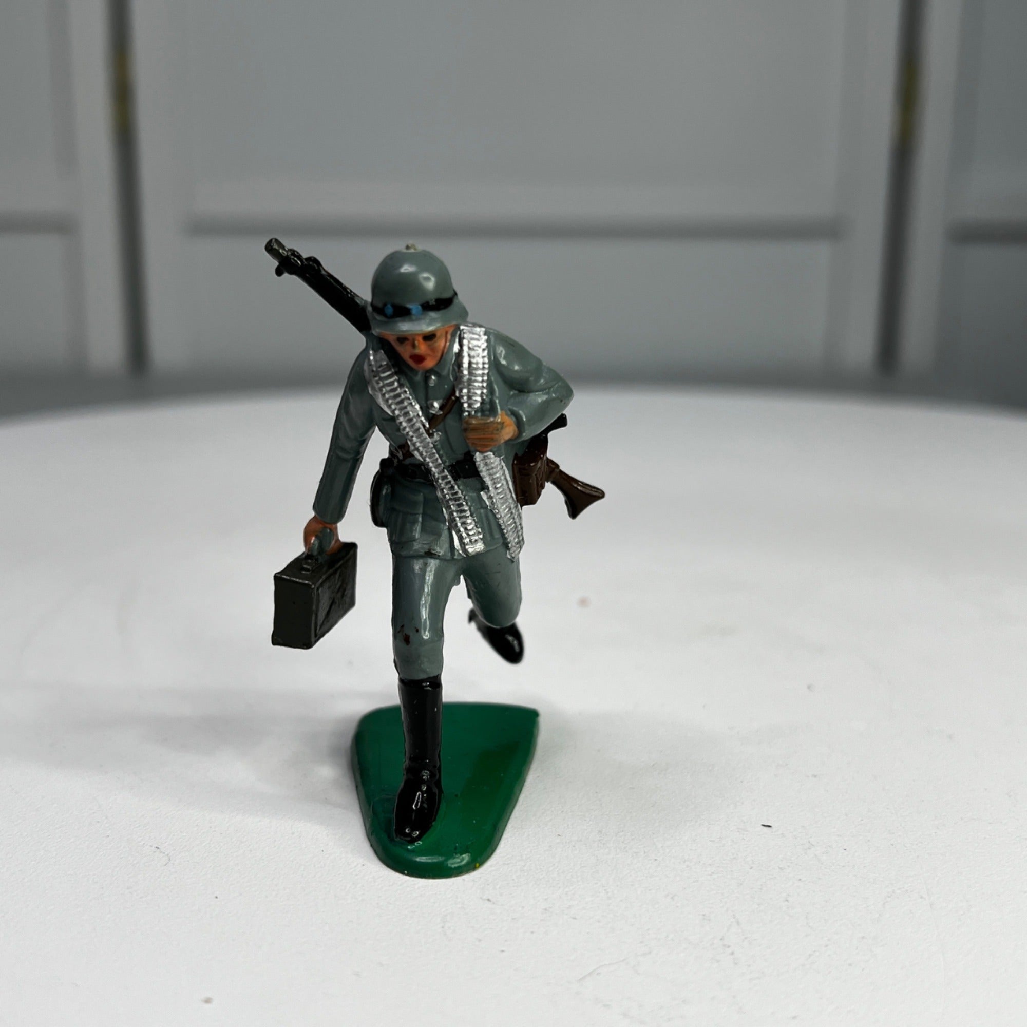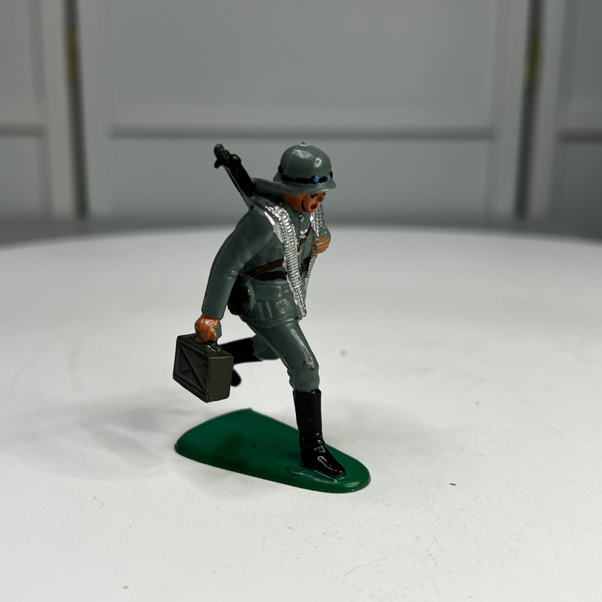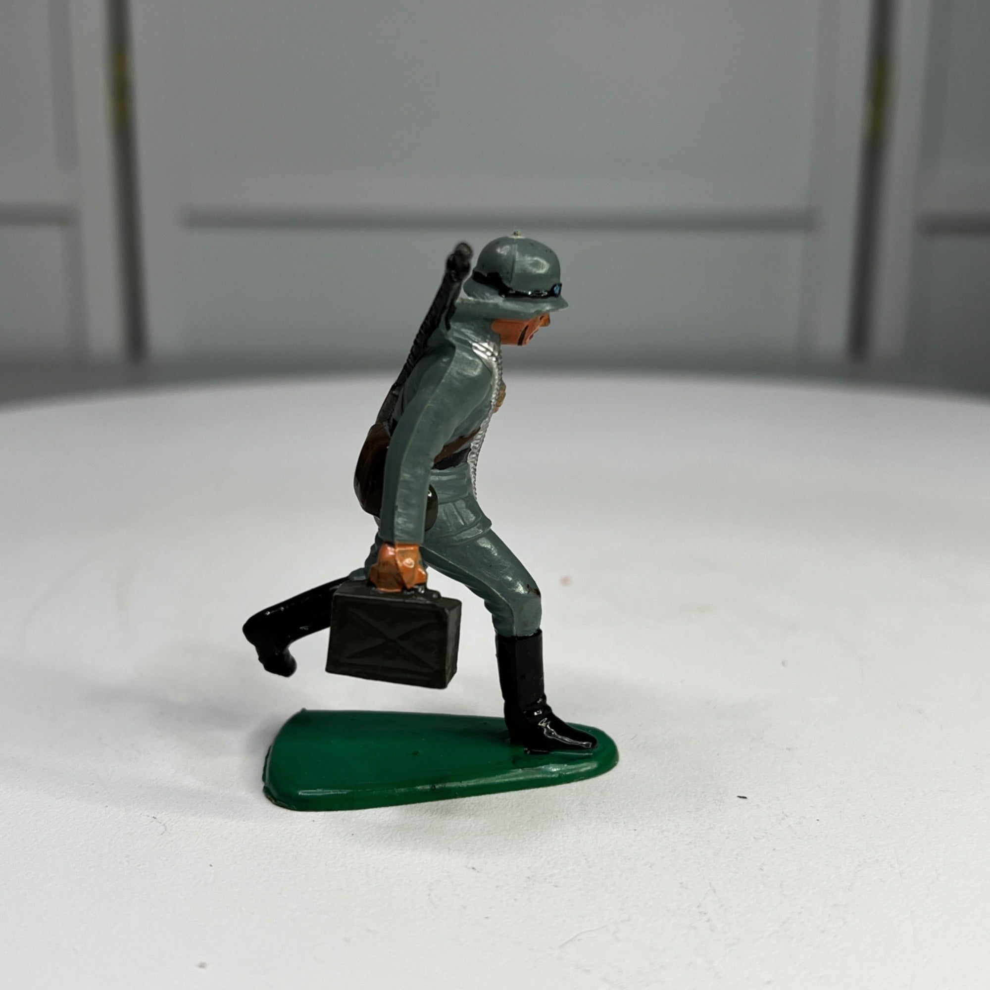 This vintage Marx Otto Schroeder WWII German soldier figure, part of the "Warriors of the World" series, captures the era's essence with detail. Crafted from durable plastic, it stands at 2 1/2 inches, showcasing the soldier in a dynamic running pose and carrying ammunition . Ideal for toy collectors and history enthusiasts.