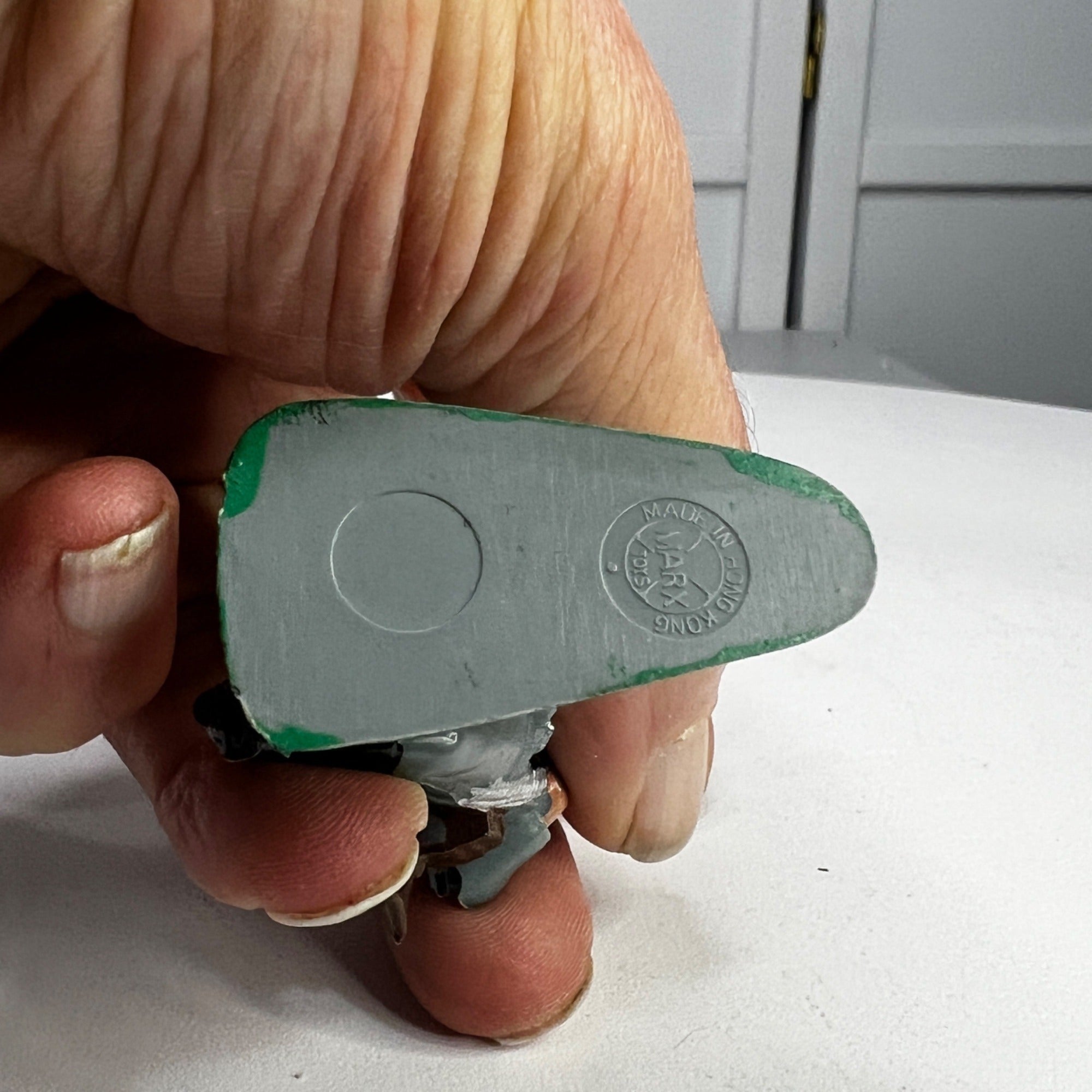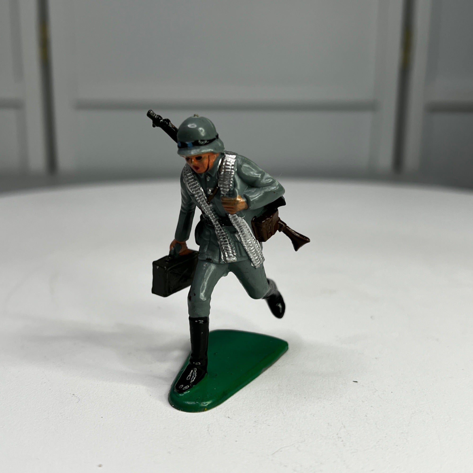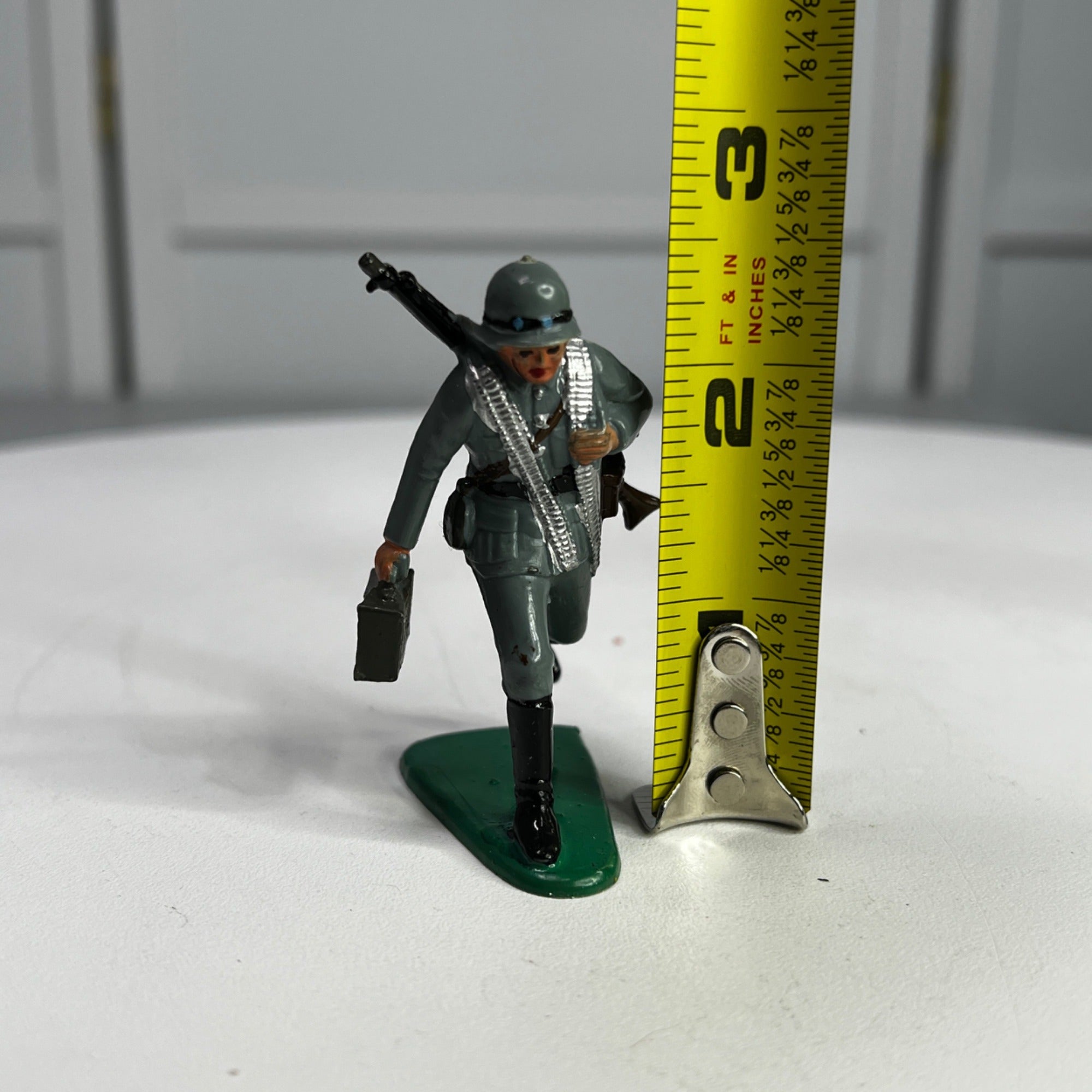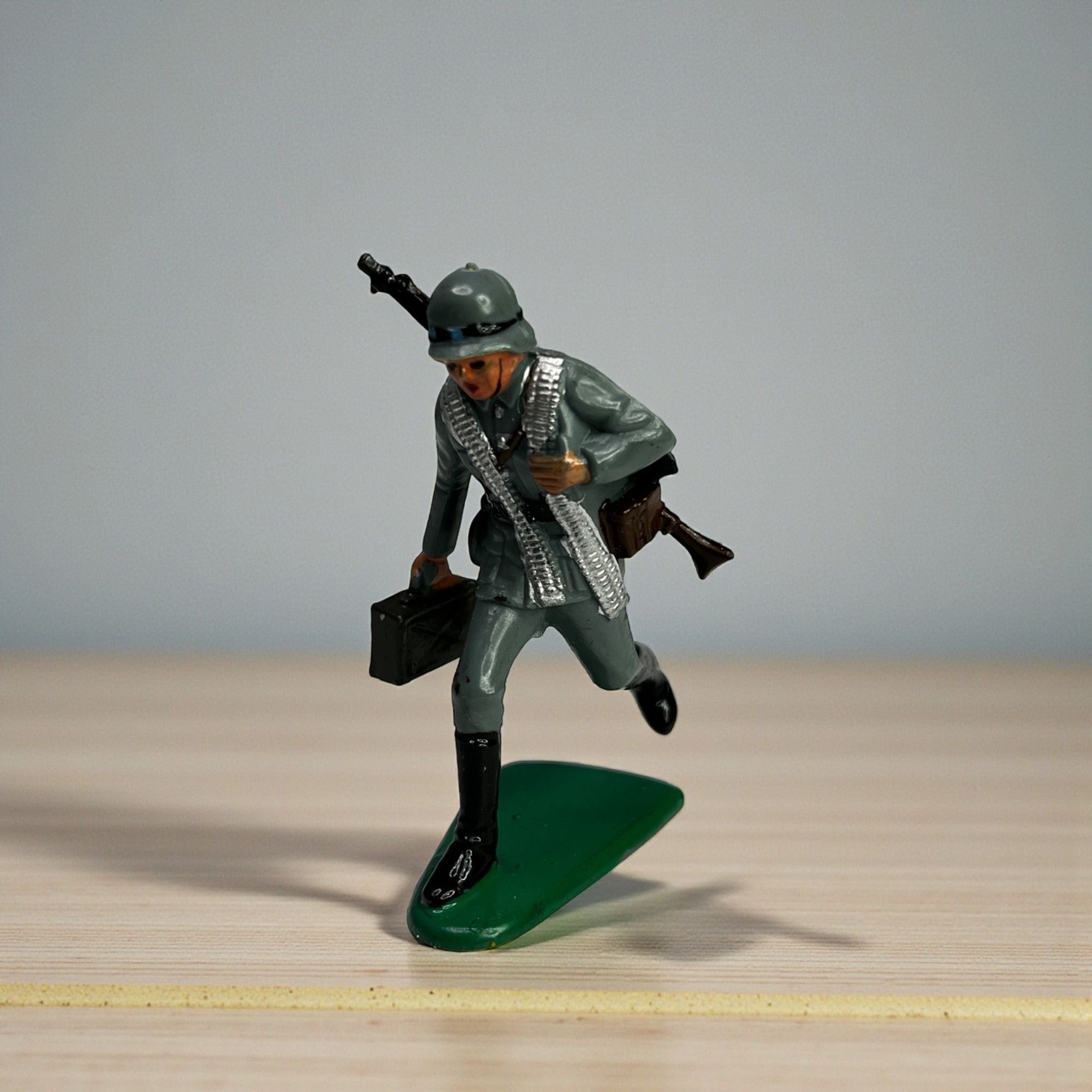 This vintage Marx Otto Schroeder WWII German soldier figure, part of the "Warriors of the World" series, captures the era's essence with detail. Crafted from durable plastic, it stands at 2 1/2 inches, showcasing the soldier in a dynamic running pose and carrying ammunition . Ideal for toy collectors and history enthusiasts.
