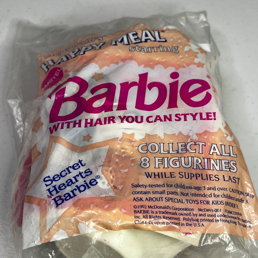 This collectible Secret Hearts Barbie toy from McDonald's 1992 Happy Meal series comes with hair you can style. It's an iconic piece for Barbie enthusiasts, offering nostalgic value and a touch of vintage charm. Ideal for collectors and those interested in classic toys.