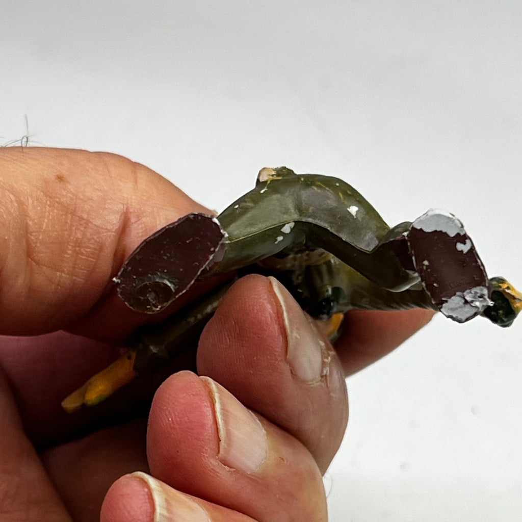 This vintage plastic soldier figure, depicting a World War II American soldier possibly from the Pacific Theater, serves as a nostalgic piece for collectors of military memorabilia. Crafted with attention to detail, its olive green and brown attire captures the essence of a bygone era in toy manufacturing. A piece that evokes the past, ready to enhance any historical toy collection.