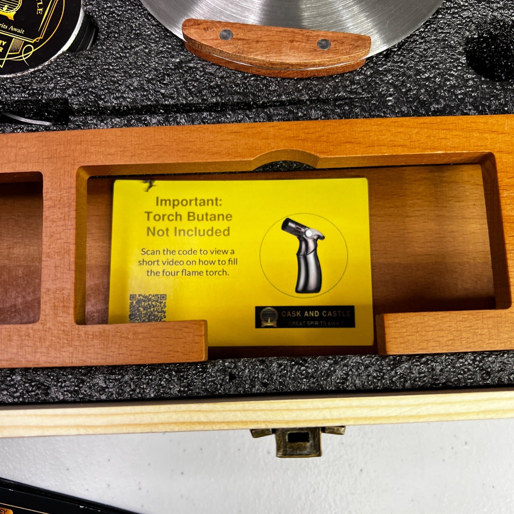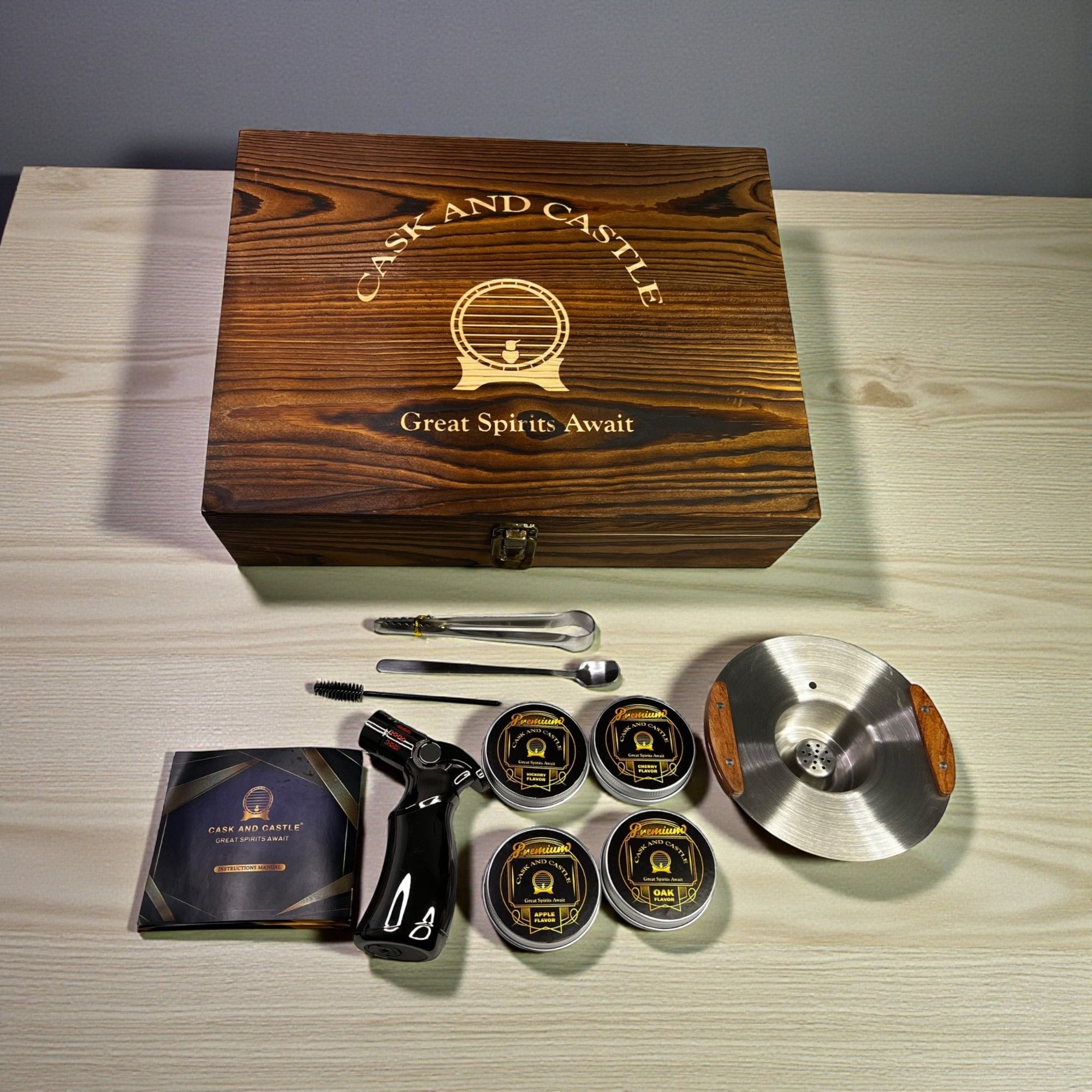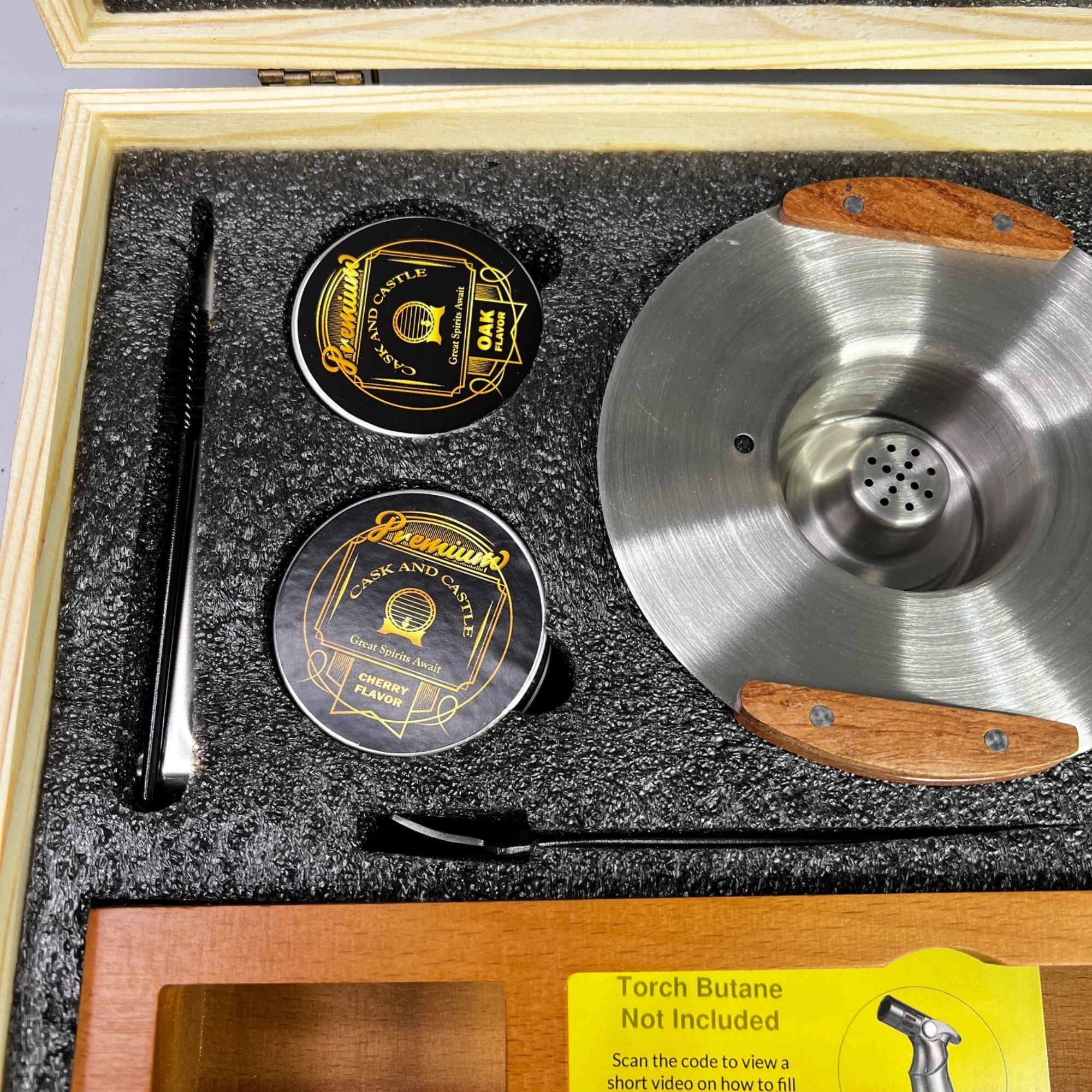 Elevate whiskey enjoyment with this smoker kit. Includes wood chips, tools, and a stylish wood storage box for a sophisticated drinking experience. The smoker has never been used.