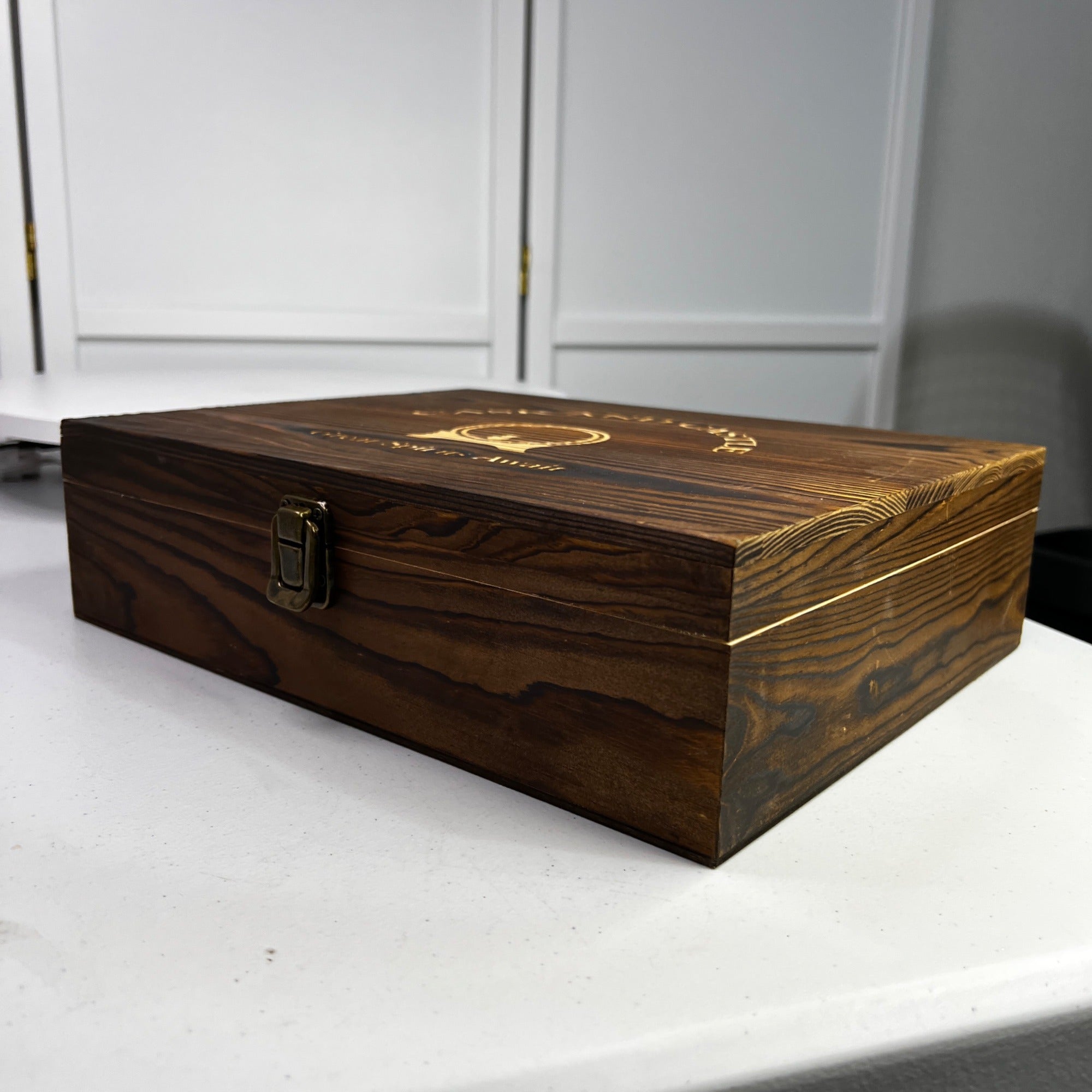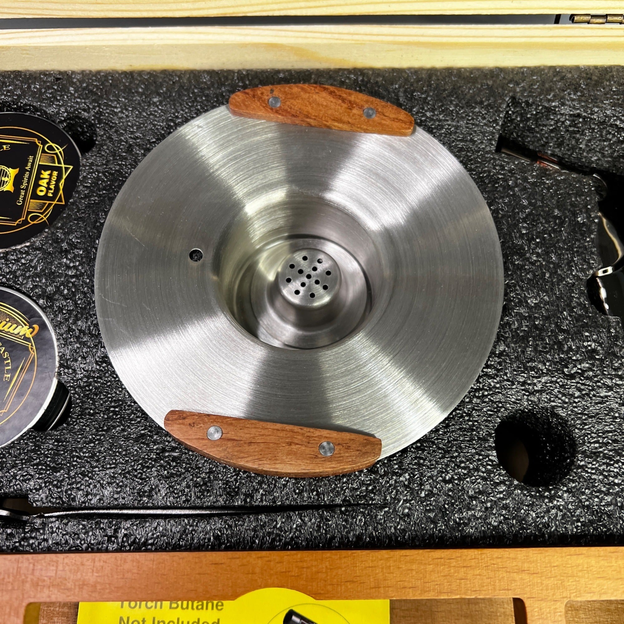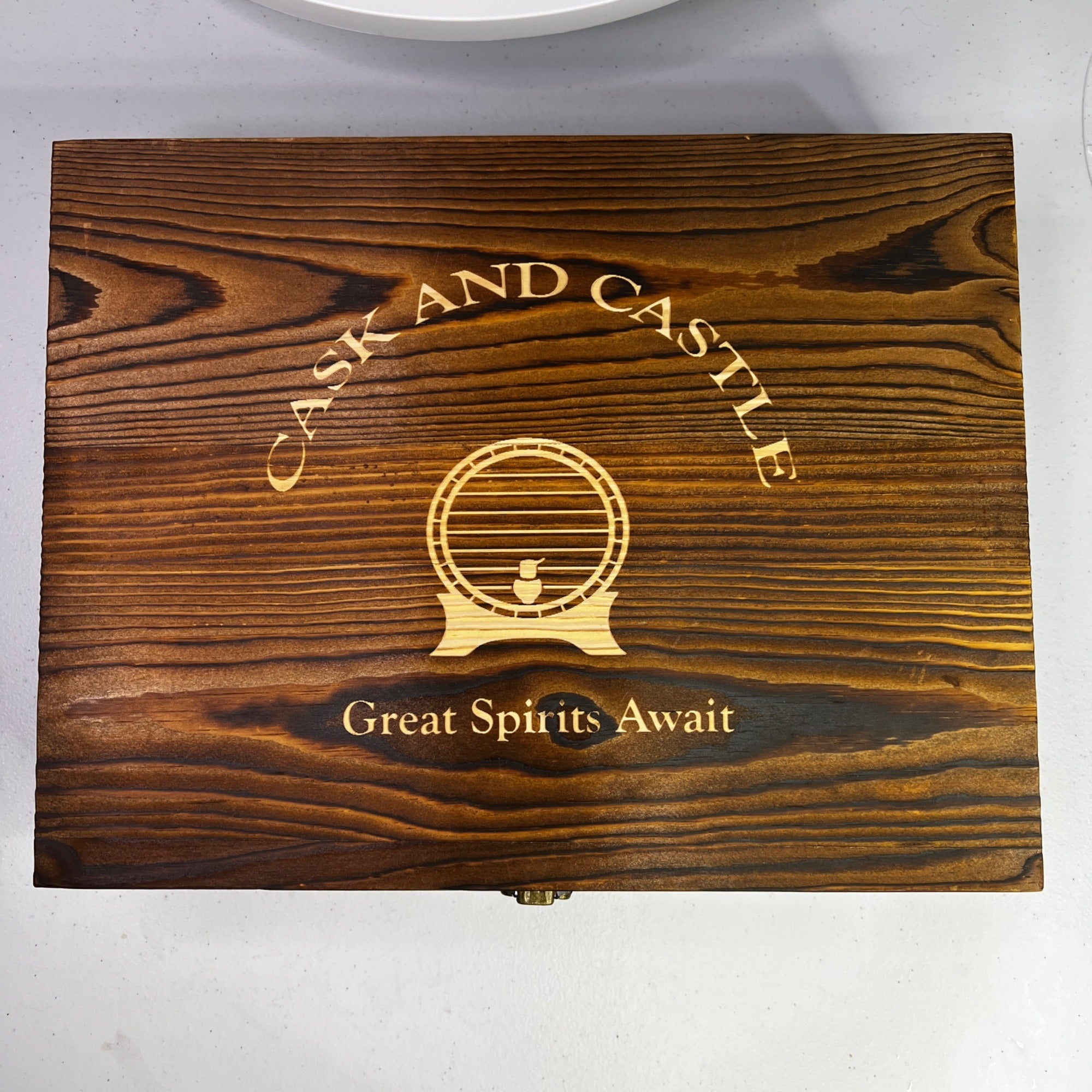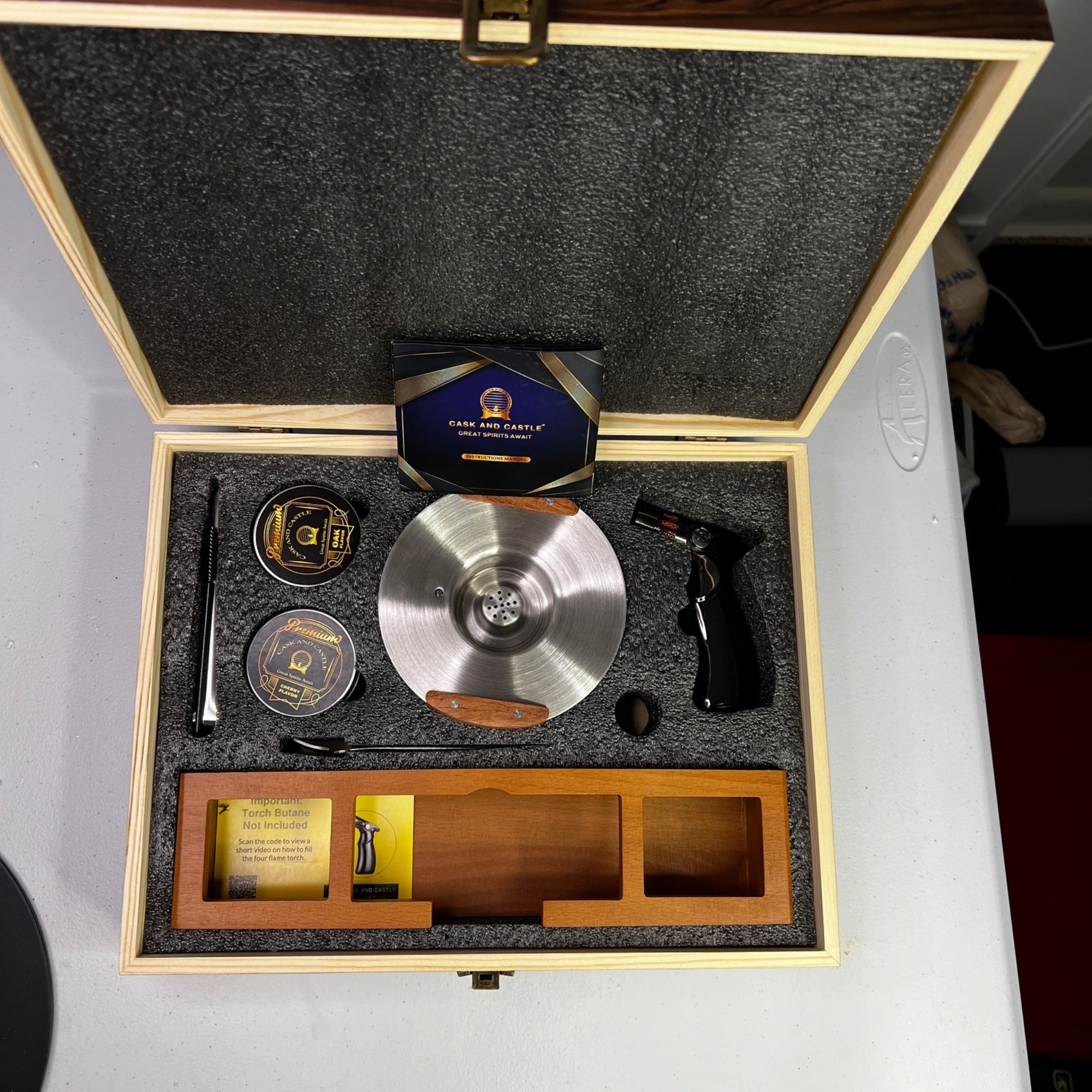 Elevate whiskey enjoyment with this smoker kit. Includes wood chips, tools, and a stylish wood storage box for a sophisticated drinking experience. The smoker has never been used.