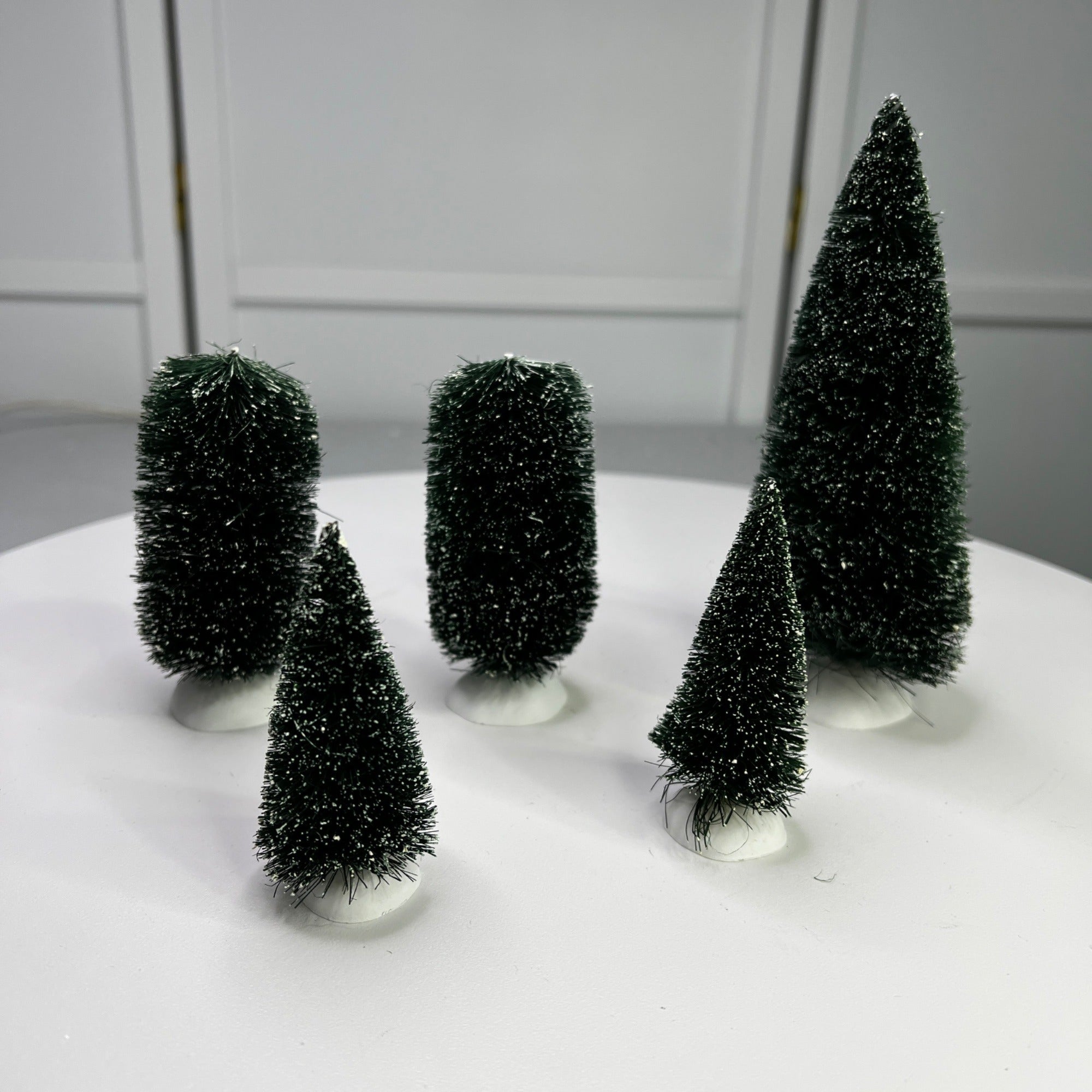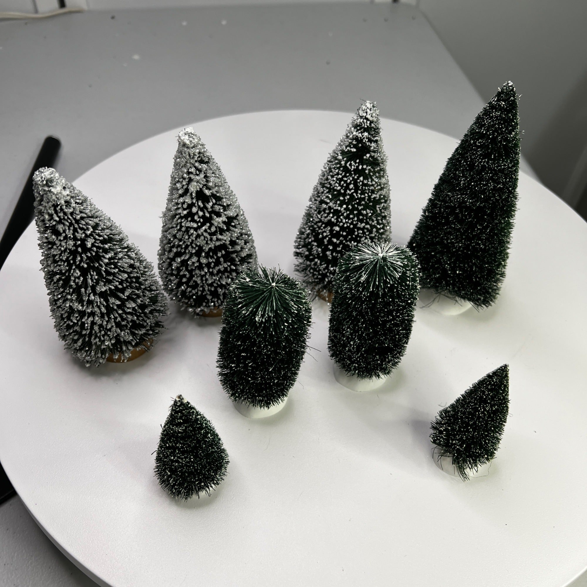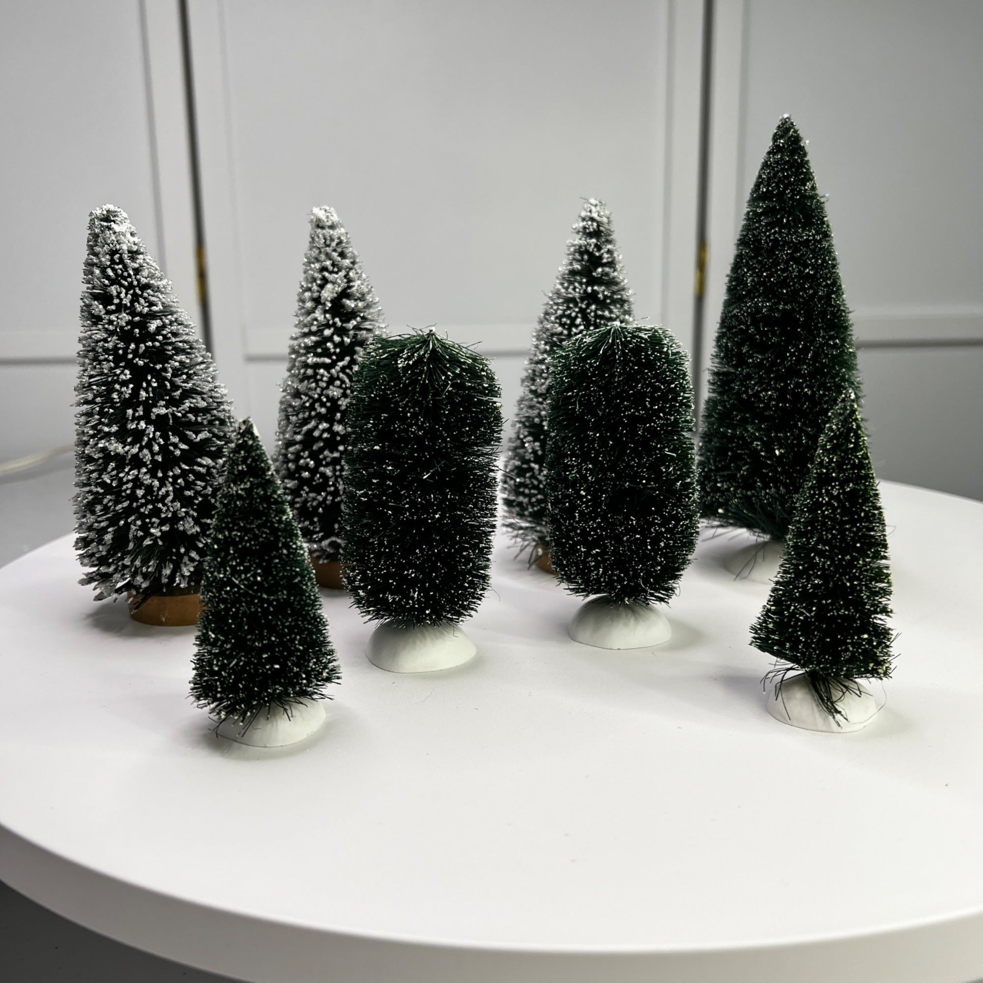 Set of 8 total trees, there are 5 small Department 56 Christmas trees, 3 have pointed tops and 2 are round and they have the white porcelain base. Also included are 3 larger unbranded trees with the wood style base. Perfect size to place around your Christmas Village. These will come with a white storage box. Size: 3-6" in height.