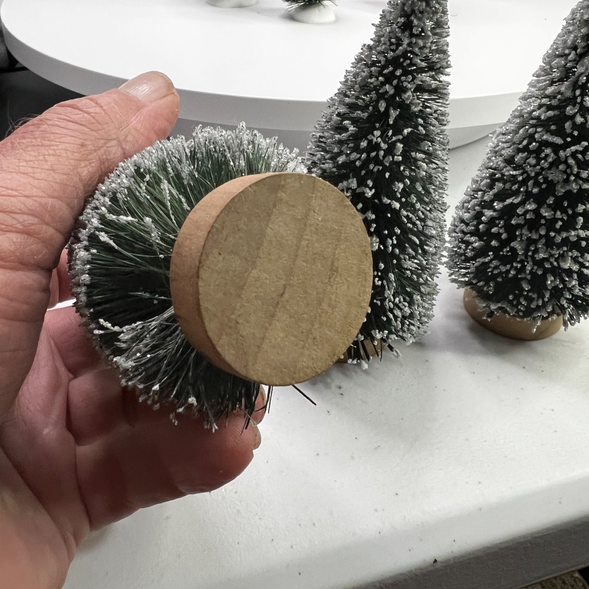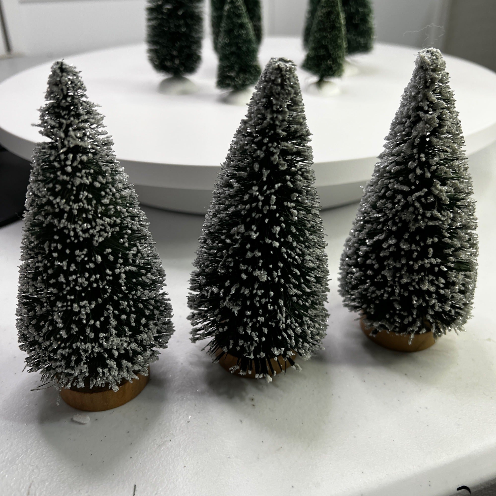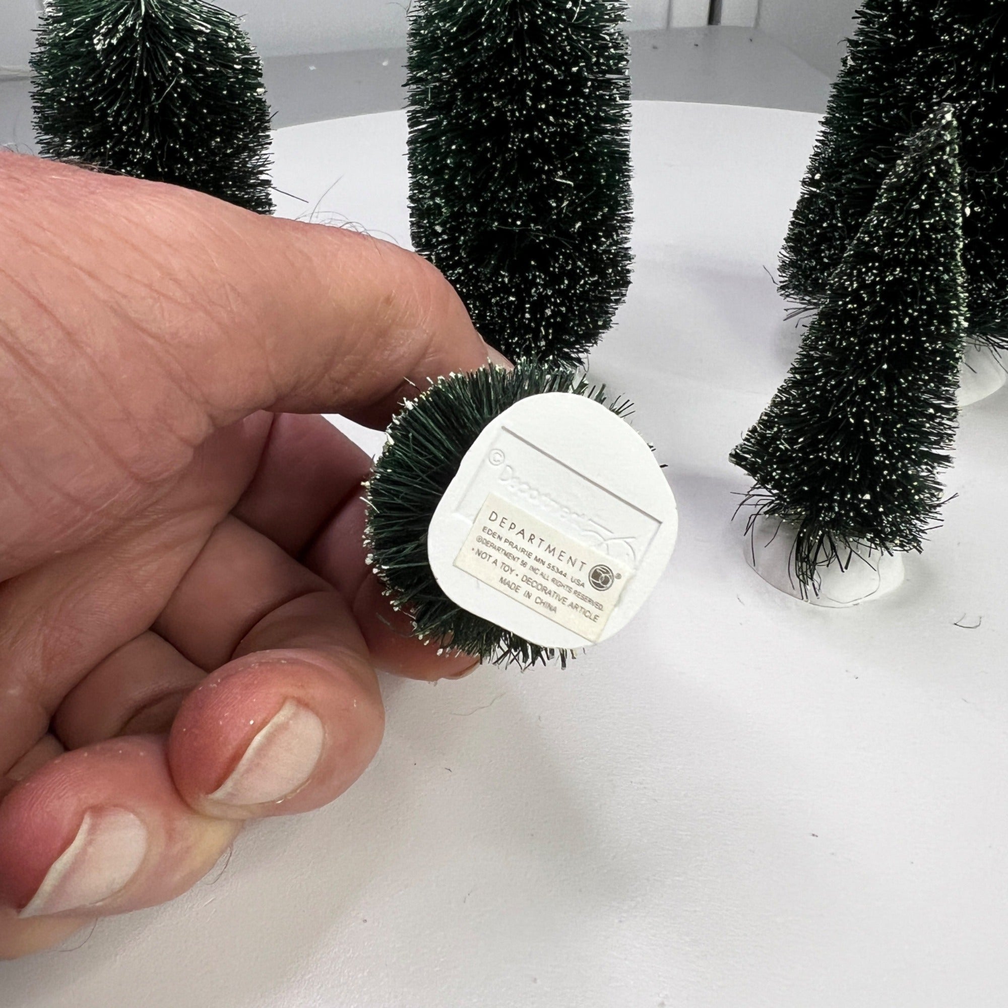Set of 8 total trees, there are 5 small Department 56 Christmas trees, 3 have pointed tops and 2 are round and they have the white porcelain base. Also included are 3 larger unbranded trees with the wood style base. Perfect size to place around your Christmas Village. These will come with a white storage box. Size: 3-6" in height.