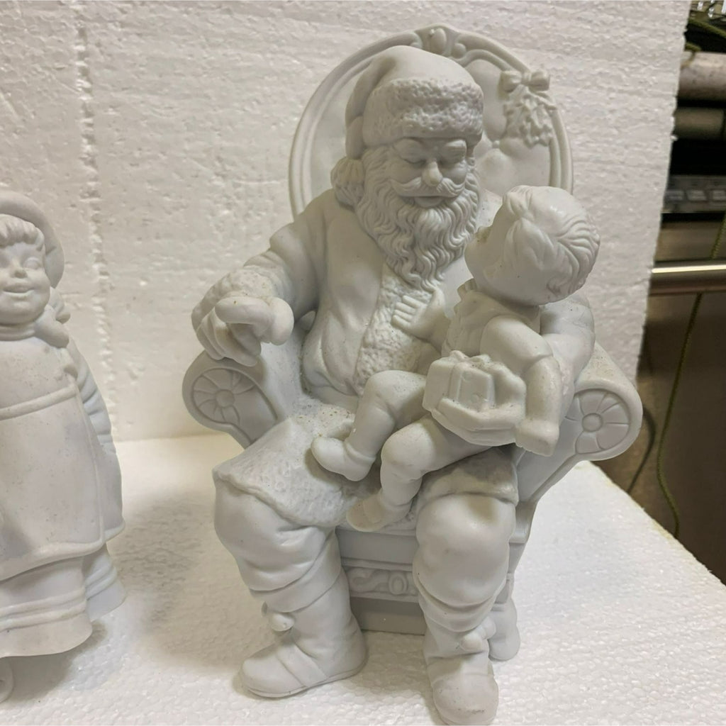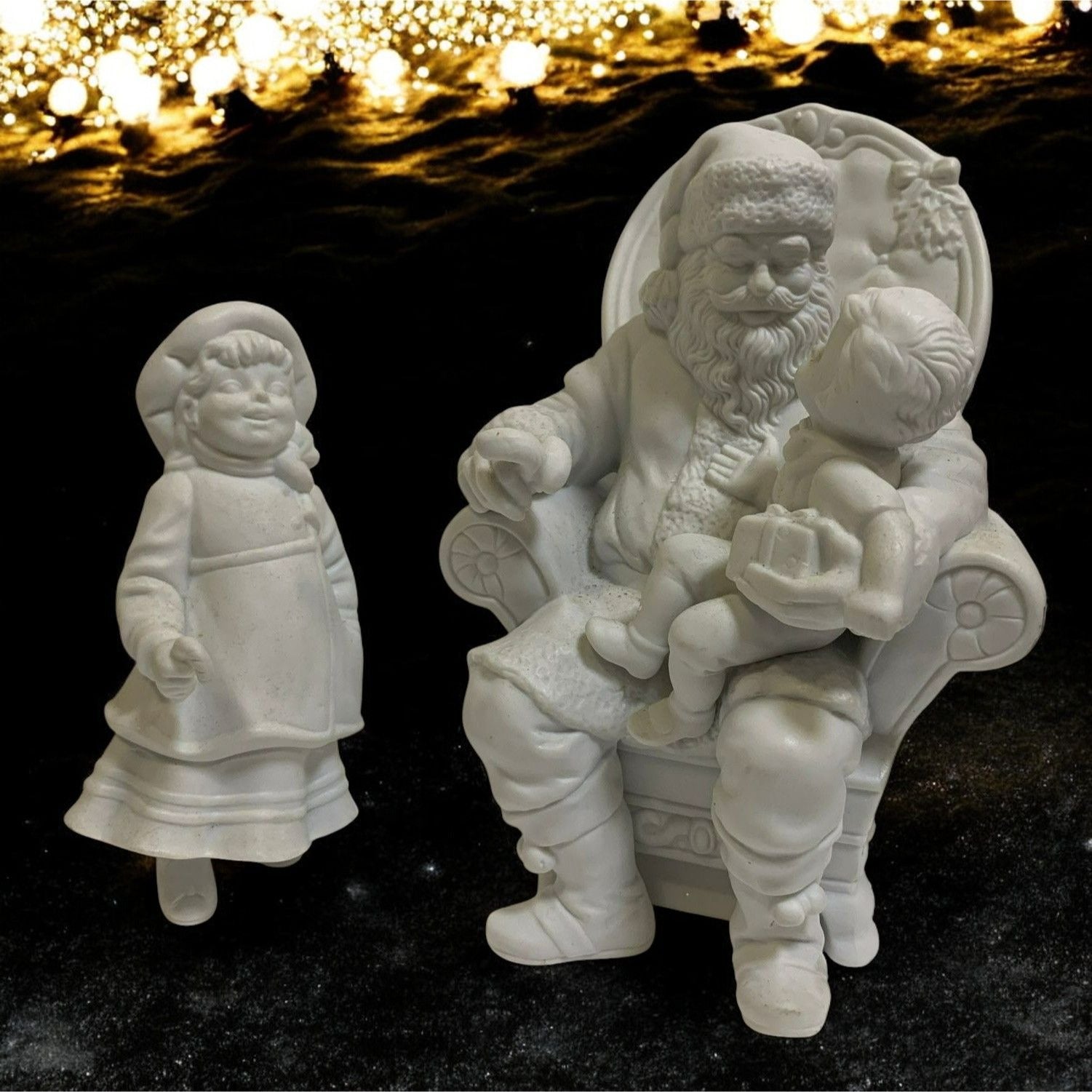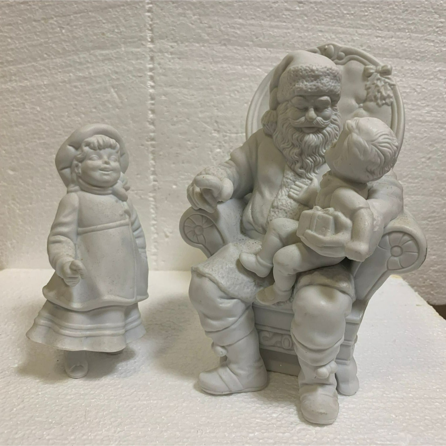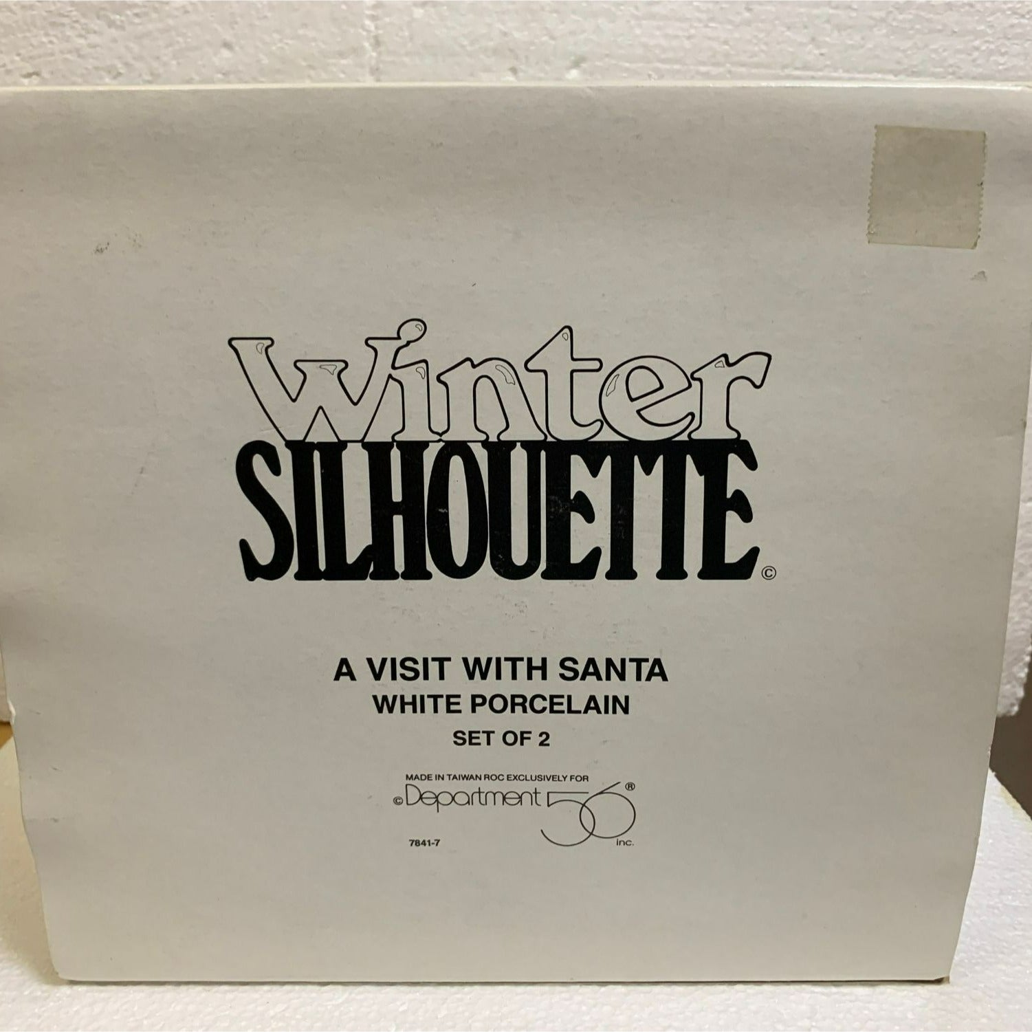 Department 56 A Visit With Santa, Winter Silhouettes Porcelain Christmas Figurines, set of 2 from 1990s. Very beautiful White Bisque Porcelain figurines. Two piece white porcelain collectible figurine set including Santa sitting in his chair holding a young boy with a slightly older girl standing nearby. Size: 5" x 6" x 8".