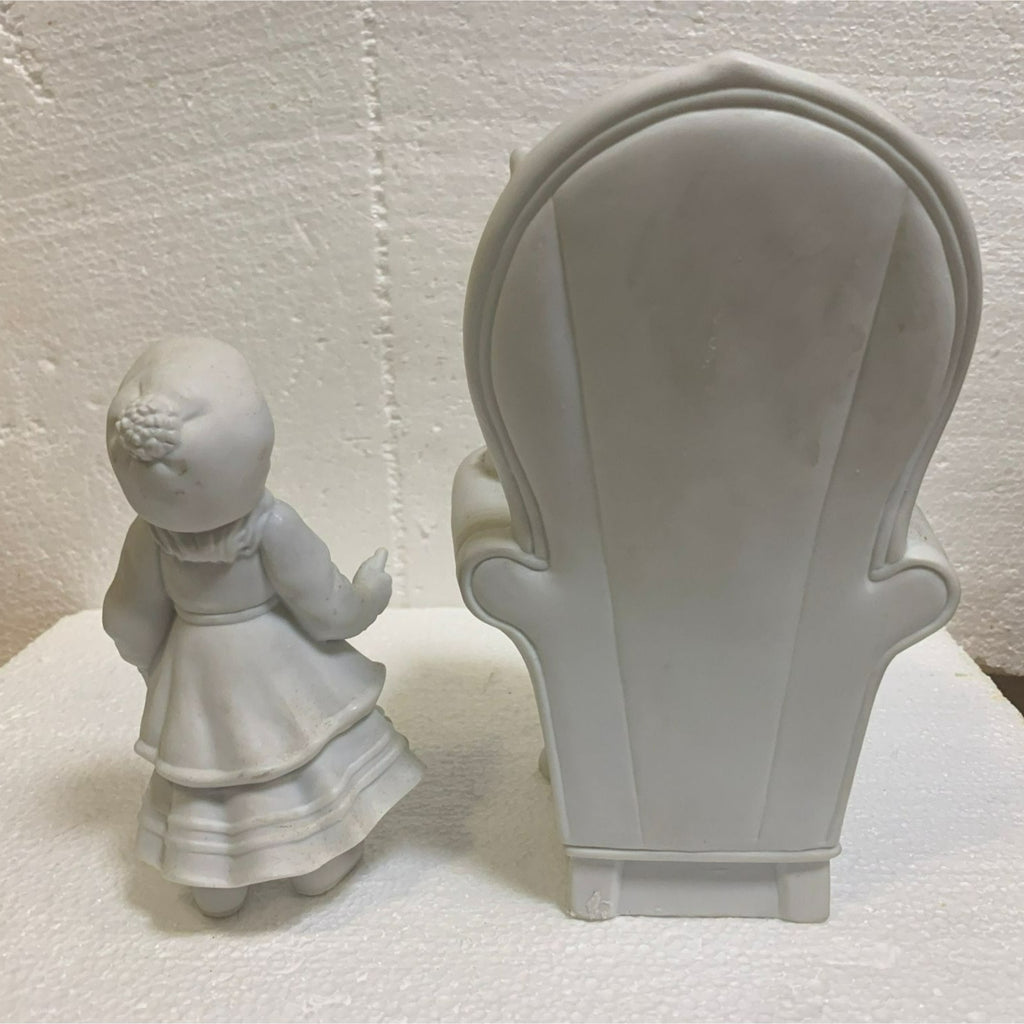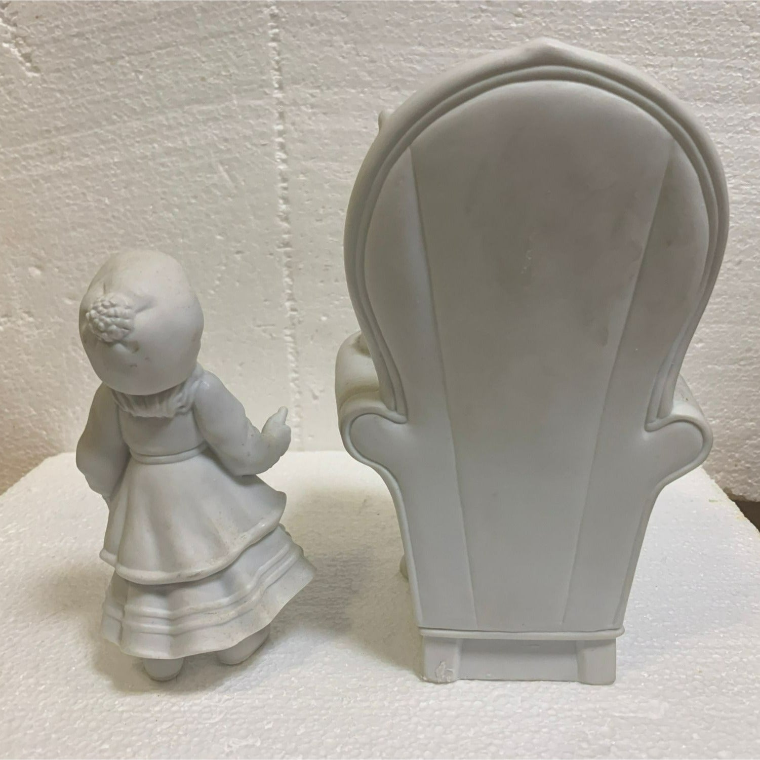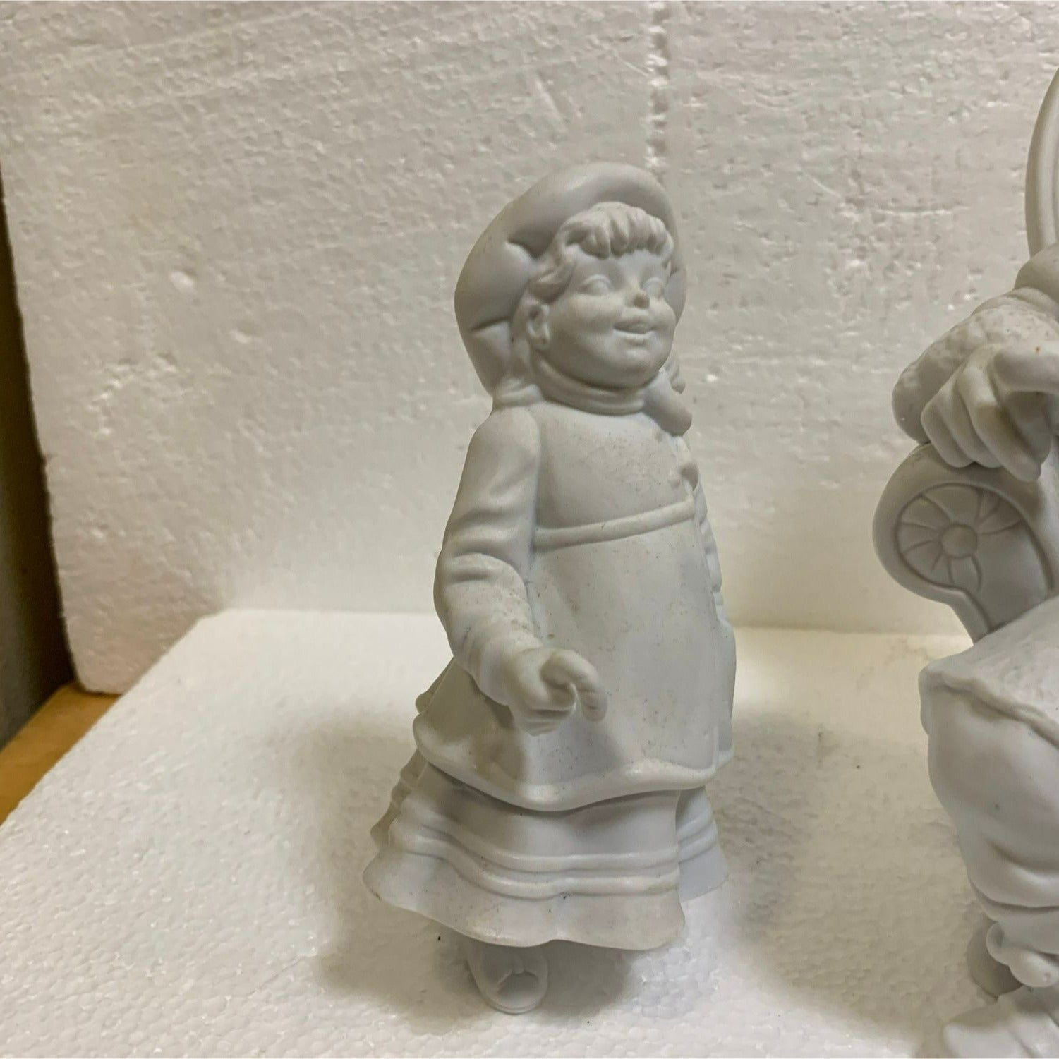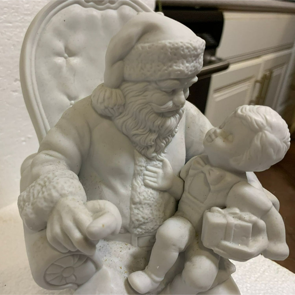 Department 56 A Visit With Santa, Winter Silhouettes Porcelain Christmas Figurines, set of 2 from 1990s. Very beautiful White Bisque Porcelain figurines. Two piece white porcelain collectible figurine set including Santa sitting in his chair holding a young boy with a slightly older girl standing nearby. Size: 5" x 6" x 8".