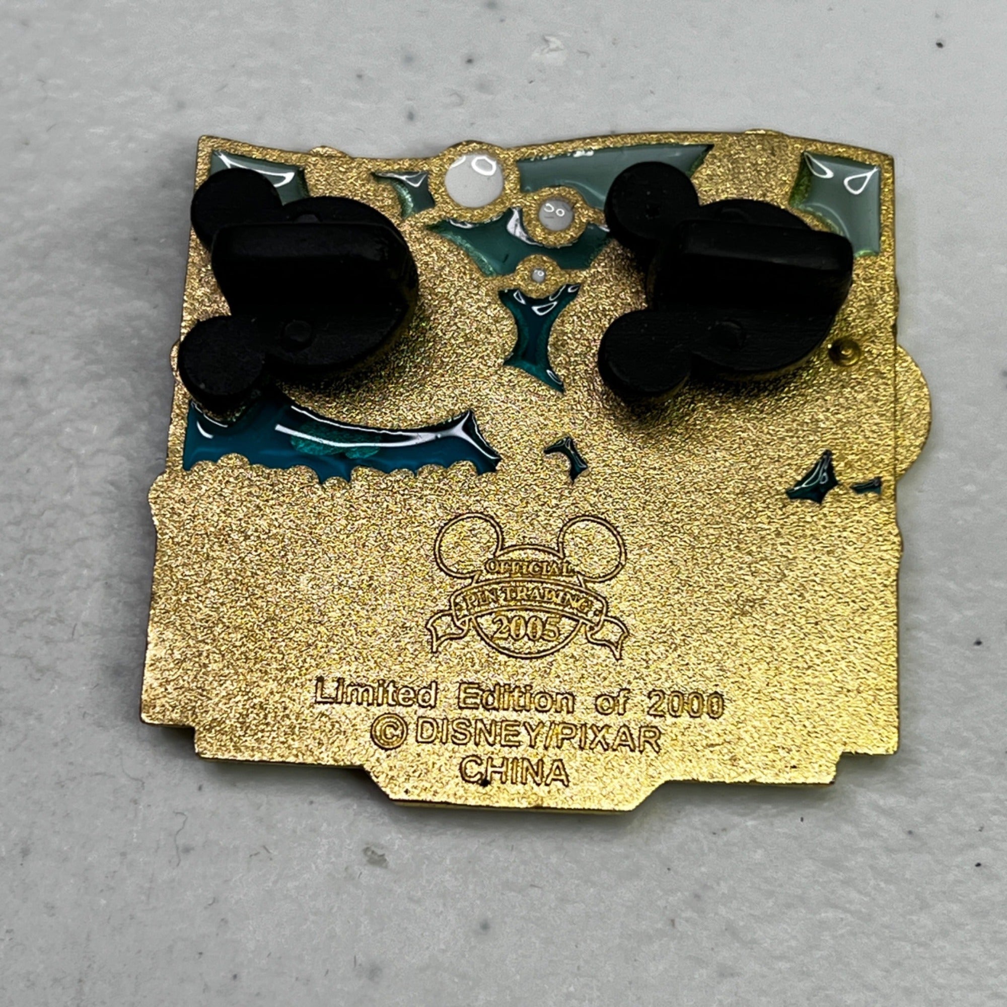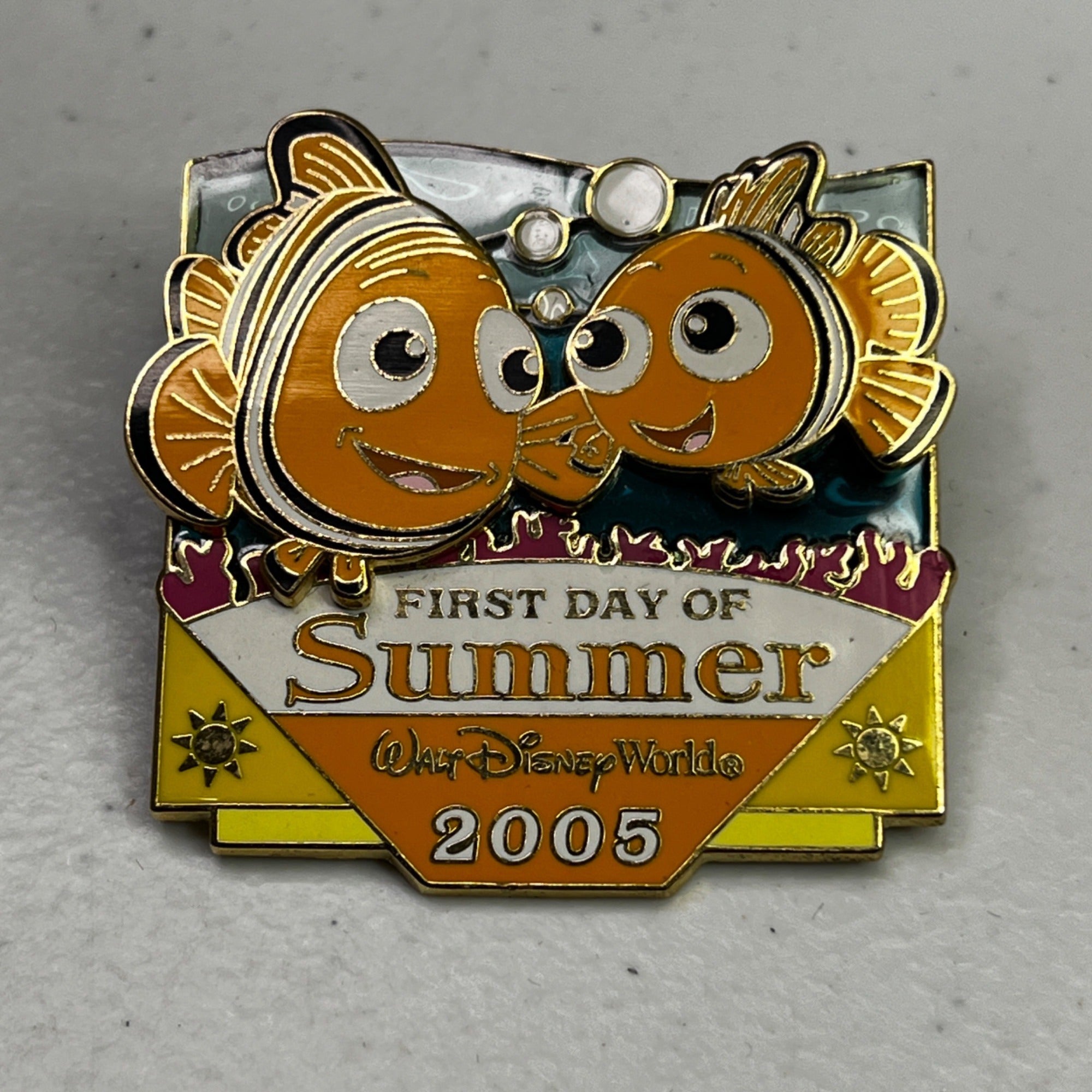 This unique collectible pin features Disney characters Nemo and Marlin who have found the first day of summer in 2005 in this Limited Edition pin. Nemo and Marlin are pin-on-pin and they are placed on a translucent blue fill to give the appearance of water. At the bottom corners are 2 suns, and in the middle top there are bubbles in the water. This pin stand almost 2" tall.