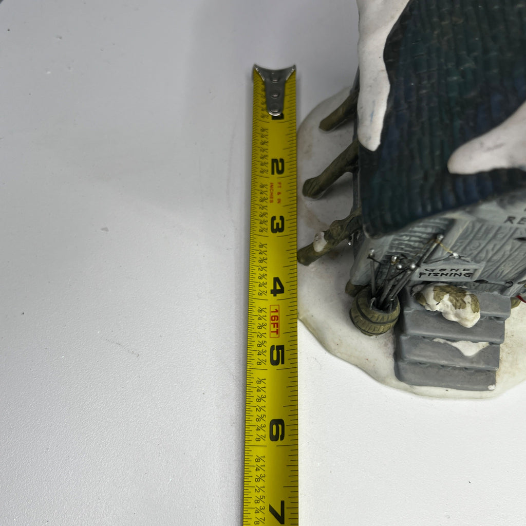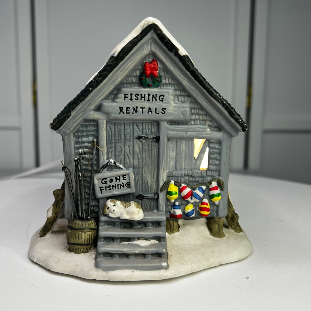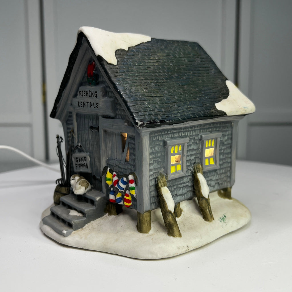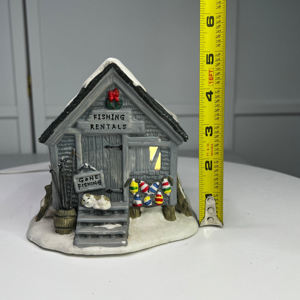 This charming porcelain holiday piece from Holiday Time is titled Fishing Rental and evokes a nostalgic winter’s day at a quaint fishing rental shack. Its intricately painted details and warm illumination bring a vintage ambiance to any seasonal display. The Fishing Rental looks beautiful when lit. Size: 5 x 5 x 5"