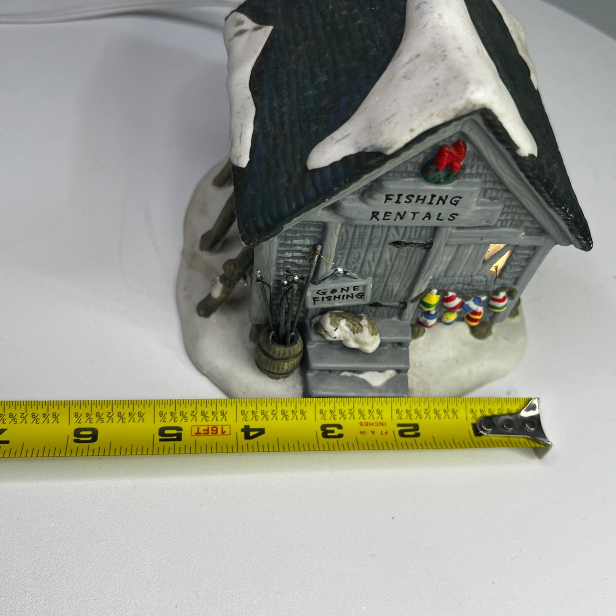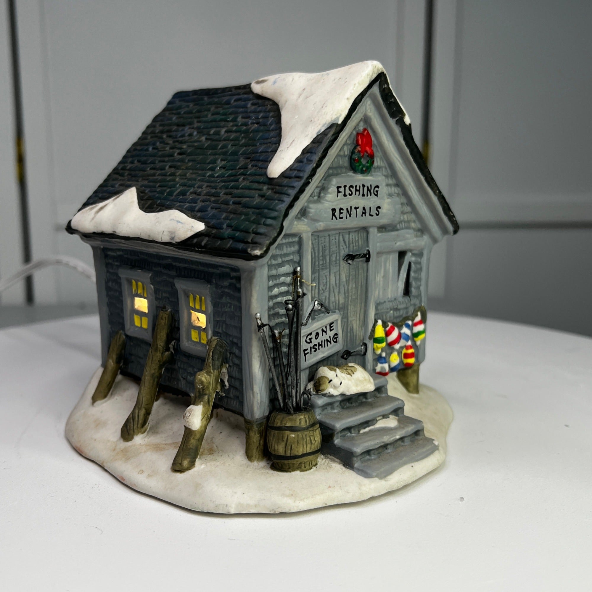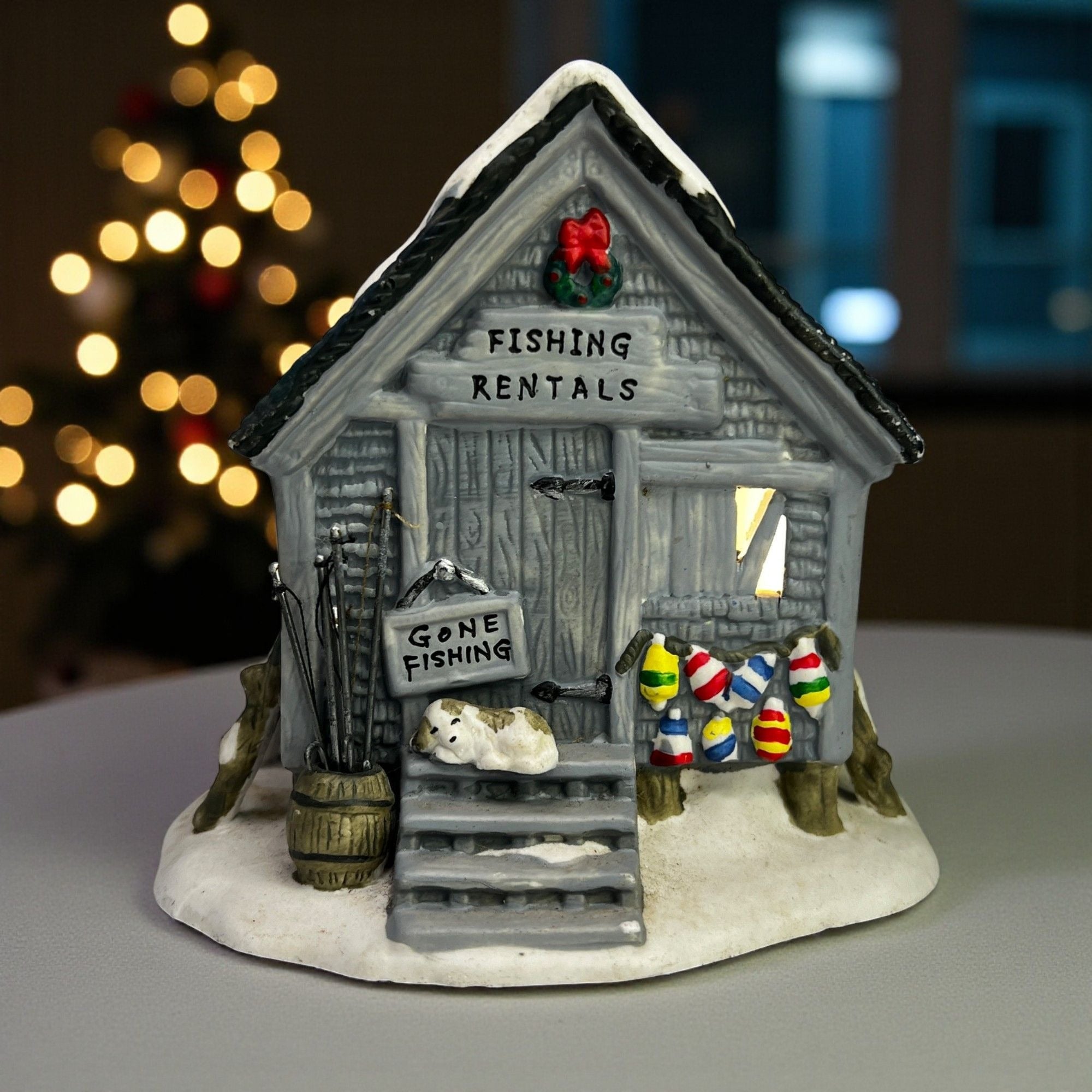 This charming porcelain holiday piece from Holiday Time is titled Fishing Rental and evokes a nostalgic winter’s day at a quaint fishing rental shack. Its intricately painted details and warm illumination bring a vintage ambiance to any seasonal display. The Fishing Rental looks beautiful when lit. Size: 5 x 5 x 5"