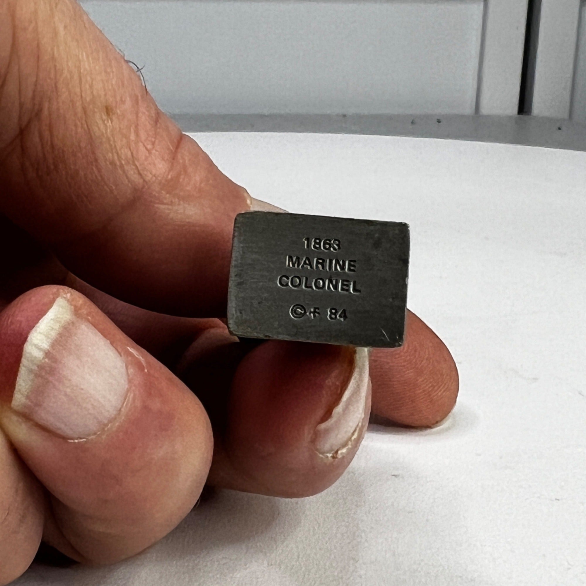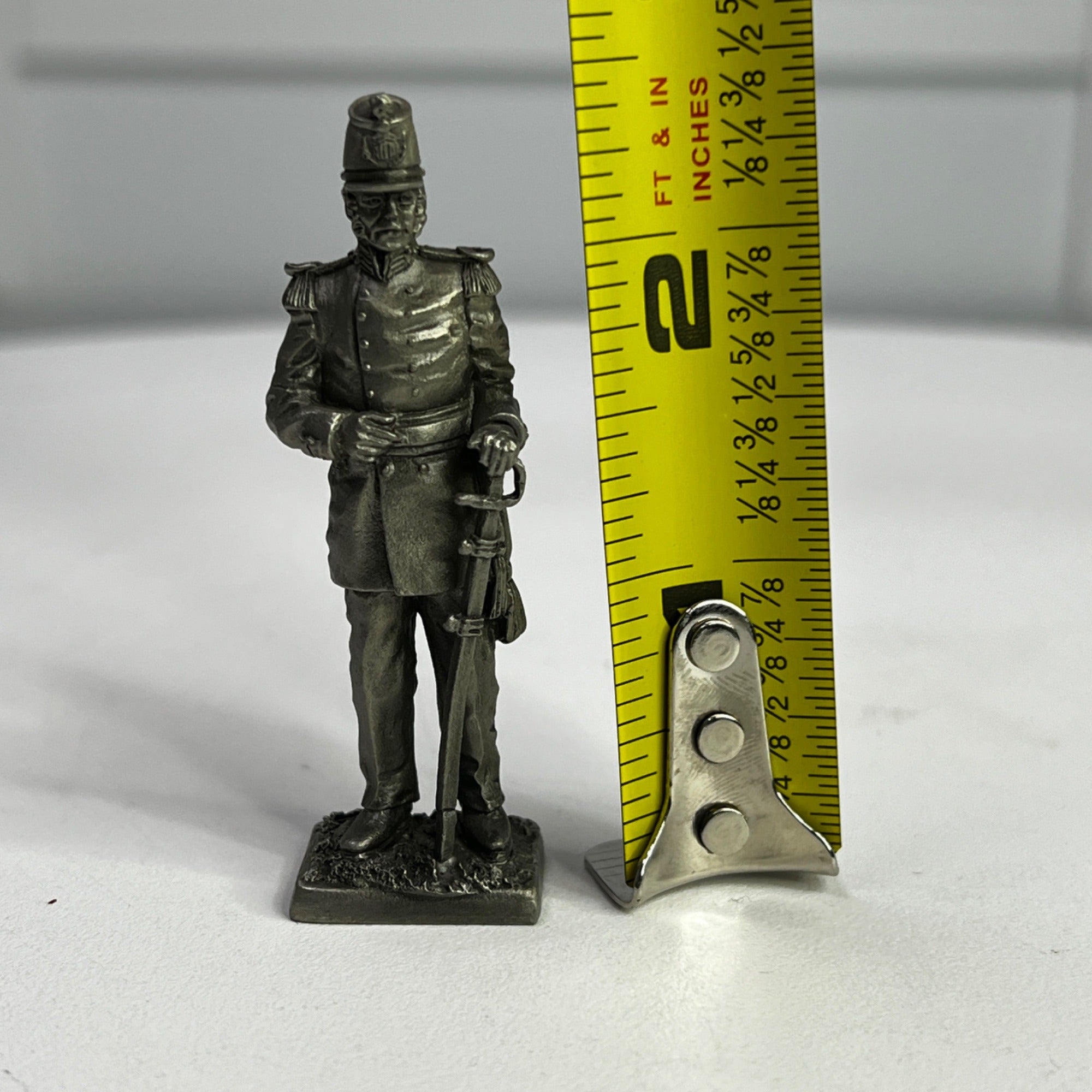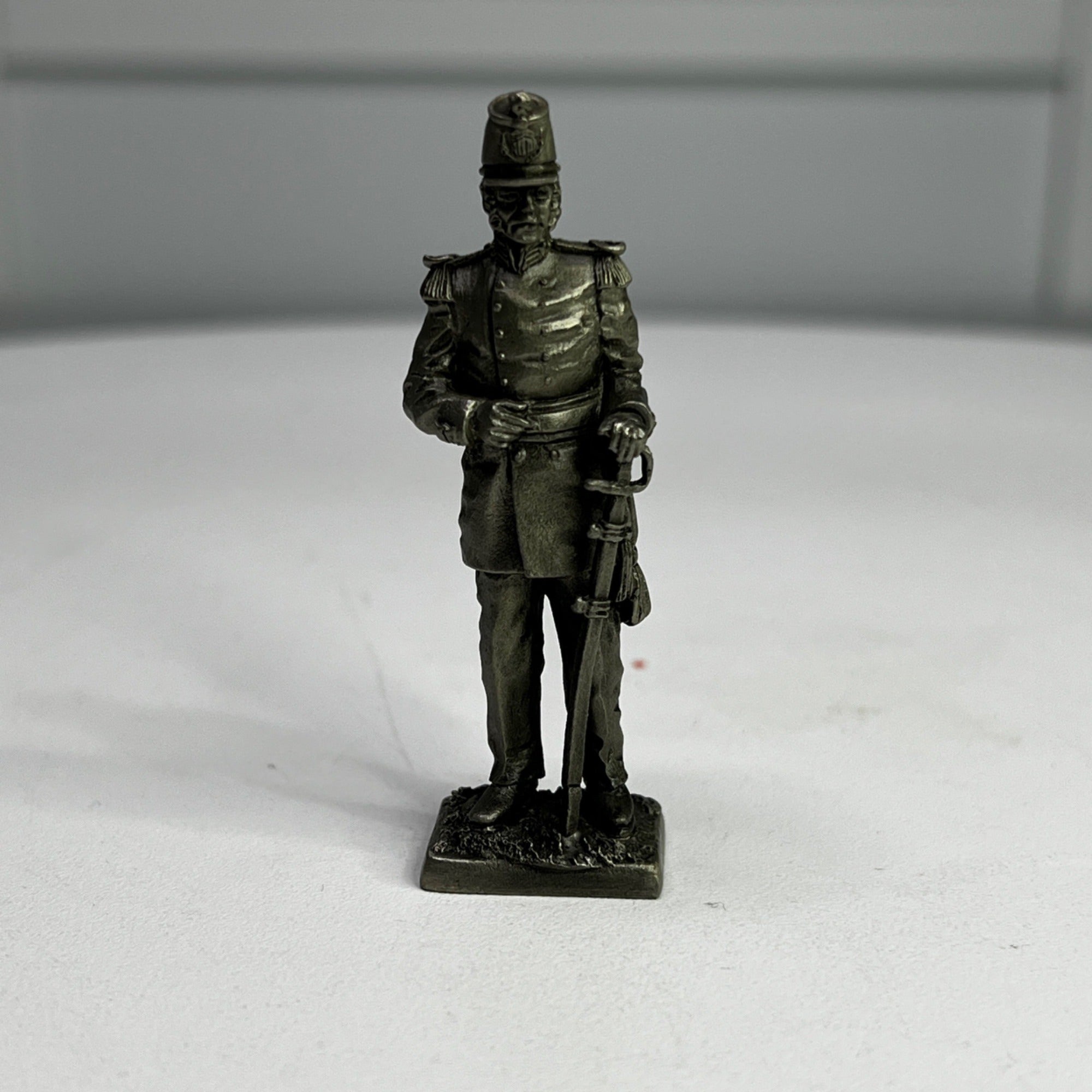 This Franklin Mint pewter figurine, crafted in 1981 and part of the American Military Sculpture collection features a Marine Colonel from 1863. Its vintage design showcases the cultural significance of the United States military during that time. A collector's item, An exquisite piece for collectors of historical memorabilia or admirers of finely crafted metalwork.