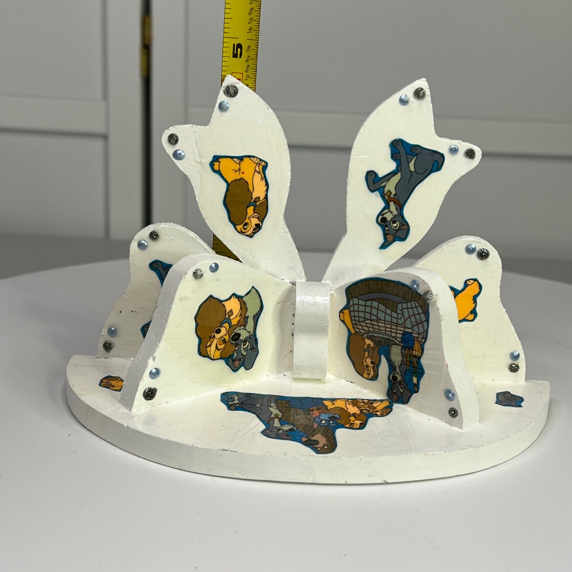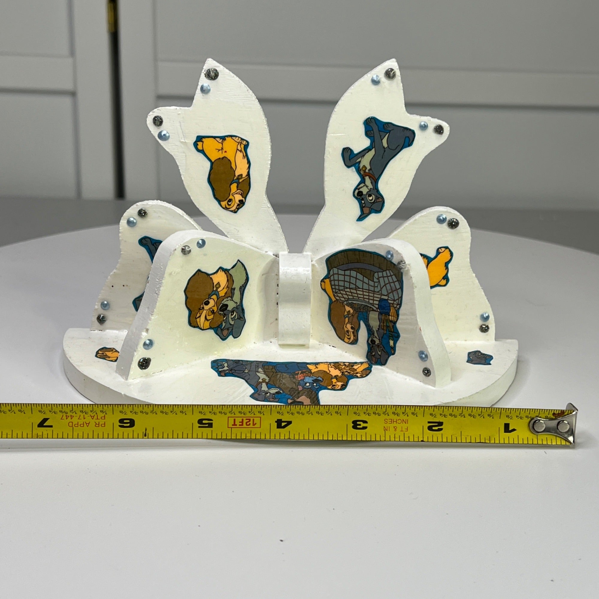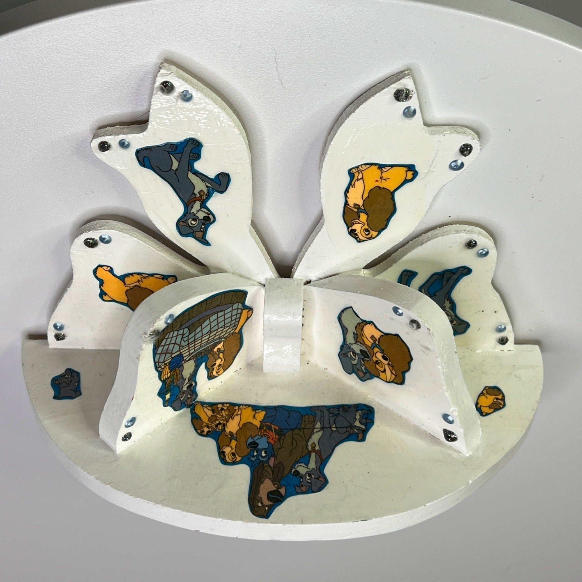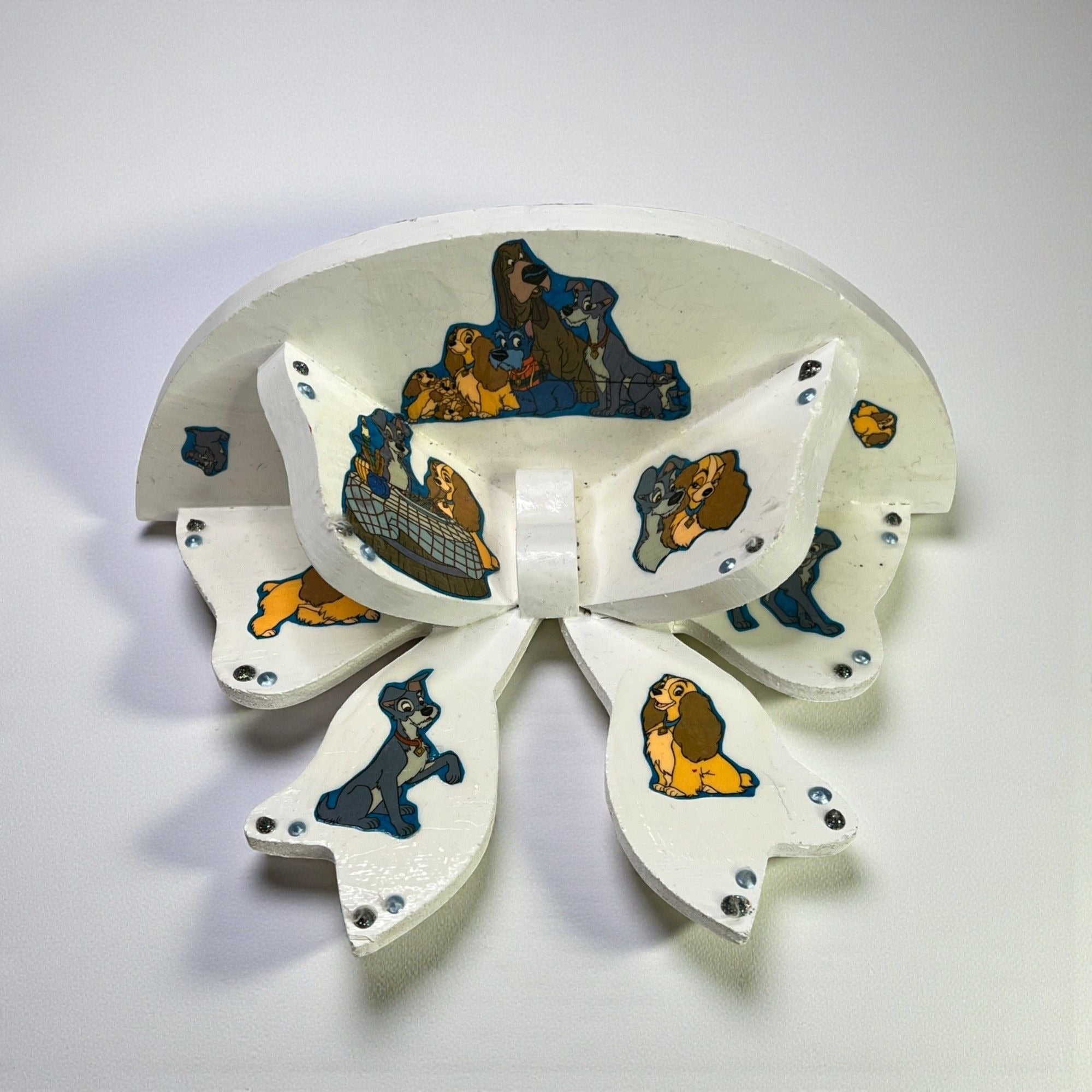 This wooden handing shelf display features charming scenes from the classic Lady & The Tramp movie. featuring a shelf on top with Lady and the Tramp characters below. The design offers a nostalgic touch to your kitchen or dining area and is a great place to showcase Lady and the Tramp figurines. A delightful collectible for Disney enthusiasts or lovers of retro decor. Shelf has some light scuffing which can be easily touched up if desired.