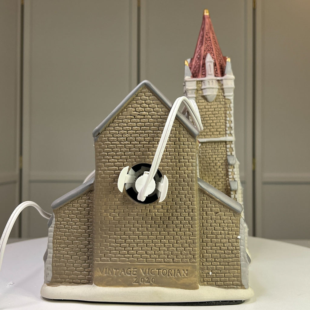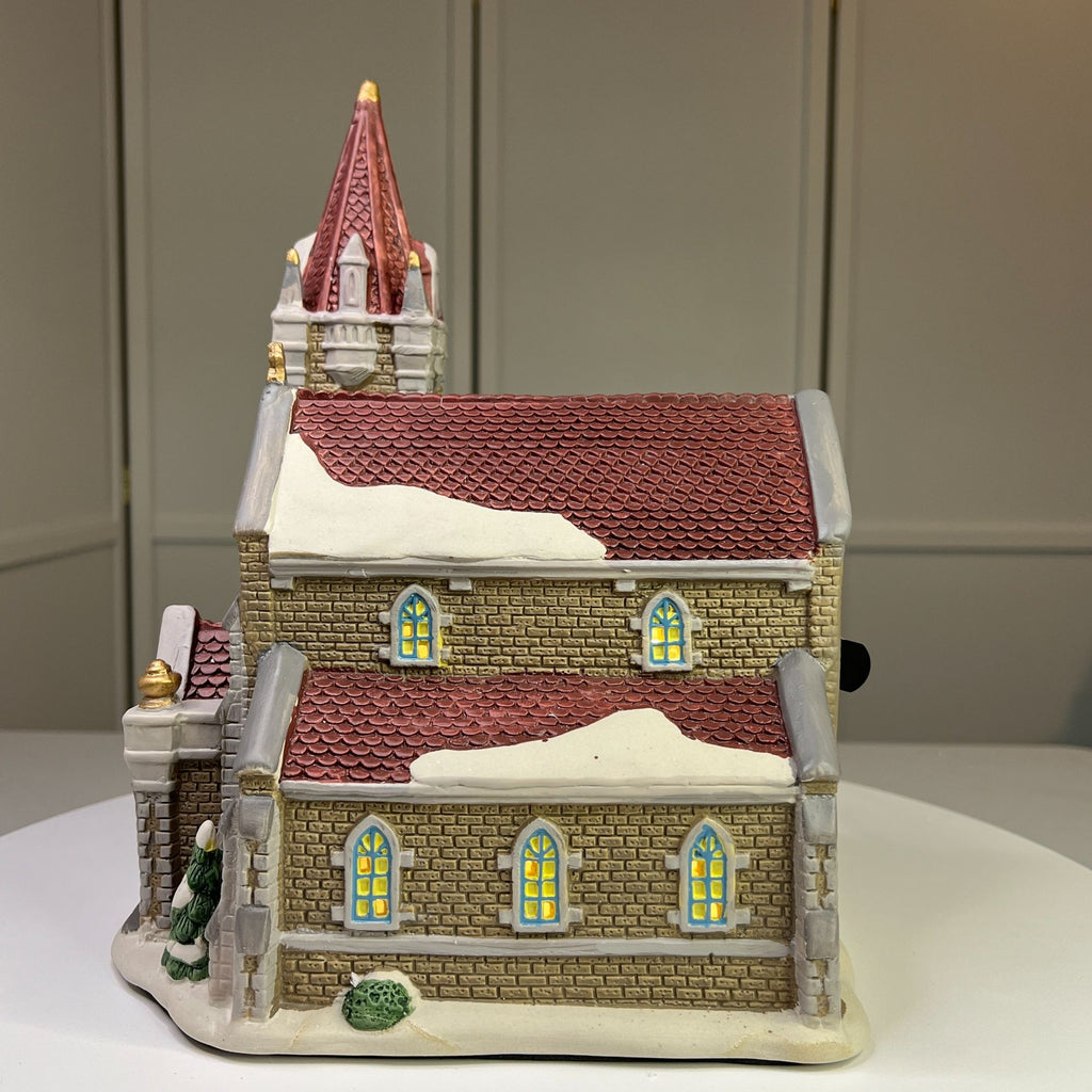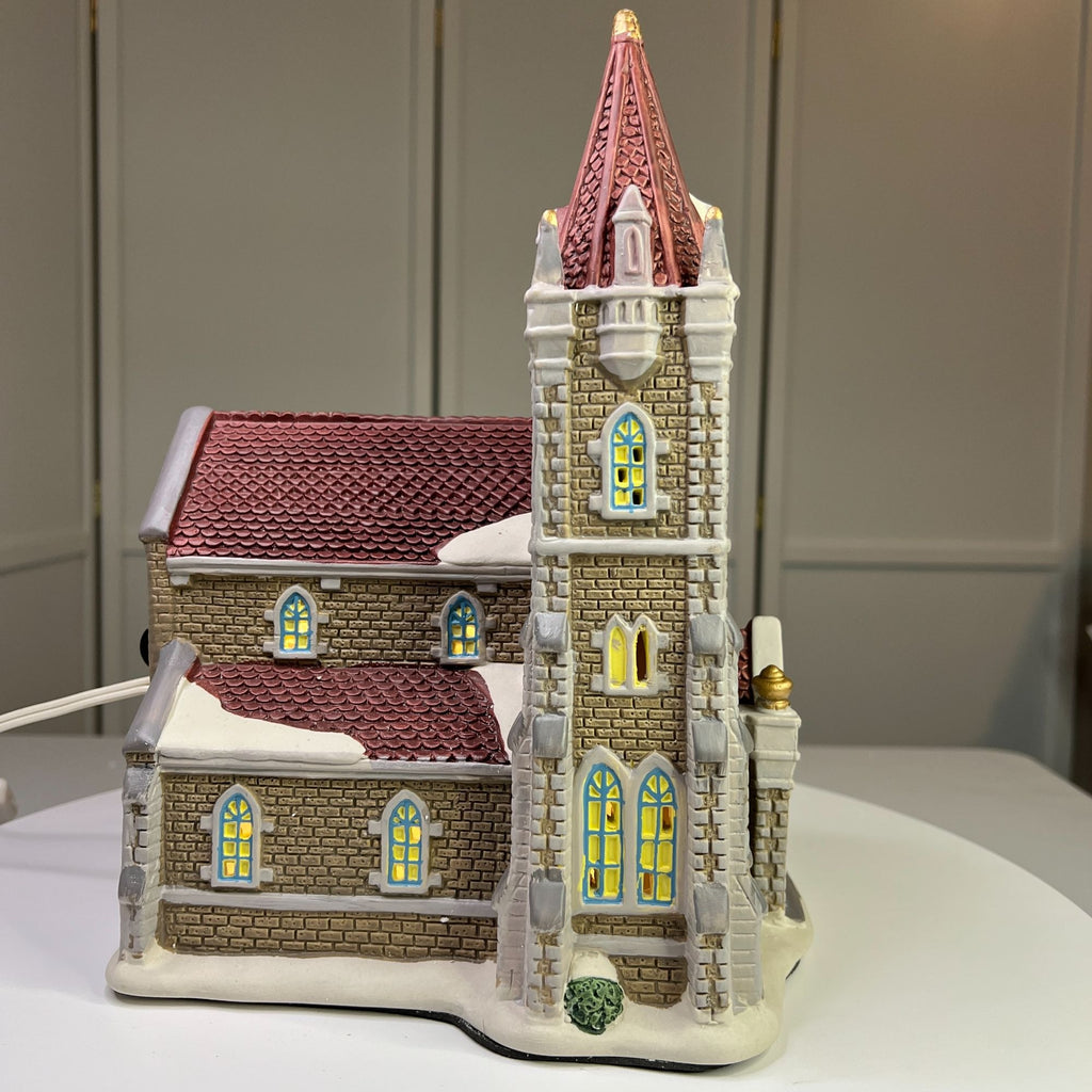 This charming cathedral is a captivating addition to any holiday village scene. Its exquisite architectural details and warm glow evoke a sense of nostalgia, bringing the magic of Christmas past to life. Crafted to resemble classic stone and brick structures, it serves as a timeless centerpiece for your festive display. The Cathedral looks beautiful when lit. Size: 7.25 in x 8.25 in x 10.5 in