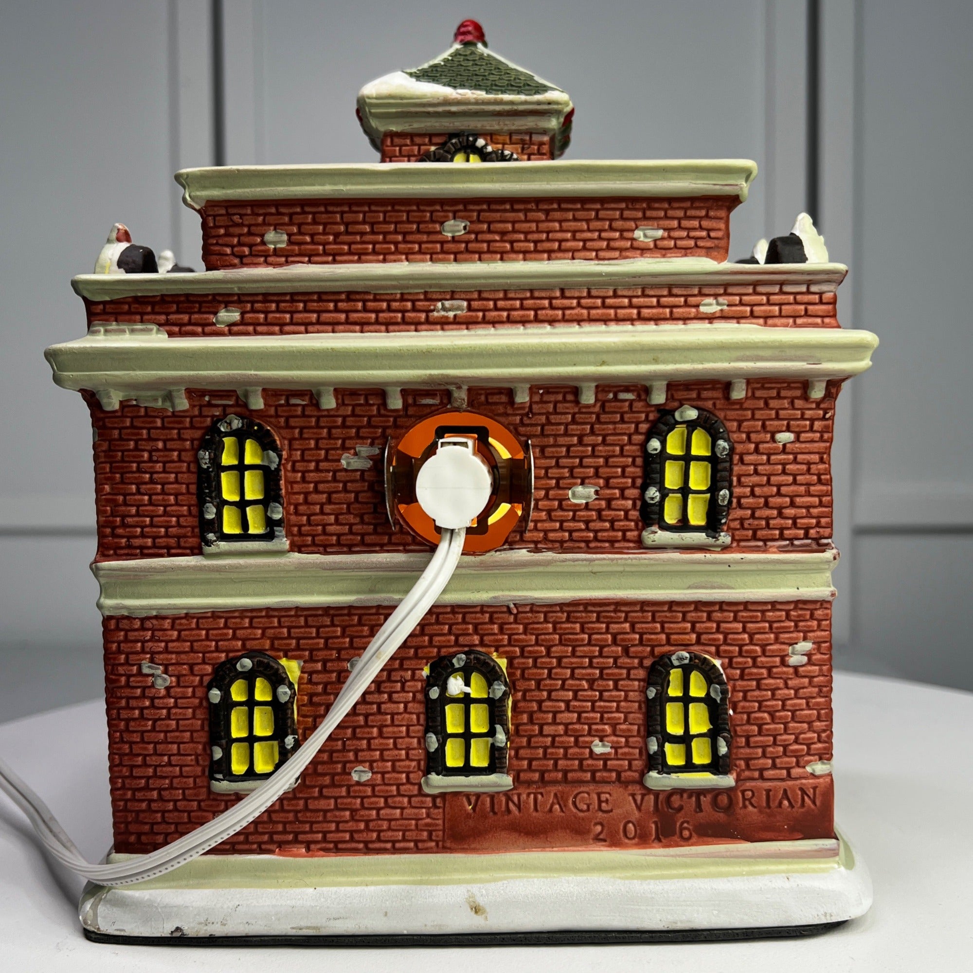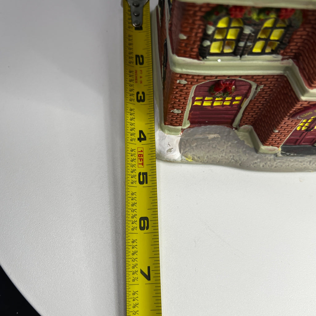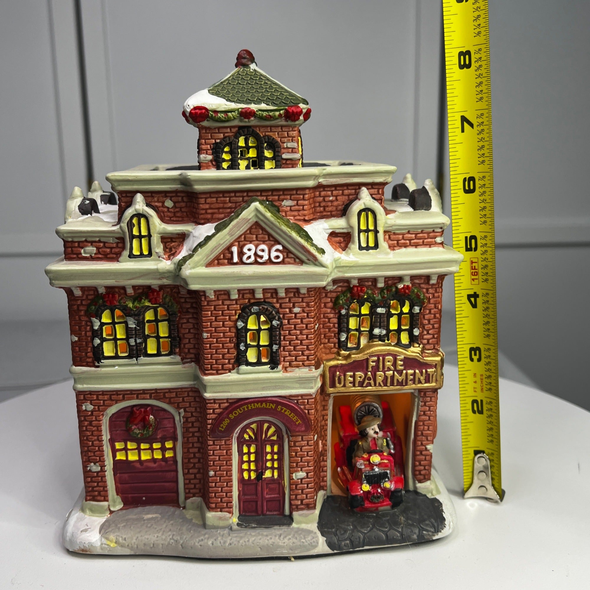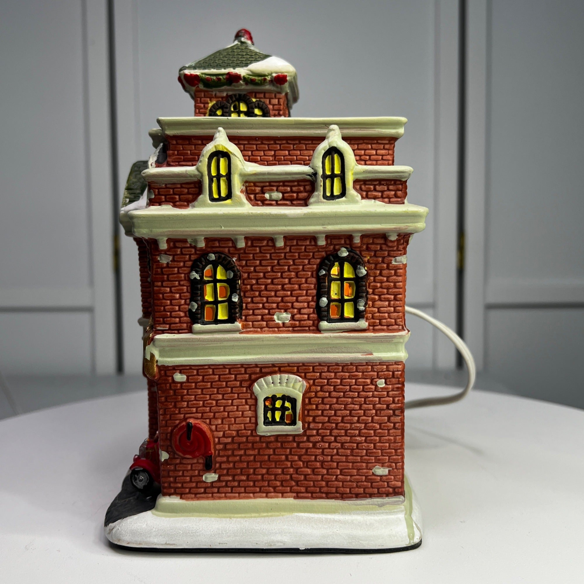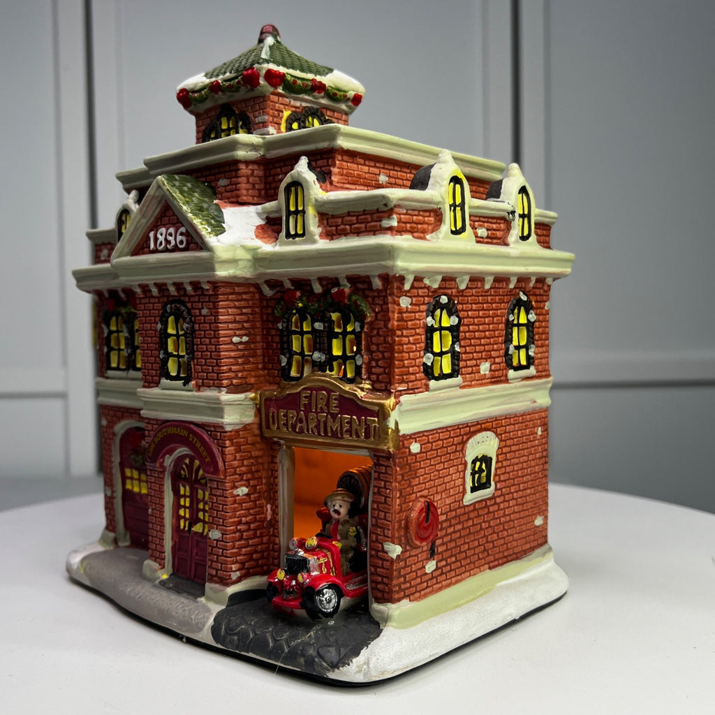 This charming vintage-inspired lighted decoration captures the essence of a fire department building, complete with intricate details such as brick textures, festive wreaths, and a classic fire truck. The warm glow from the windows brings an inviting ambiance to any display, making it an ideal piece for collectors and holiday enthusiasts. Size: 8 x 5 x 7"