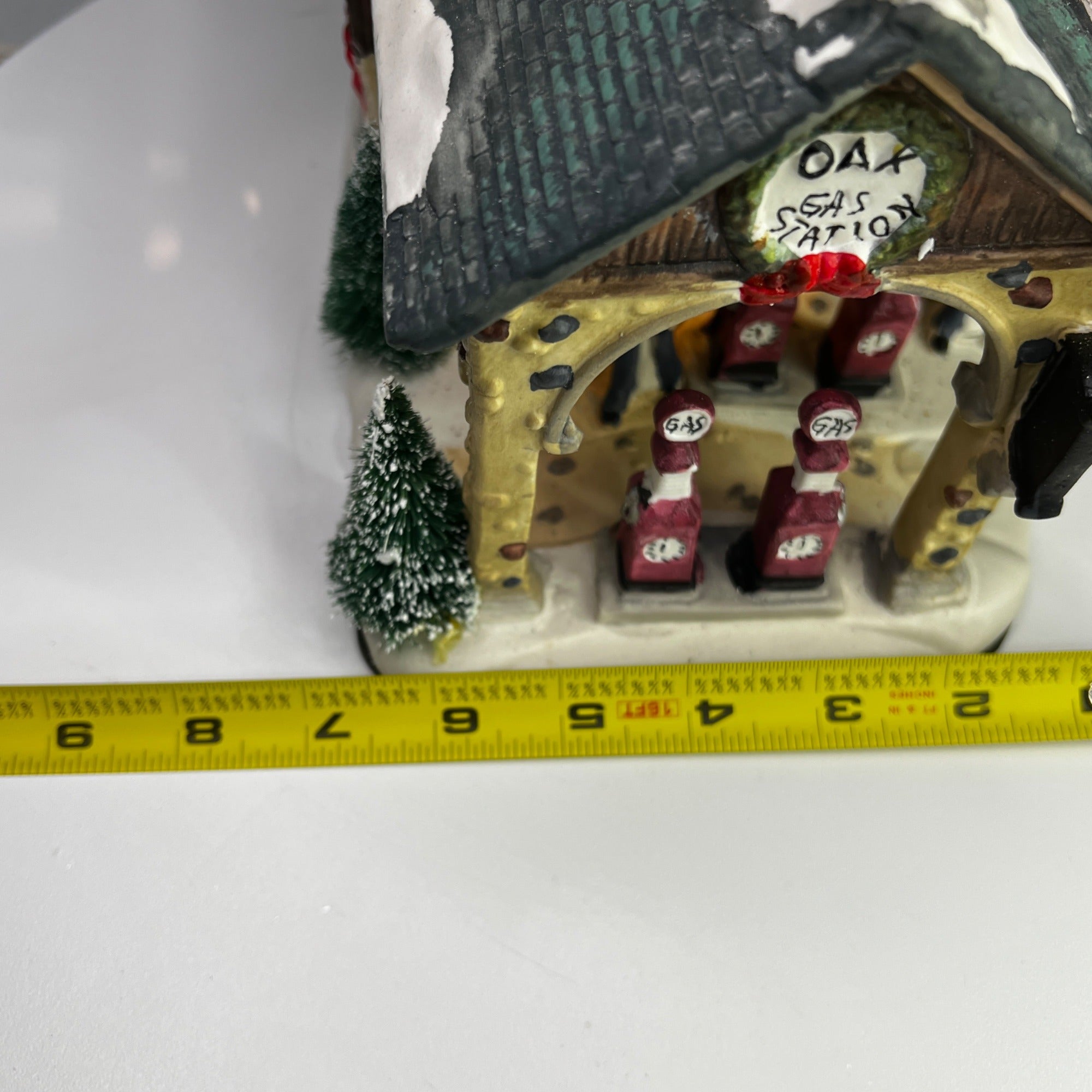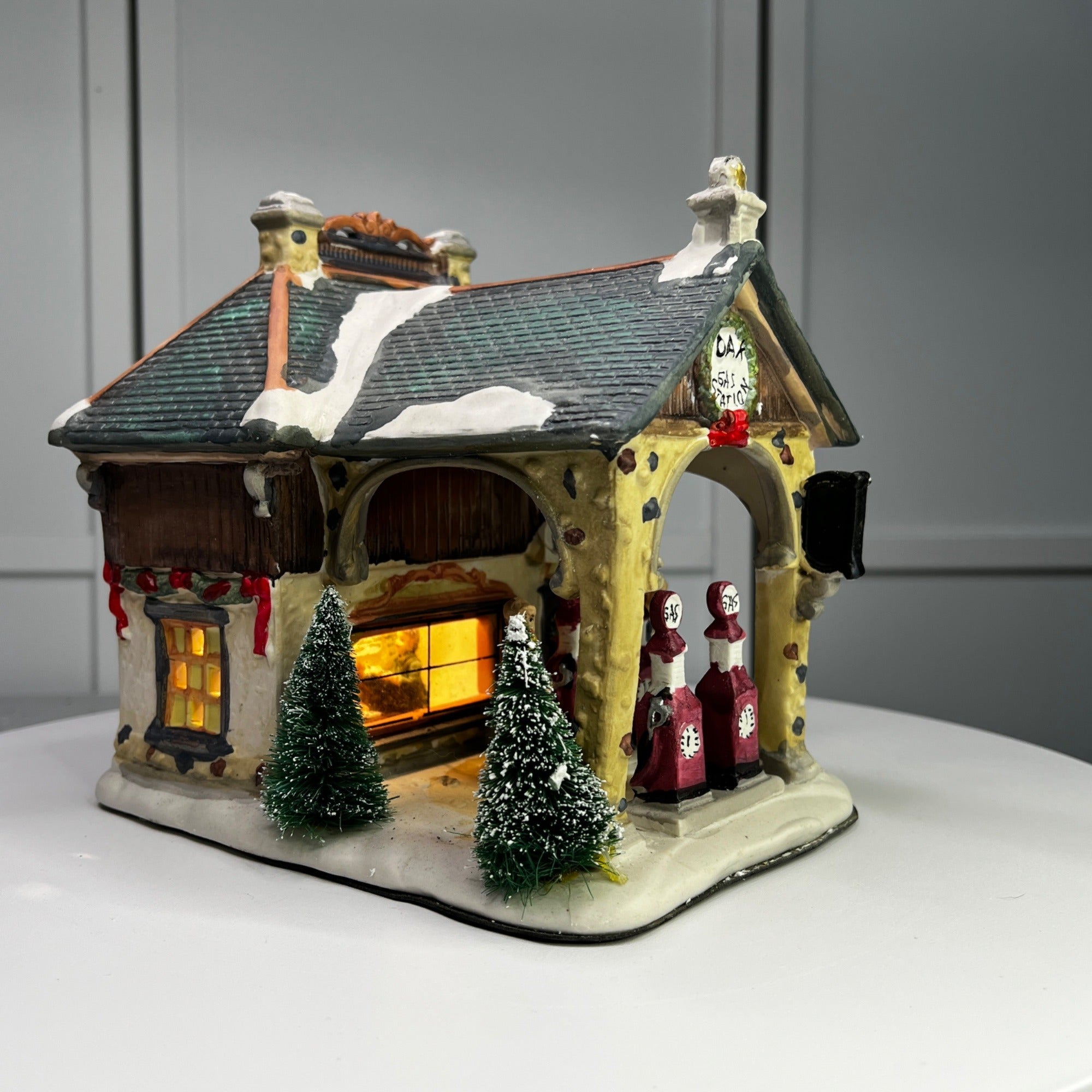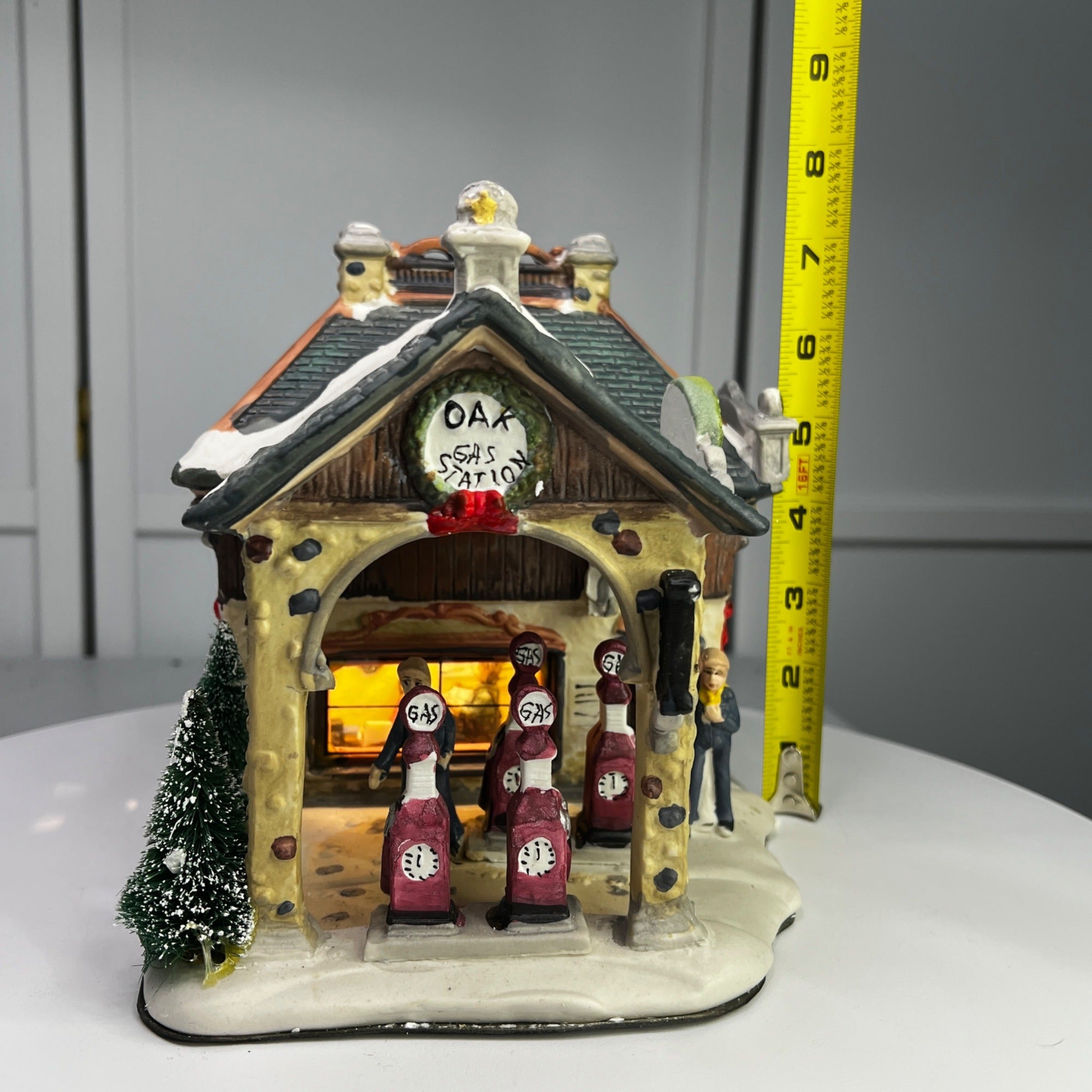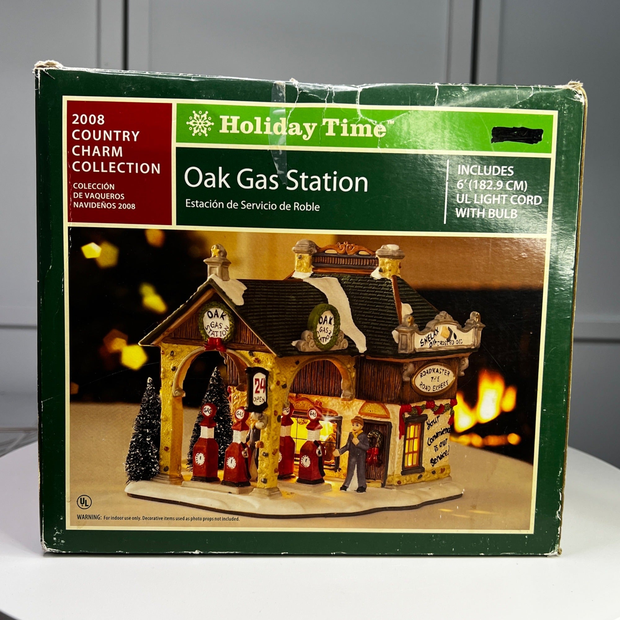 Holiday Time Oak Gas Station Country Charm Village Lighted Building from 2008. Beautiful hand painted porcelain building. This large, asymmetrical shaped village gas station features a multicolor design with a country charm style was well as a indoor scene. This illuminated indoor piece is suitable for any room. Perfect for collectors or those looking to add a touch of seasonal cheer to their home. The Oak Gas Station looks beautiful when lit. Size: 7.5 x 7 x 7".
