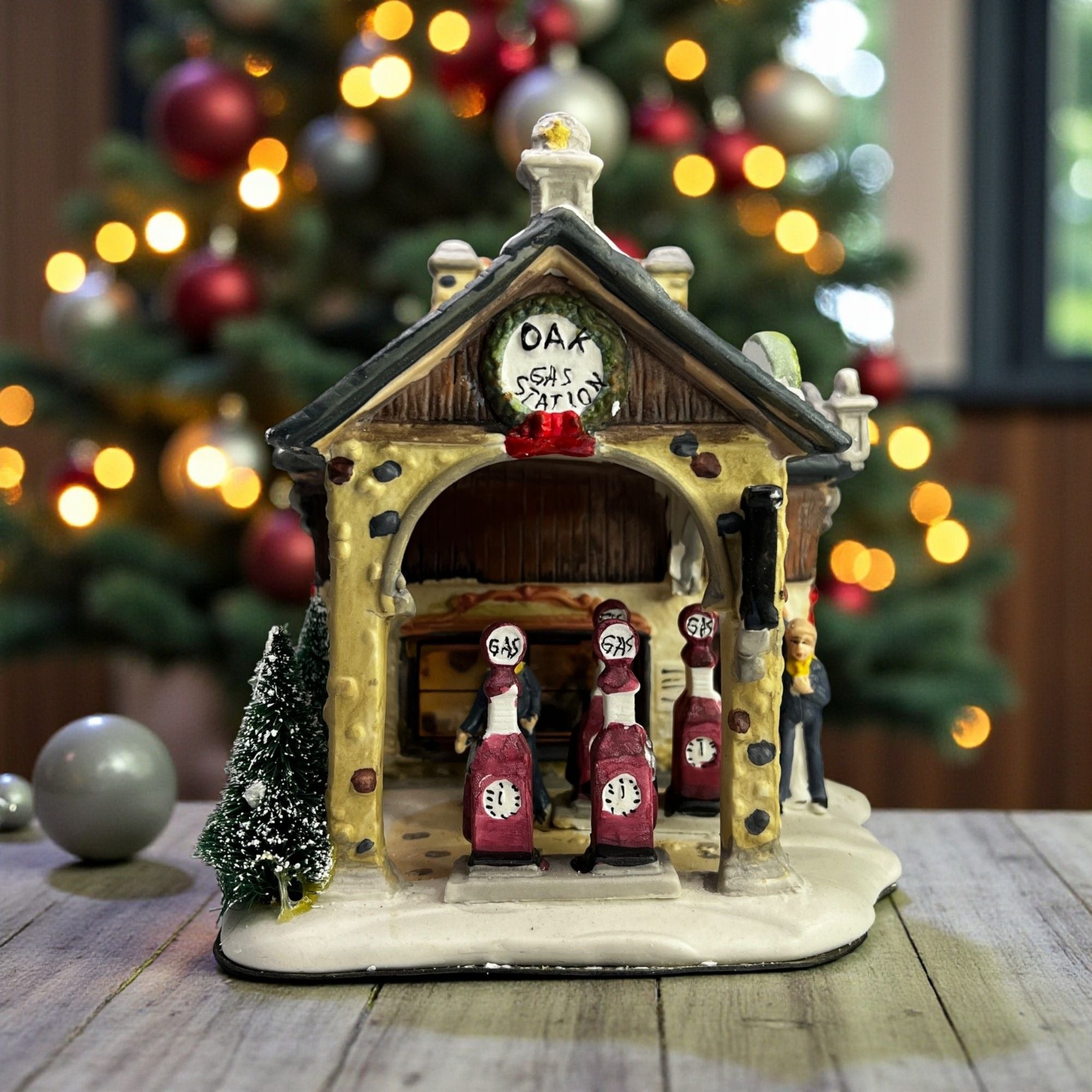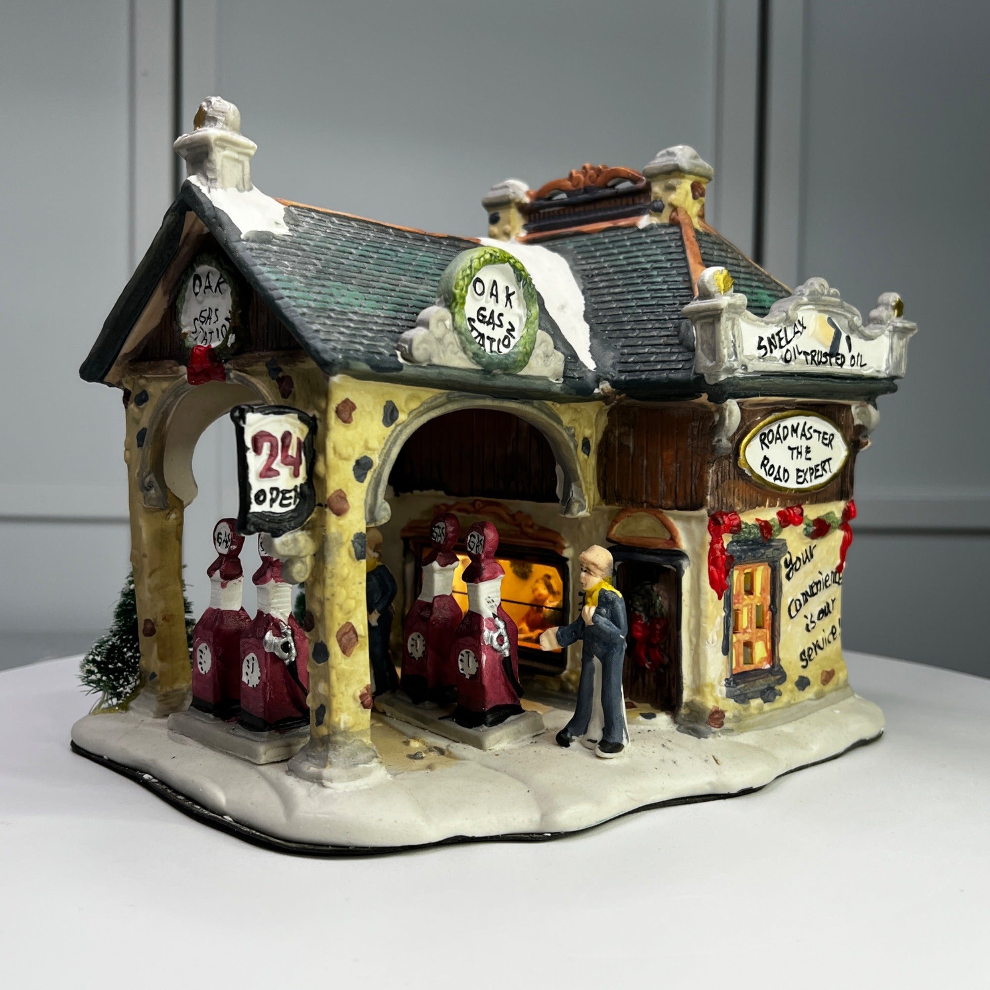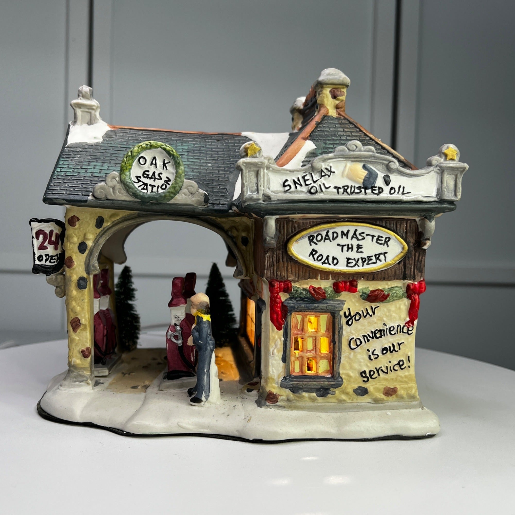 Holiday Time Oak Gas Station Country Charm Village Lighted Building from 2008. Beautiful hand painted porcelain building. This large, asymmetrical shaped village gas station features a multicolor design with a country charm style was well as a indoor scene. This illuminated indoor piece is suitable for any room. Perfect for collectors or those looking to add a touch of seasonal cheer to their home. The Oak Gas Station looks beautiful when lit. Size: 7.5 x 7 x 7".