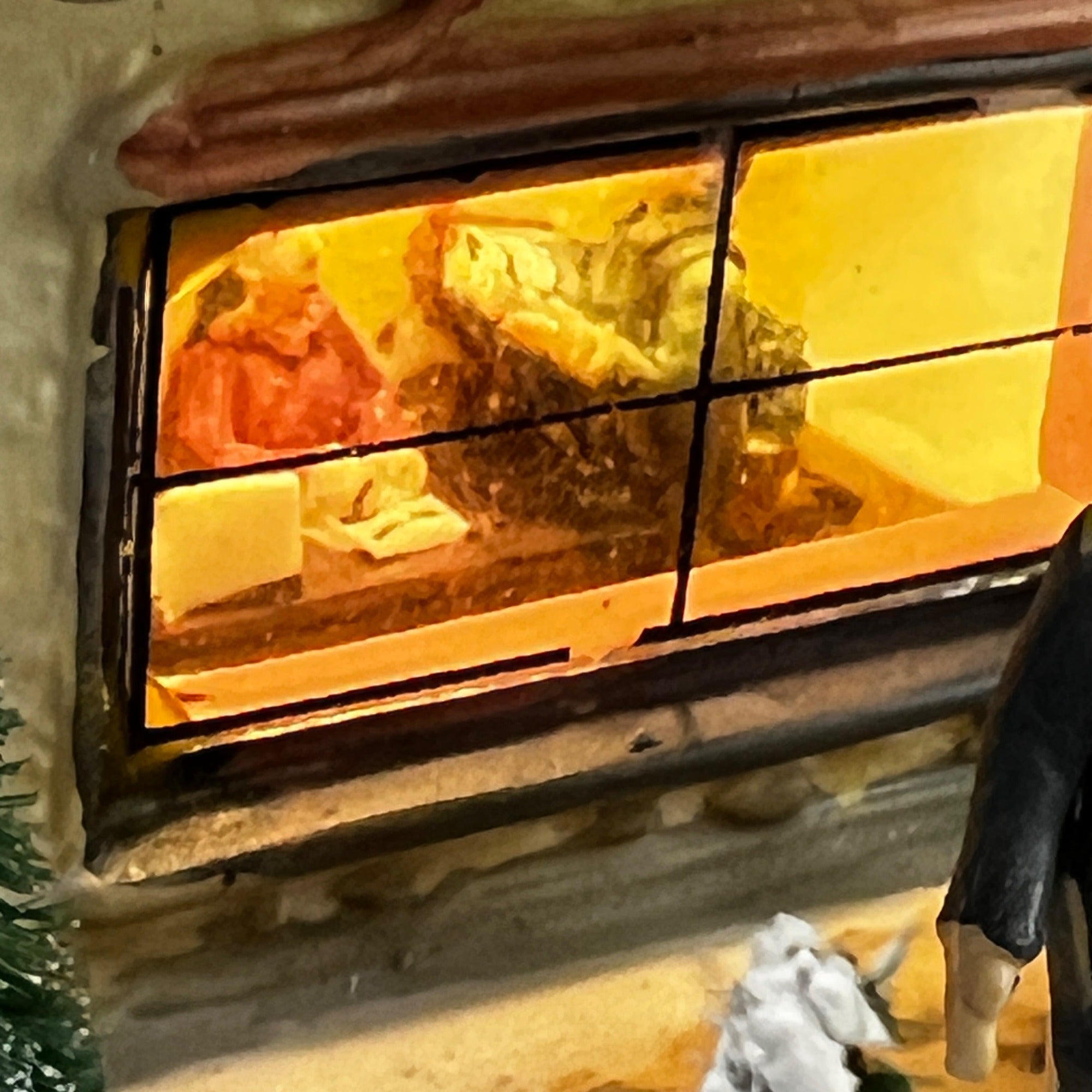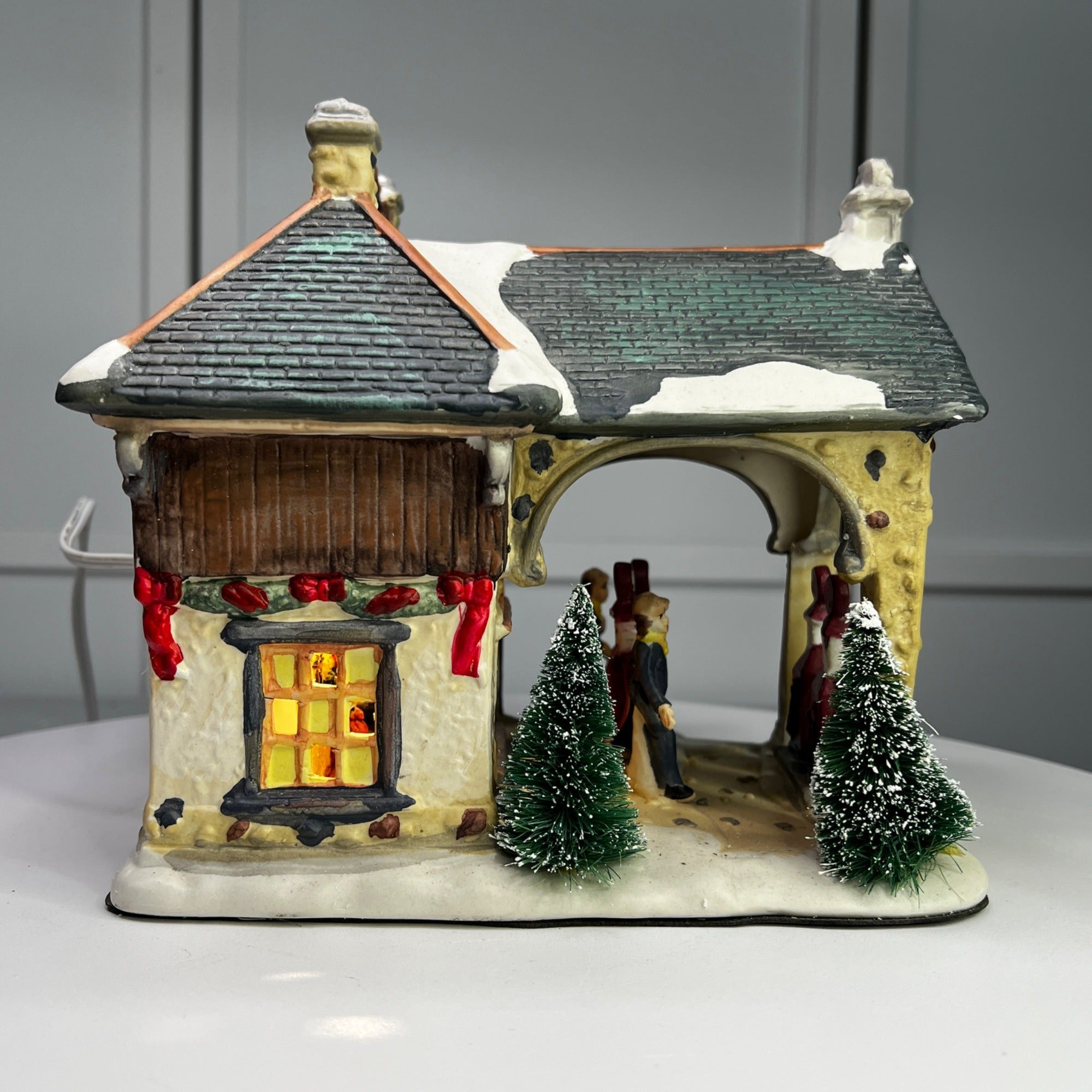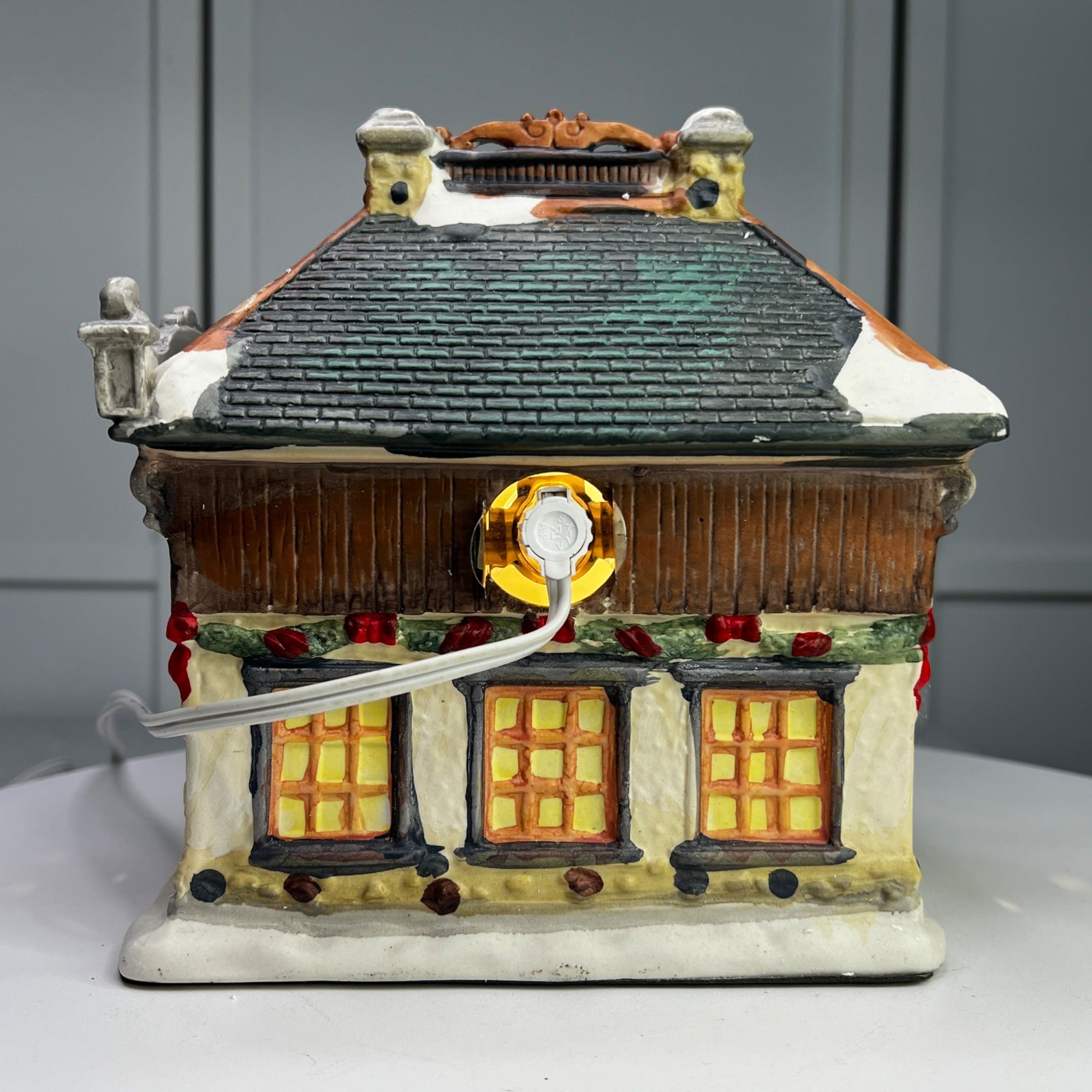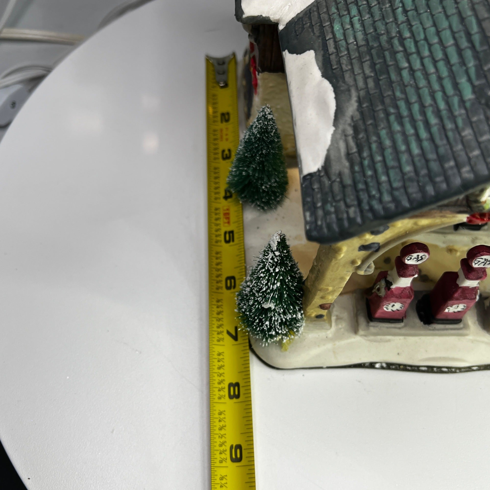 Holiday Time Oak Gas Station Country Charm Village Lighted Building from 2008. Beautiful hand painted porcelain building. This large, asymmetrical shaped village gas station features a multicolor design with a country charm style was well as a indoor scene. This illuminated indoor piece is suitable for any room. Perfect for collectors or those looking to add a touch of seasonal cheer to their home. The Oak Gas Station looks beautiful when lit. Size: 7.5 x 7 x 7".