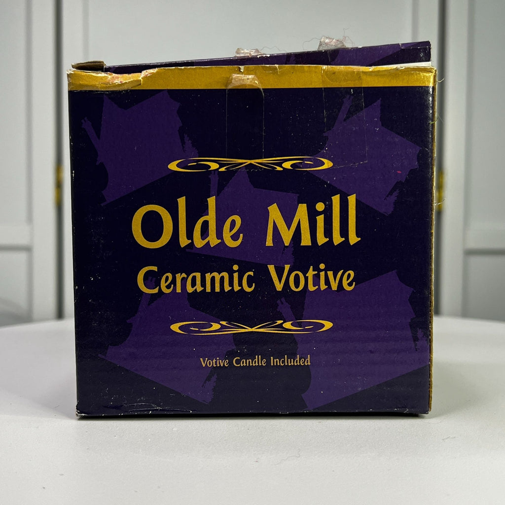 This charming Olde Mill ceramic votive holder brings a nostalgic touch to any space. The intricate design features a quaint watermill with snow-dusted roofs, reminiscent of a winter wonderland scene. Ideal for creating a warm, cozy ambiance, it comes with a votive candle to illuminate its rustic details. Size: 4.5 x 4" tall.