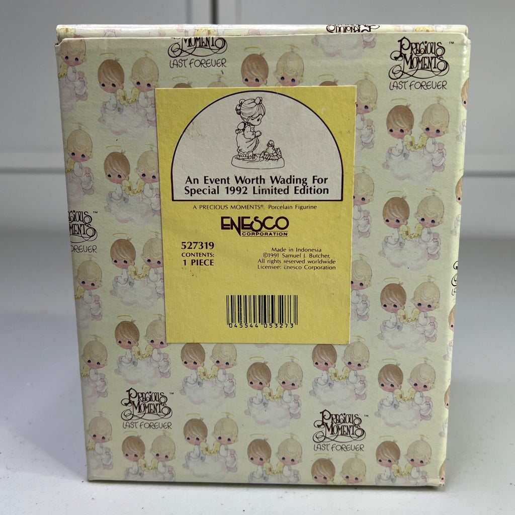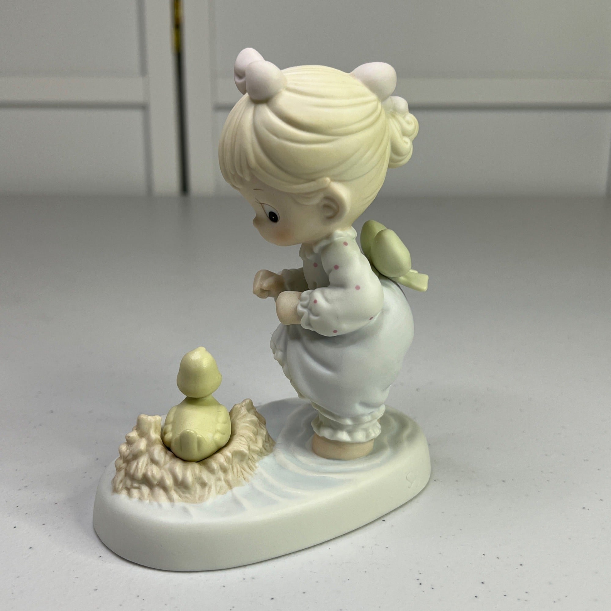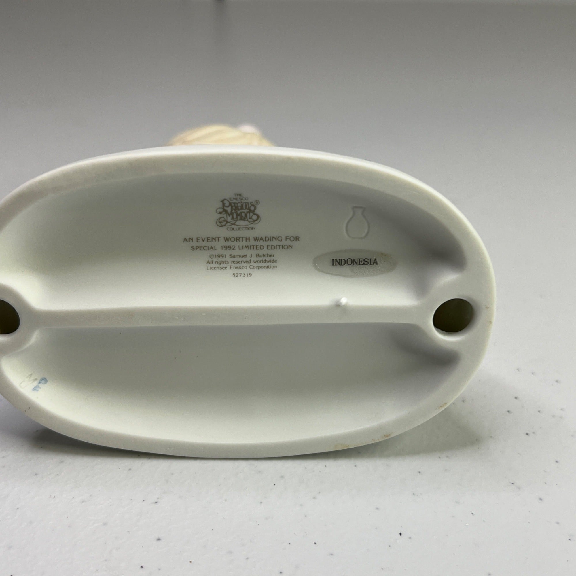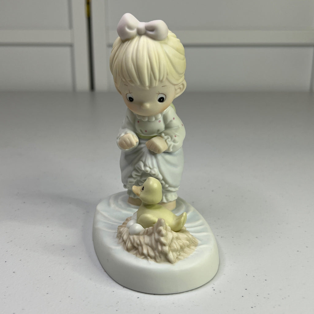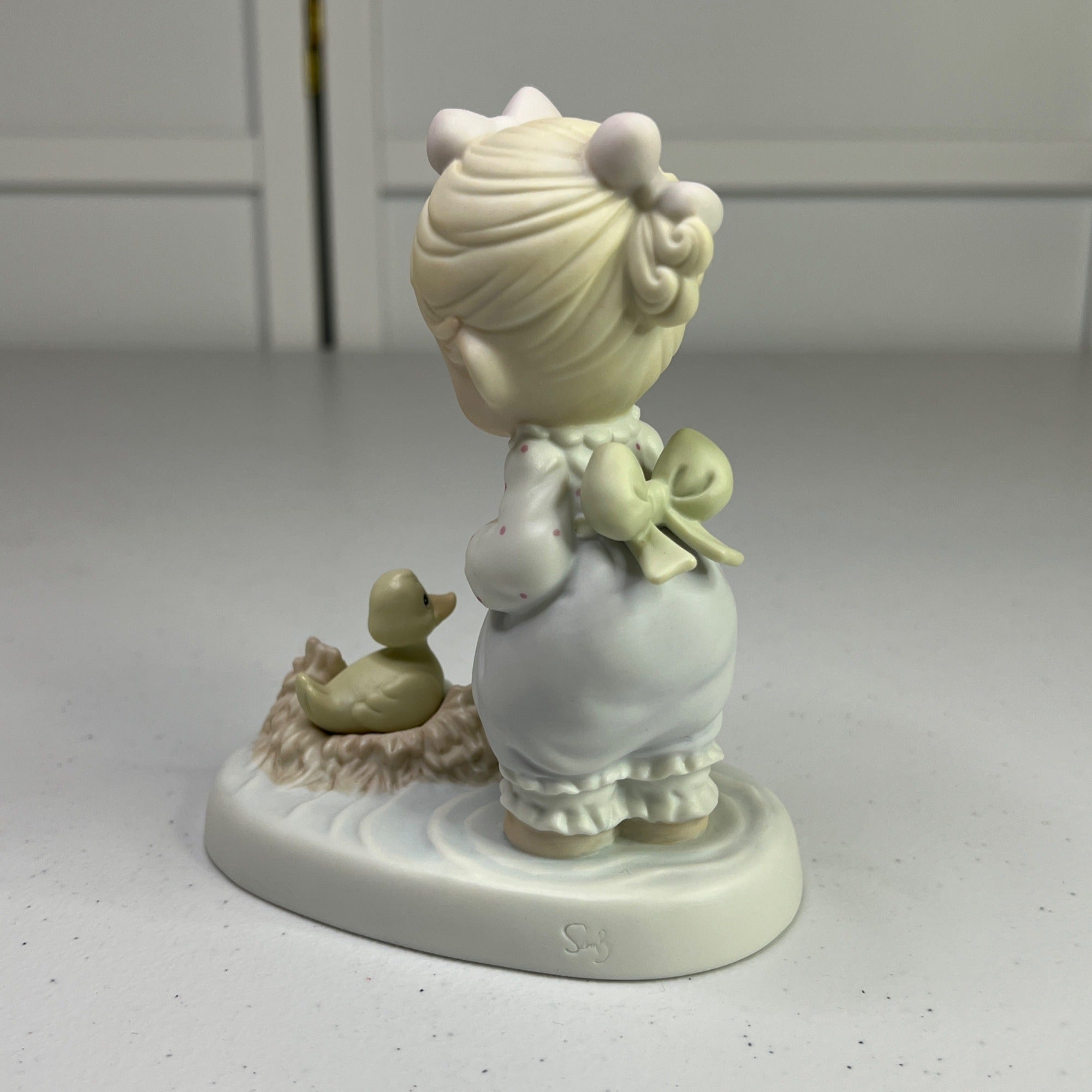 This limited edition porcelain figurine showcases intricate craftsmanship, depicting a child with a duckling. A collectible from Precious Moments, it holds sentimental value. This figurine was produced in 1991.
