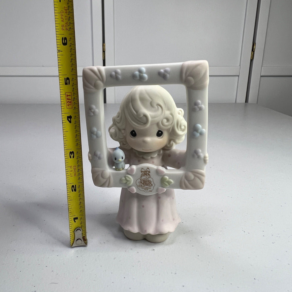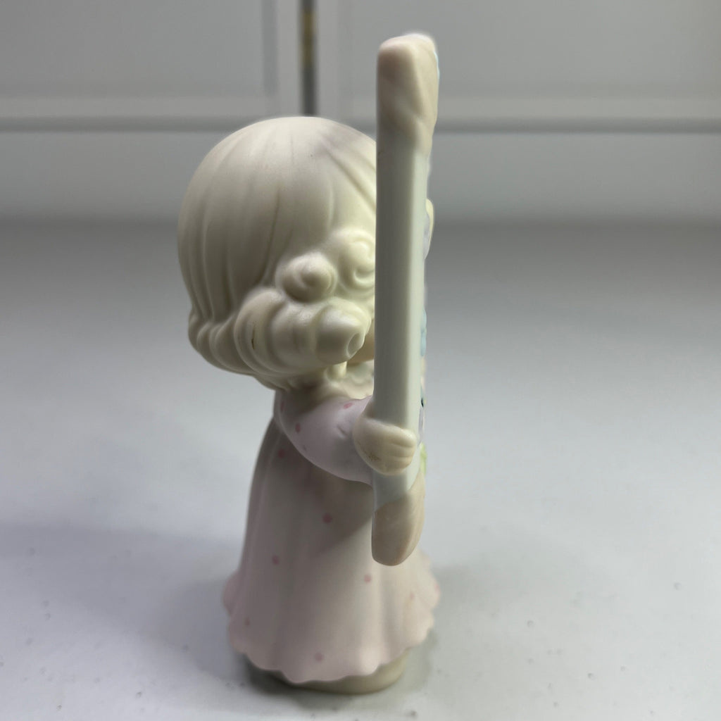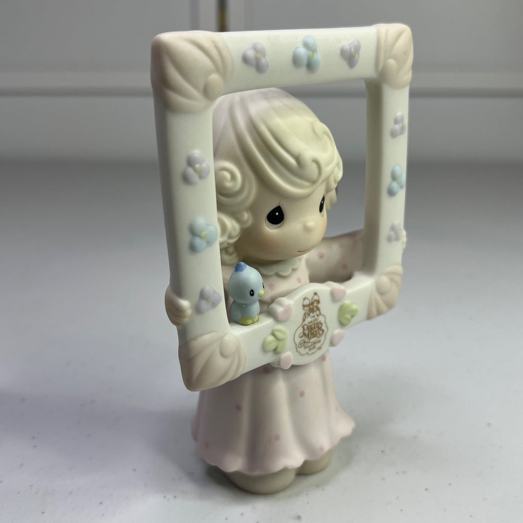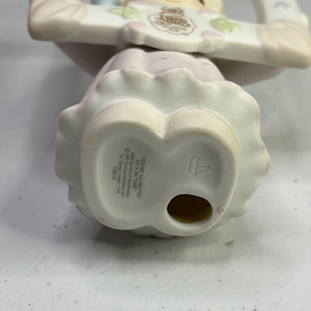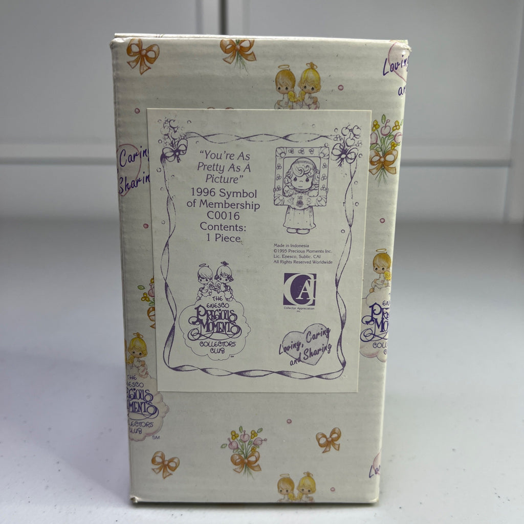 This vintage Precious Moments figurine, "You're As Pretty As A Picture," transports you to a time when craftsmanship and charm were paramount. Crafted in 1996, it pays homage to a bygone era with its delicate details and enchanting design. A timeless piece for collectors and enthusiasts of nostalgic decor. Size: 5" tall.