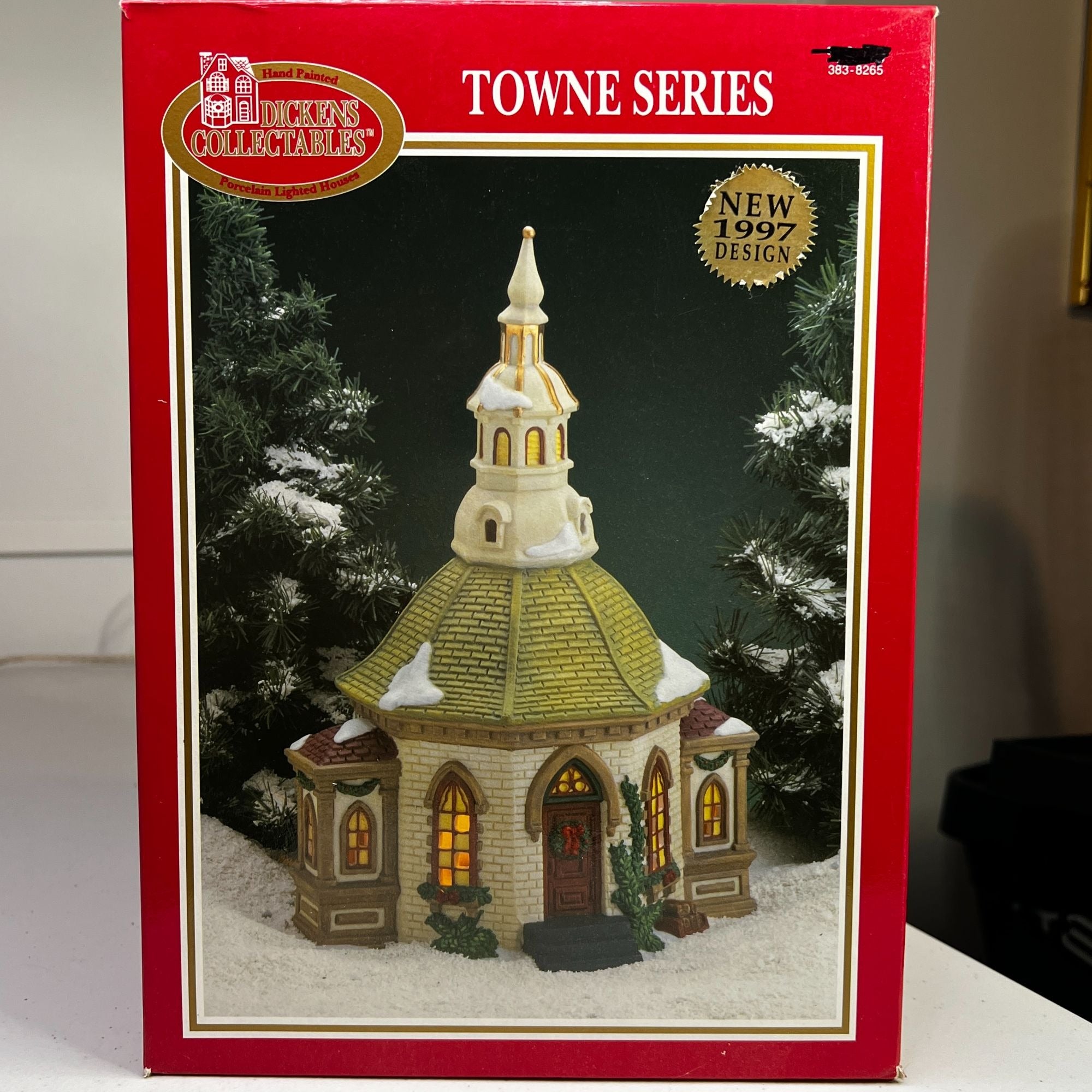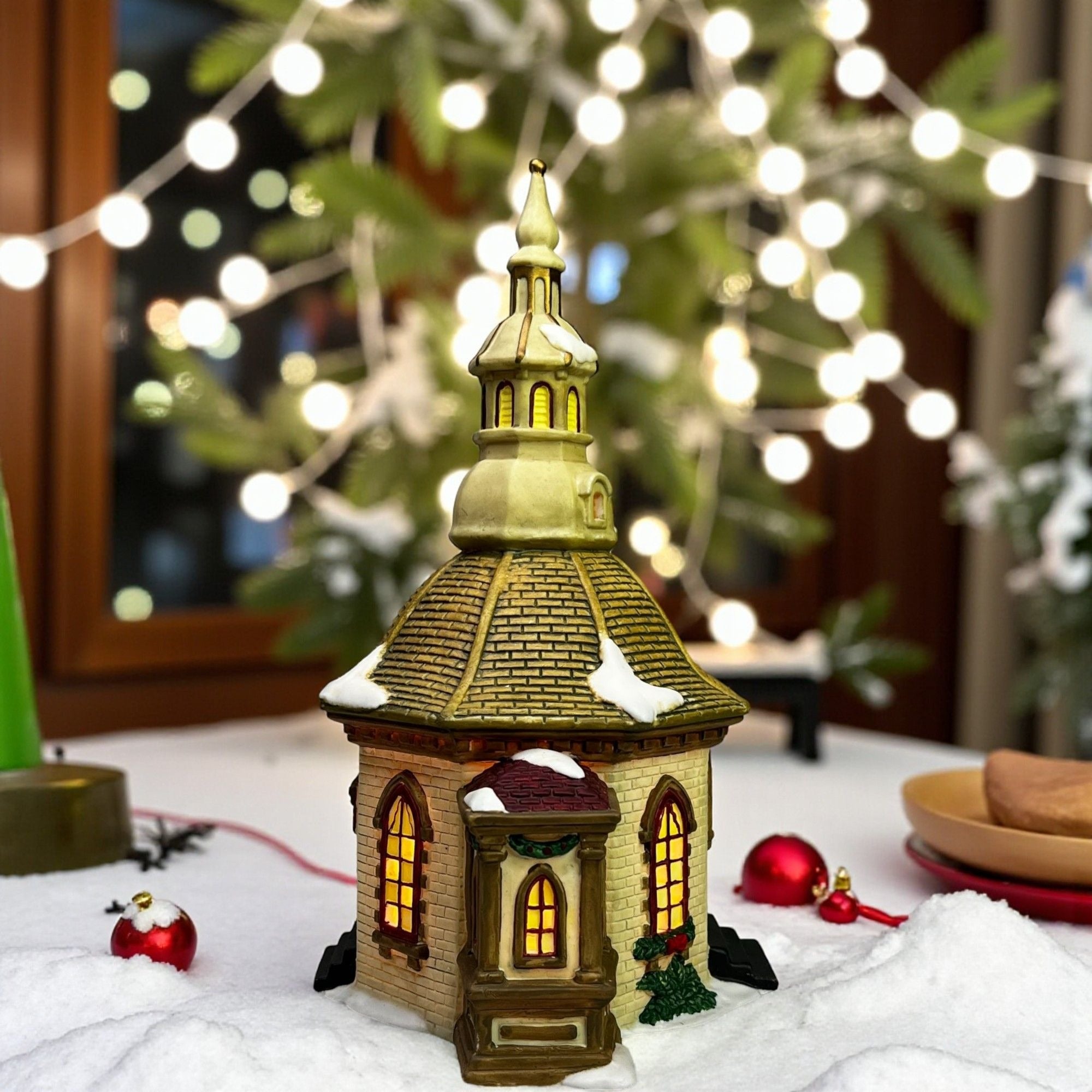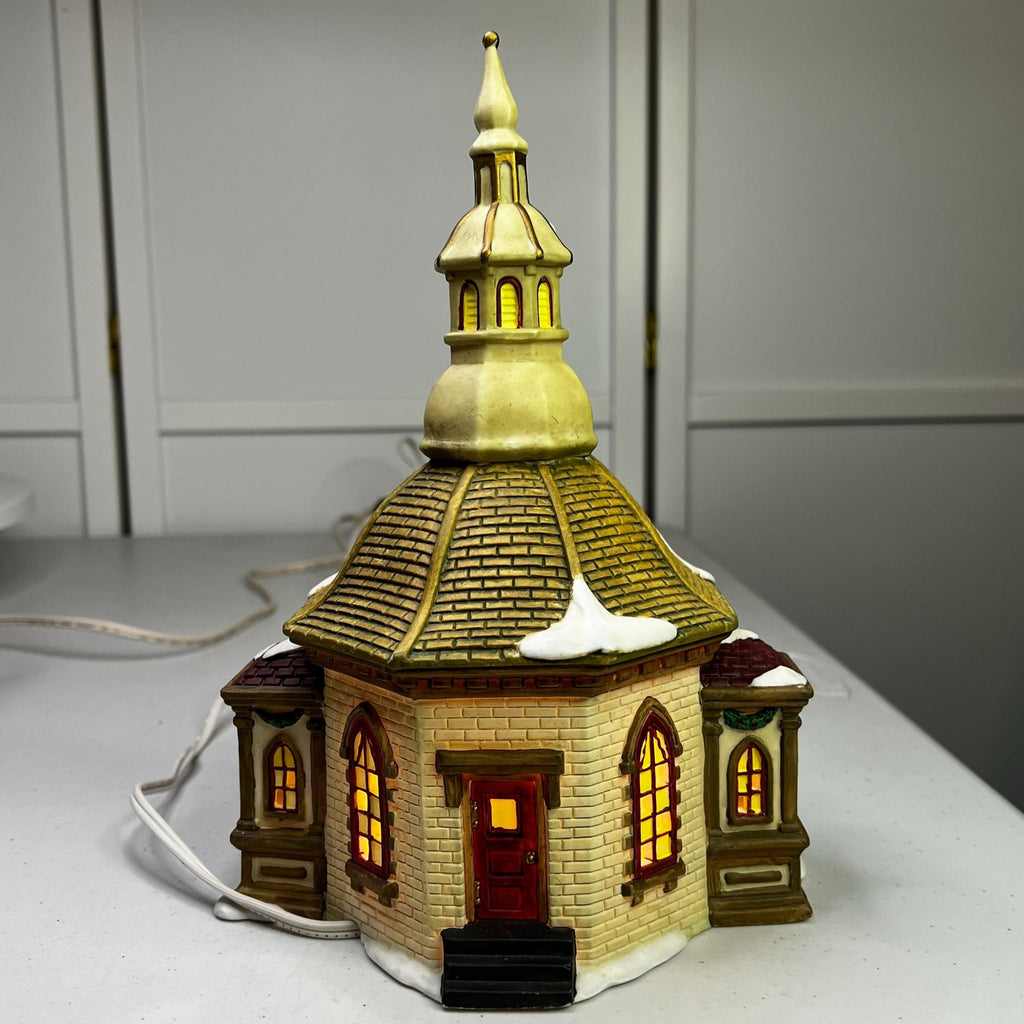 Santa's Workbench Hope Chapel lighted Christmas Village building from 1997. Beautiful hand painted porcelain building. This exquisite Dickens Collectables Towne Series Lighted Church adds a vintage charm to your holiday décor and features warm, inviting lights that create a cozy ambiance reminiscent of traditional Christmas scenes. Its classic architecture and attention to detail evoke memories of a bygone era, making it a cherished addition to any festive display. The Hope Chapel looks beautiful when lit. Size: 9" tall.