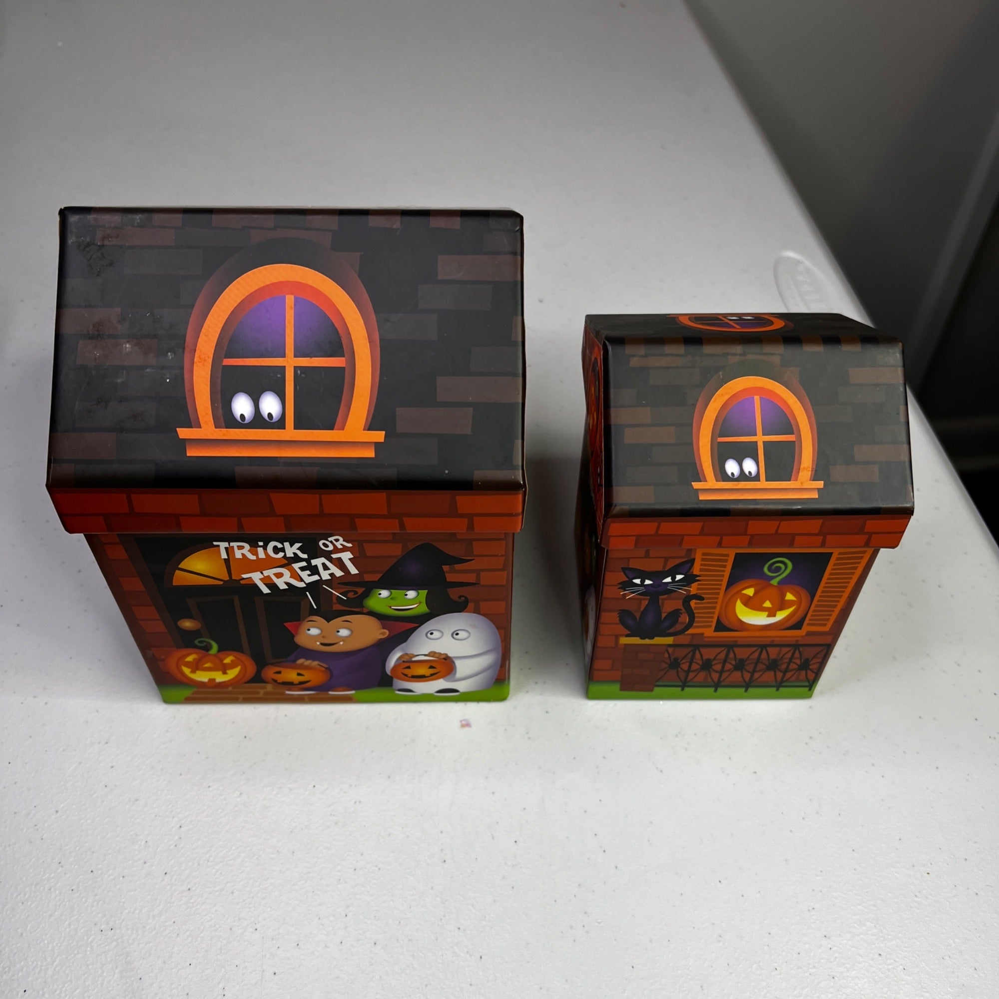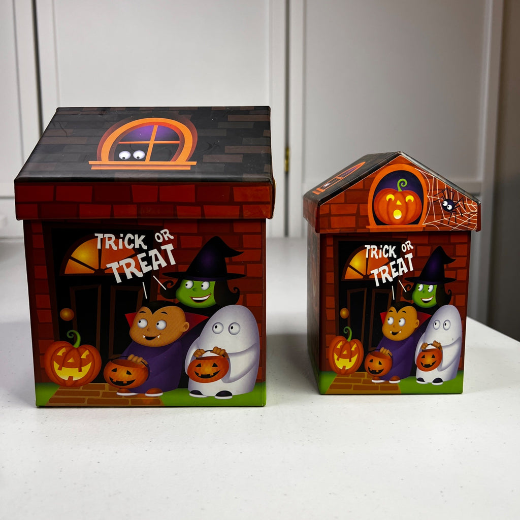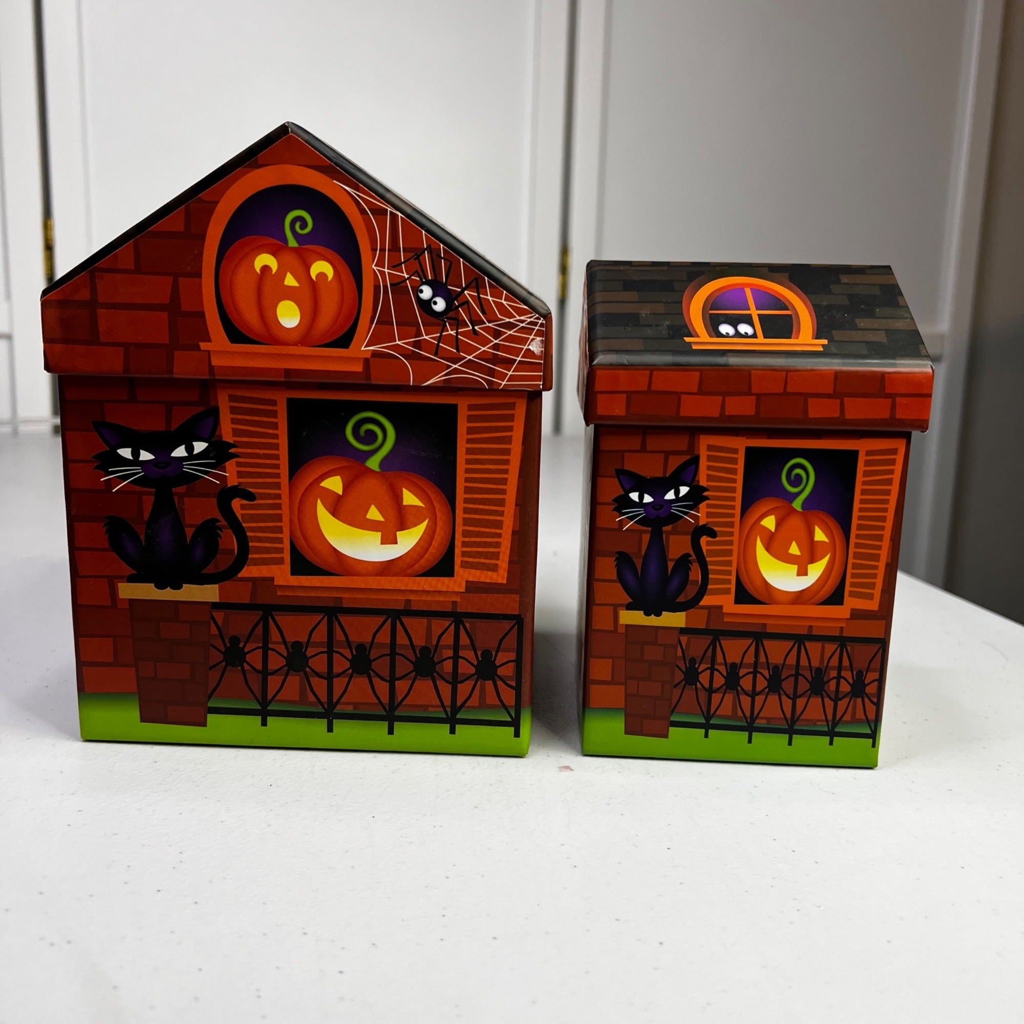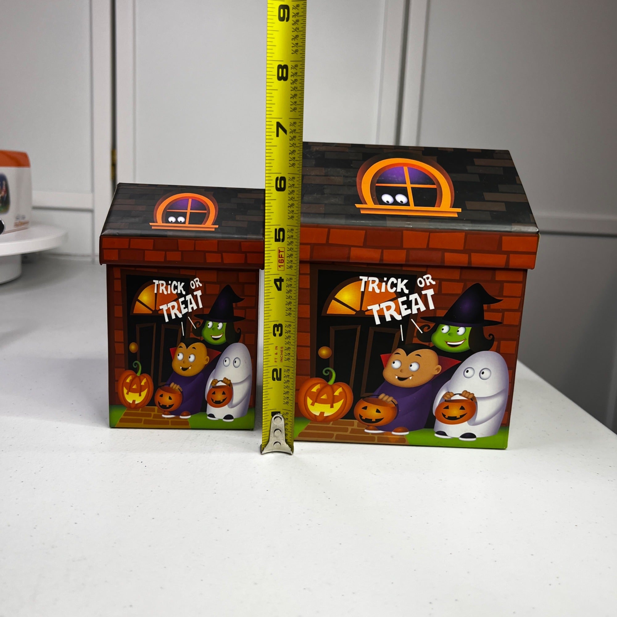 These charming cardboard nesting boxes, with their vintage Halloween motif, evoke nostalgia for autumn evenings of yore. Adorned with classic spooky icons, they provide both decorative flair and functional storage. A delightful addition to any festive arrangement, these boxes capture the essence of bygone holiday festivities, inviting memories of simpler times. The larger house stands 7" tall and the smaller one fits inside it.