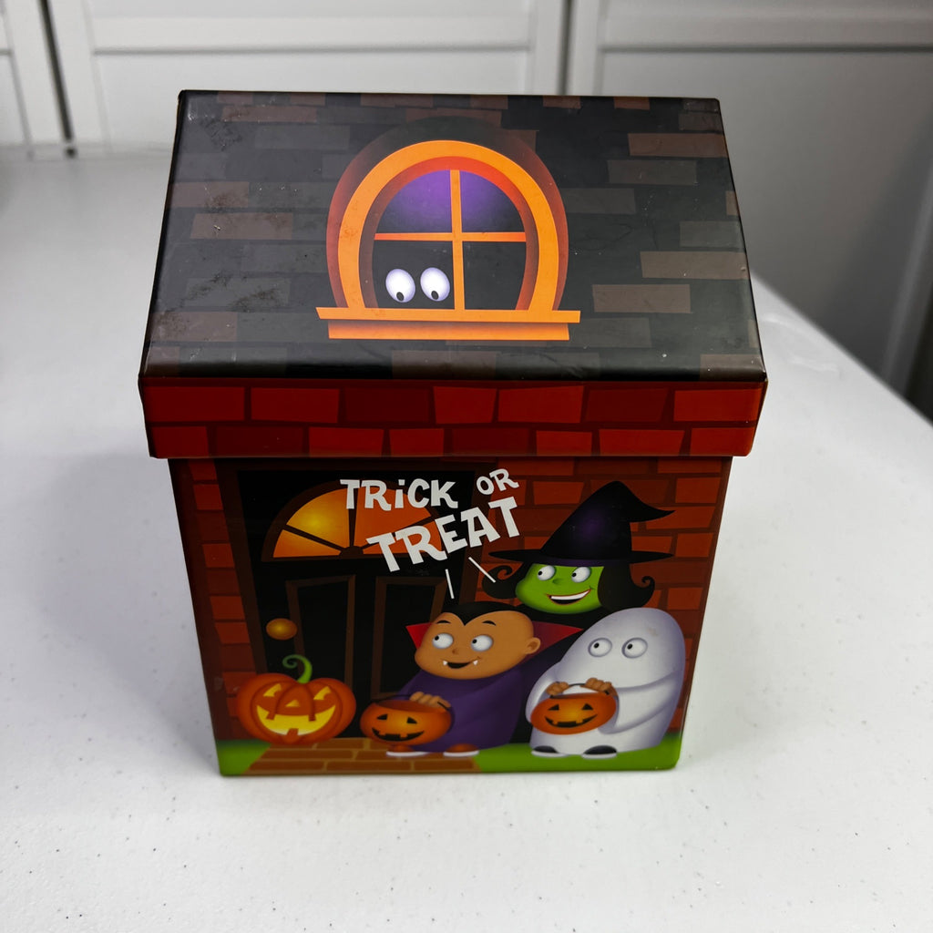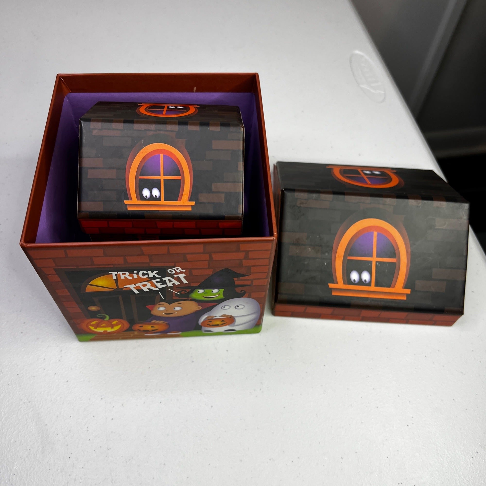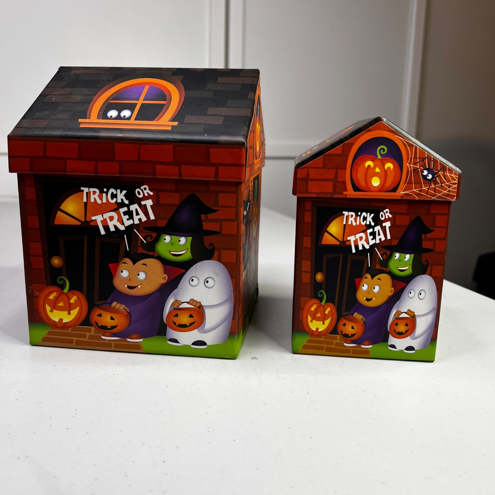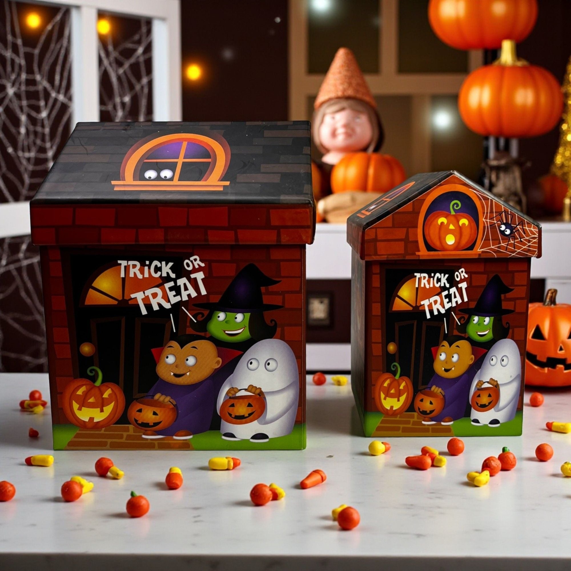 These charming cardboard nesting boxes, with their vintage Halloween motif, evoke nostalgia for autumn evenings of yore. Adorned with classic spooky icons, they provide both decorative flair and functional storage. A delightful addition to any festive arrangement, these boxes capture the essence of bygone holiday festivities, inviting memories of simpler times. The larger house stands 7" tall and the smaller one fits inside it.