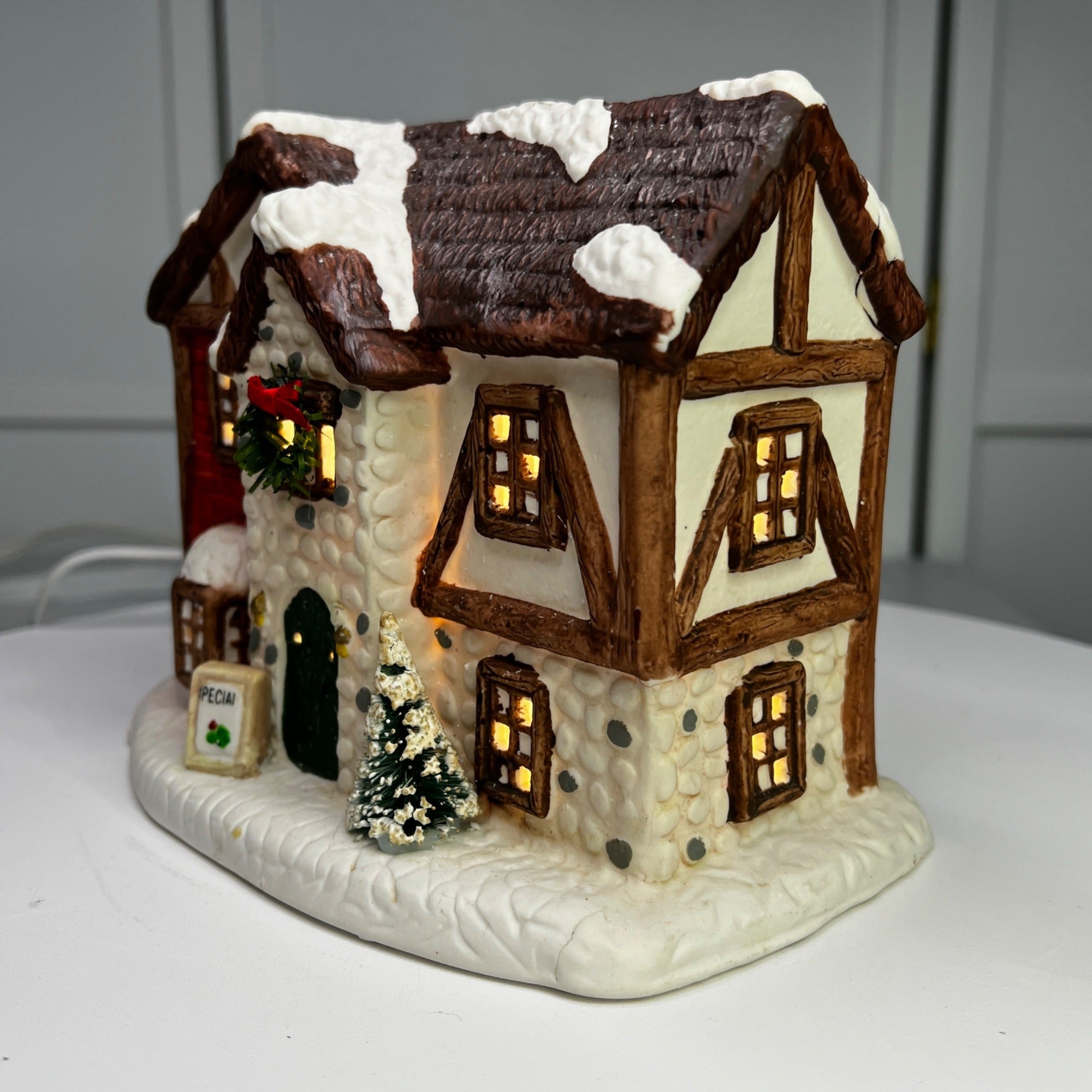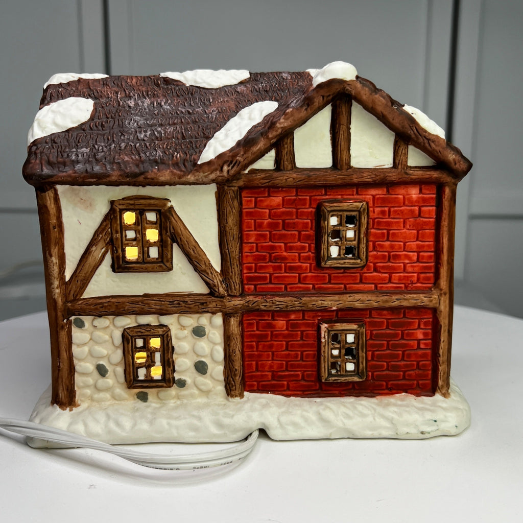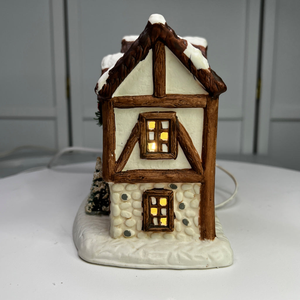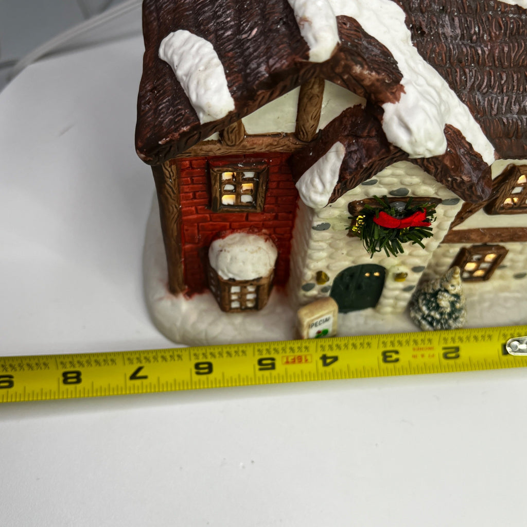 This 1992 ceramic lighted Christmas village house evokes nostalgia with its lighted interior for a cozy ambiance, intricate snowy details, warm glow, and timeless charm for holiday décor. Despite it's flaws this building still looks beautiful when lit. Size: 6 x 7"