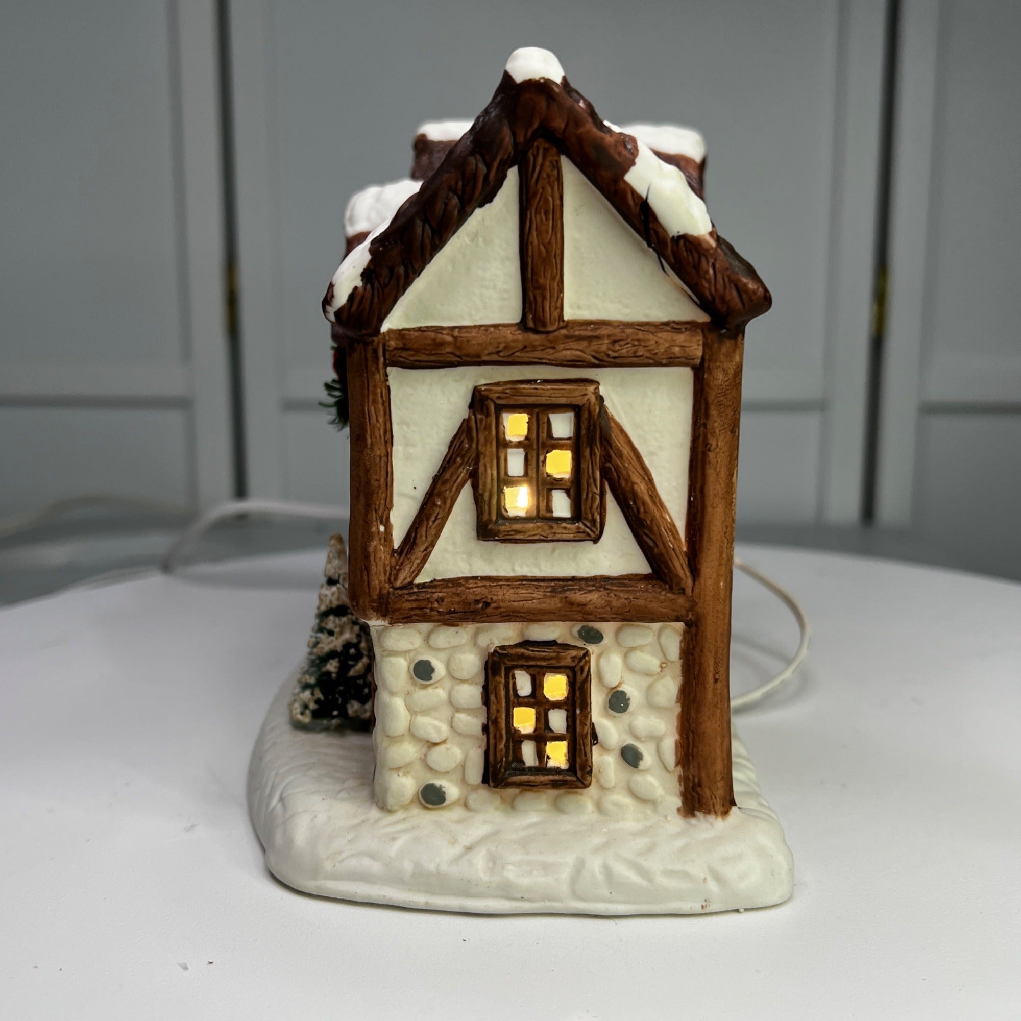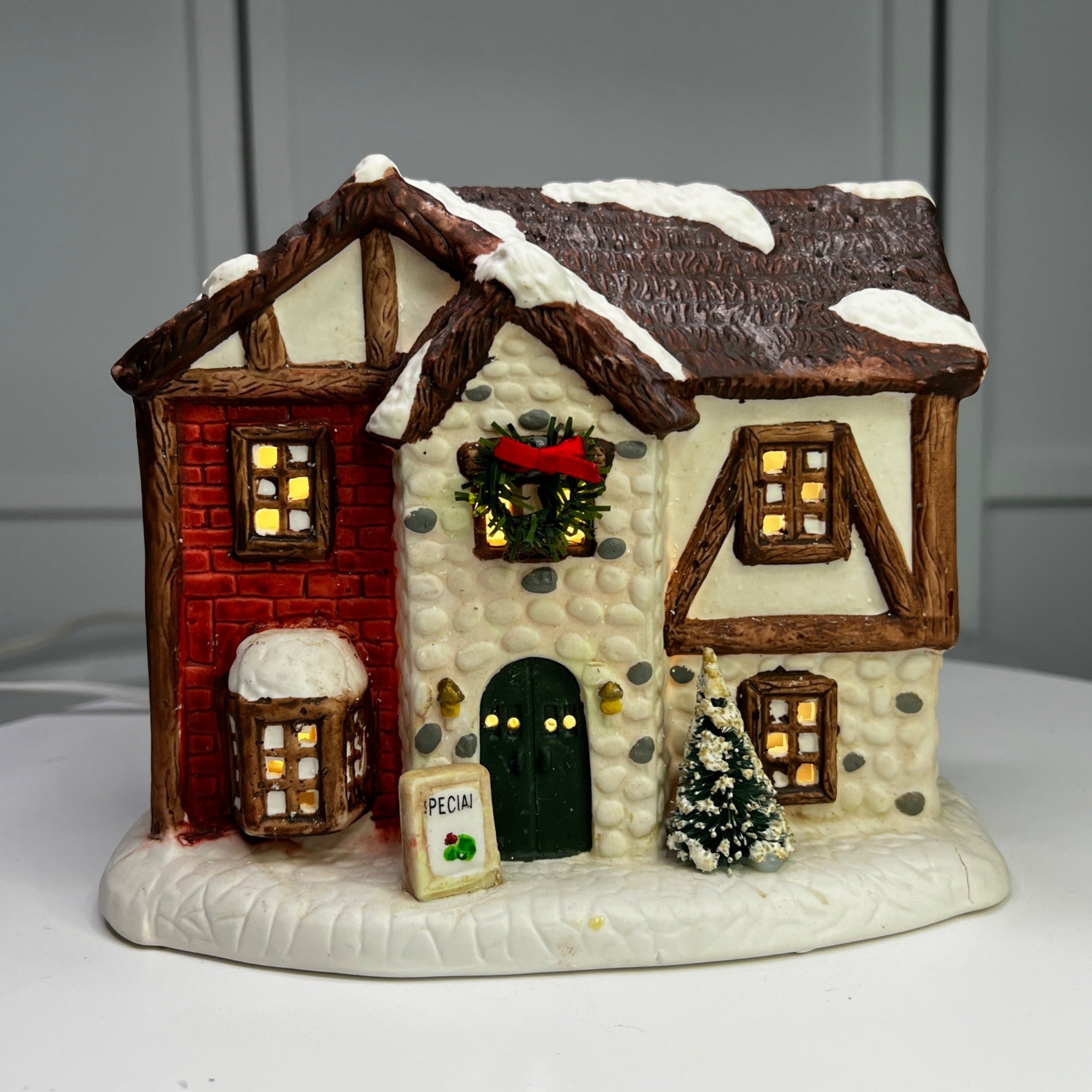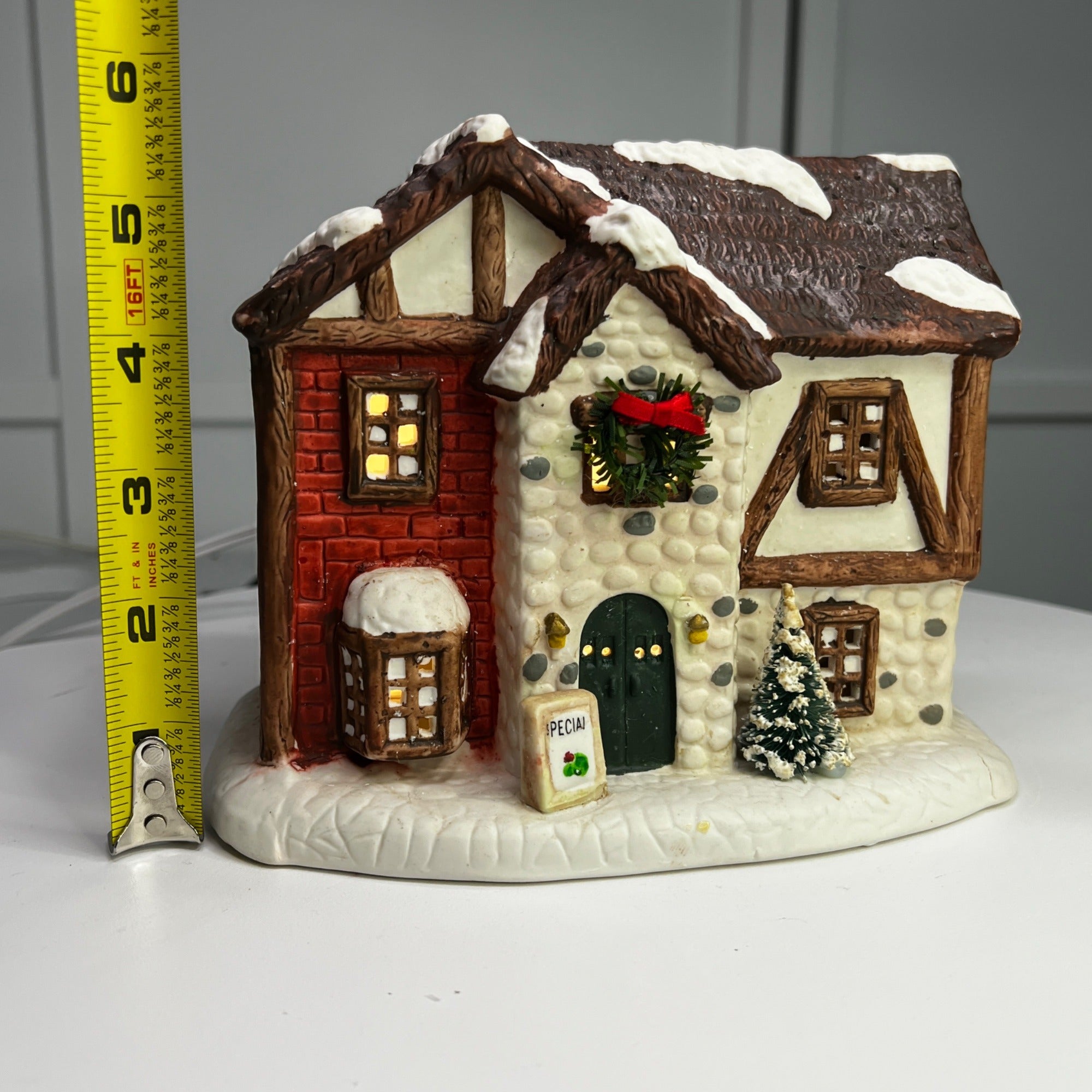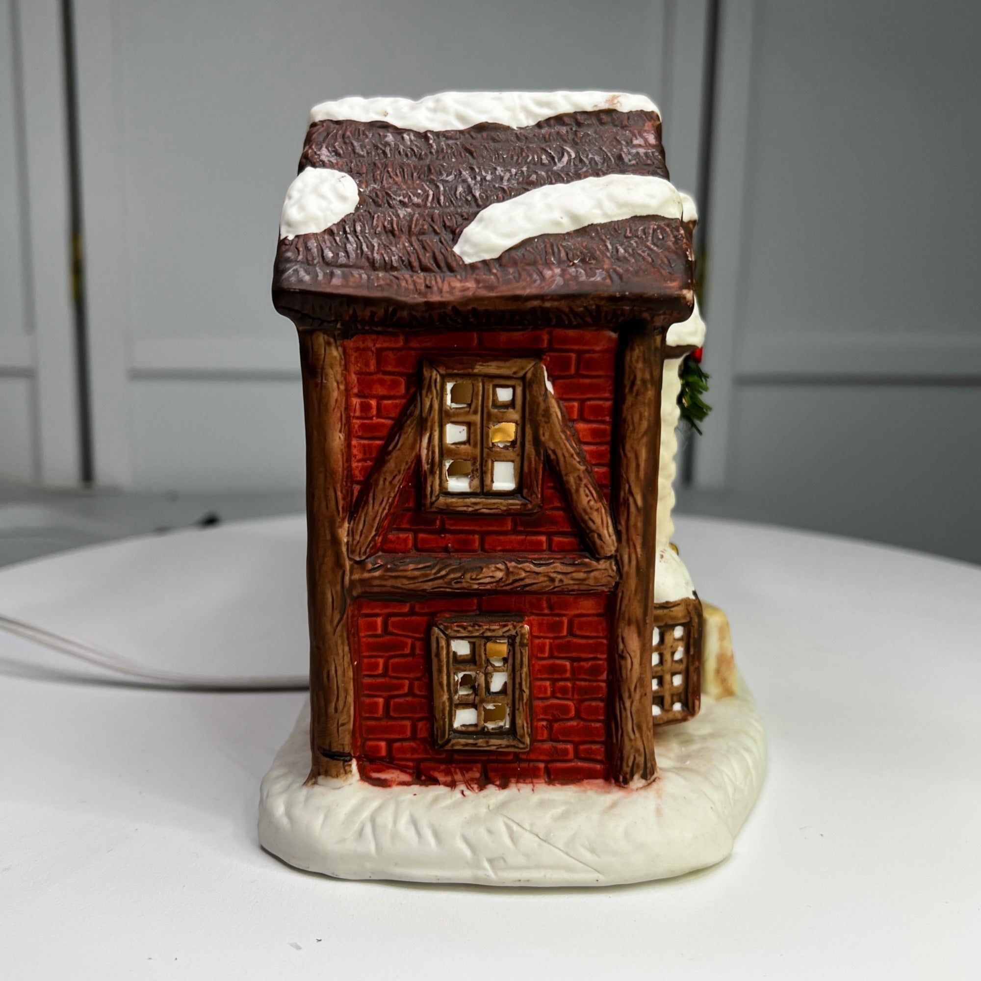 This 1992 ceramic lighted Christmas village house evokes nostalgia with its lighted interior for a cozy ambiance, intricate snowy details, warm glow, and timeless charm for holiday décor. Despite it's flaws this building still looks beautiful when lit. Size: 6 x 7"