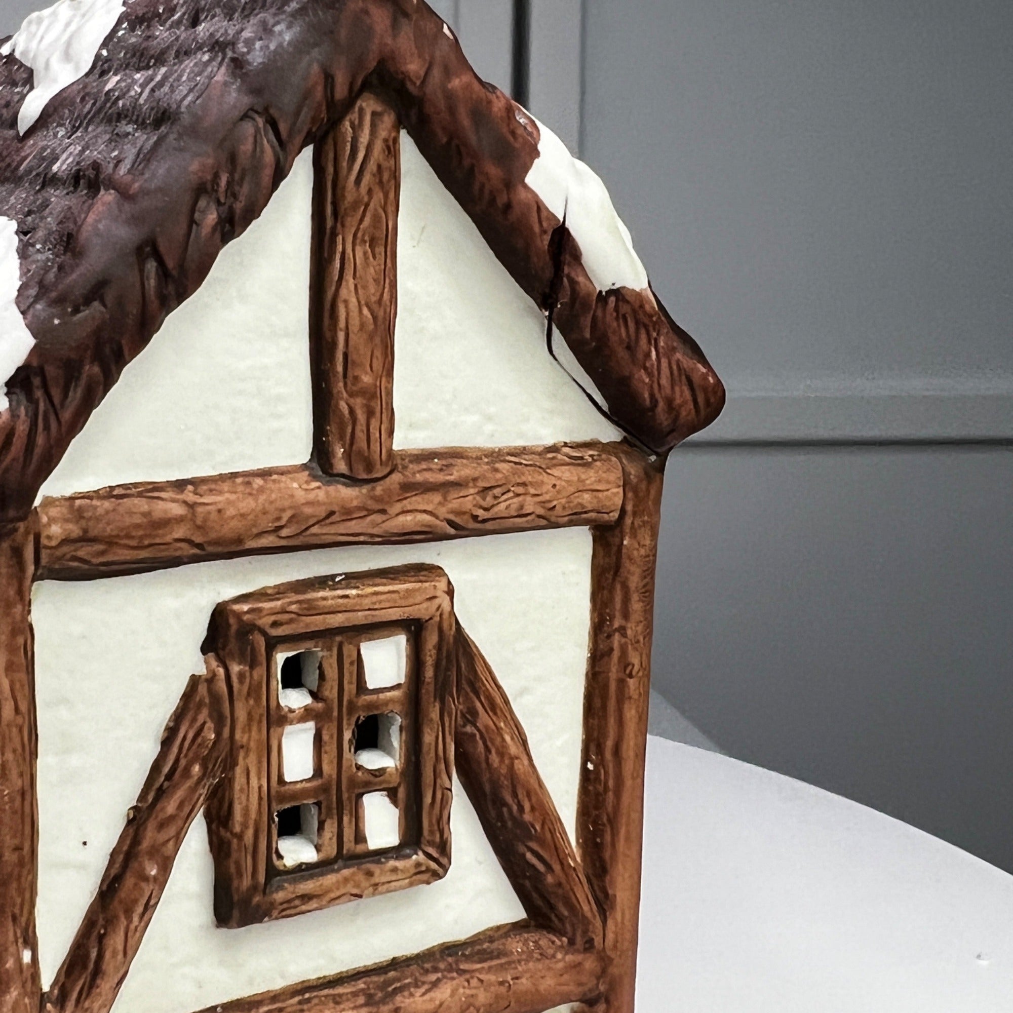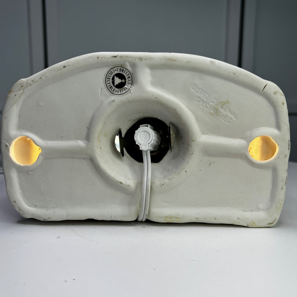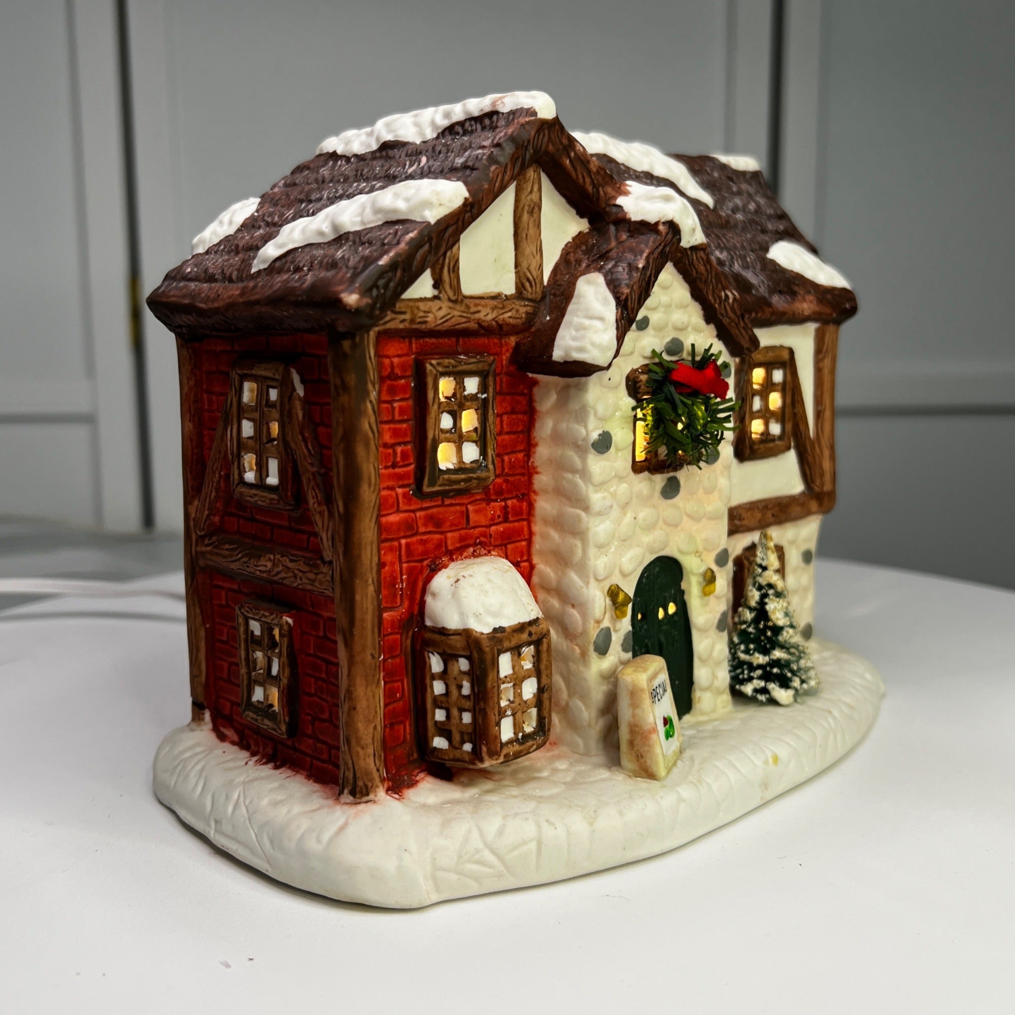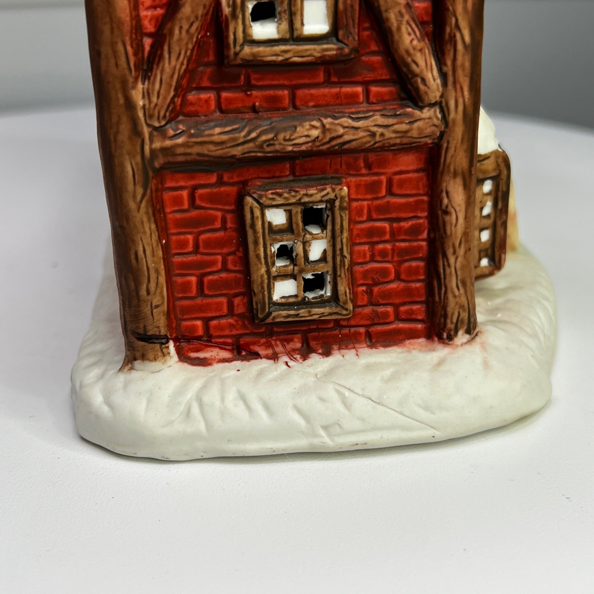 This 1992 ceramic lighted Christmas village house evokes nostalgia with its lighted interior for a cozy ambiance, intricate snowy details, warm glow, and timeless charm for holiday décor. Despite it's flaws this building still looks beautiful when lit. Size: 6 x 7"