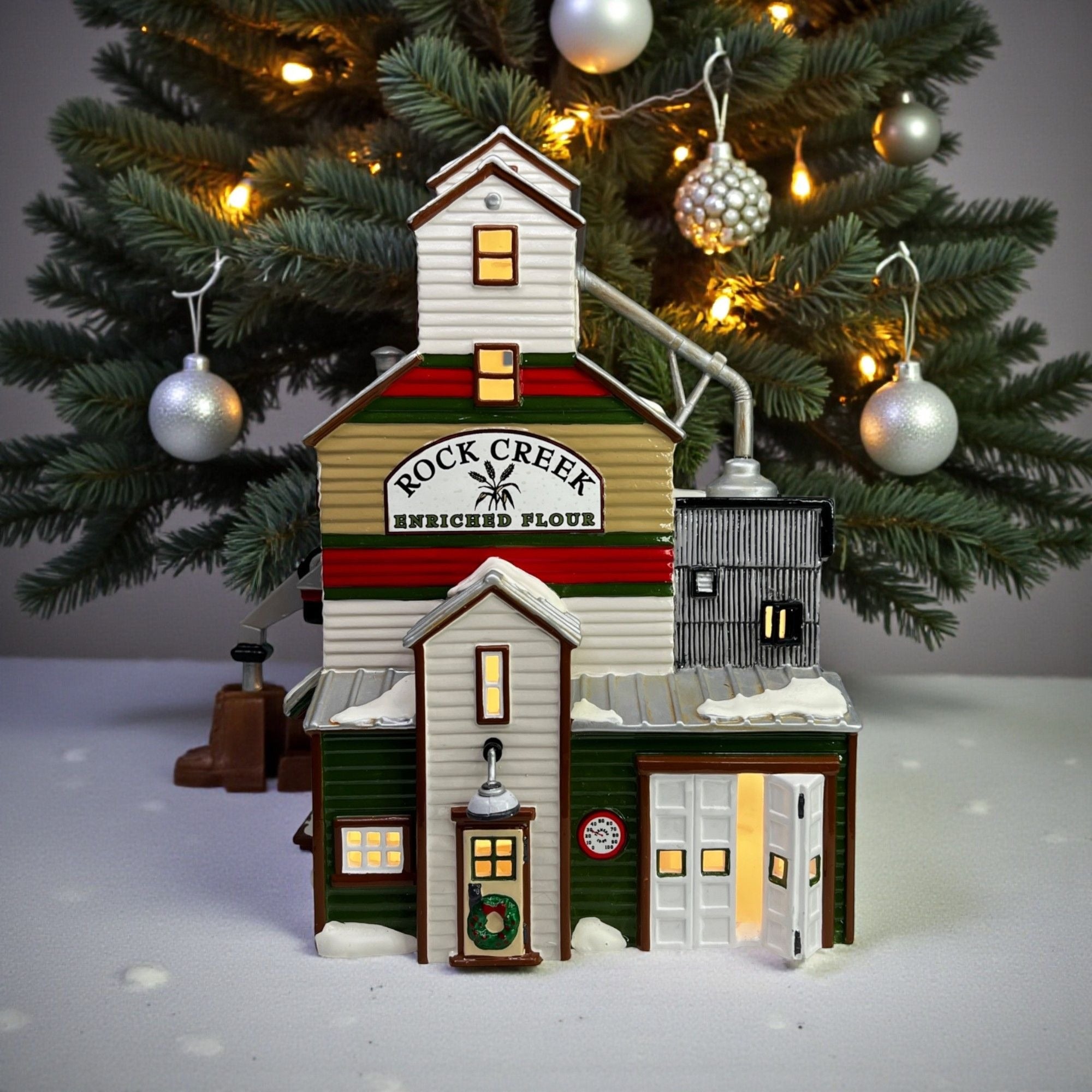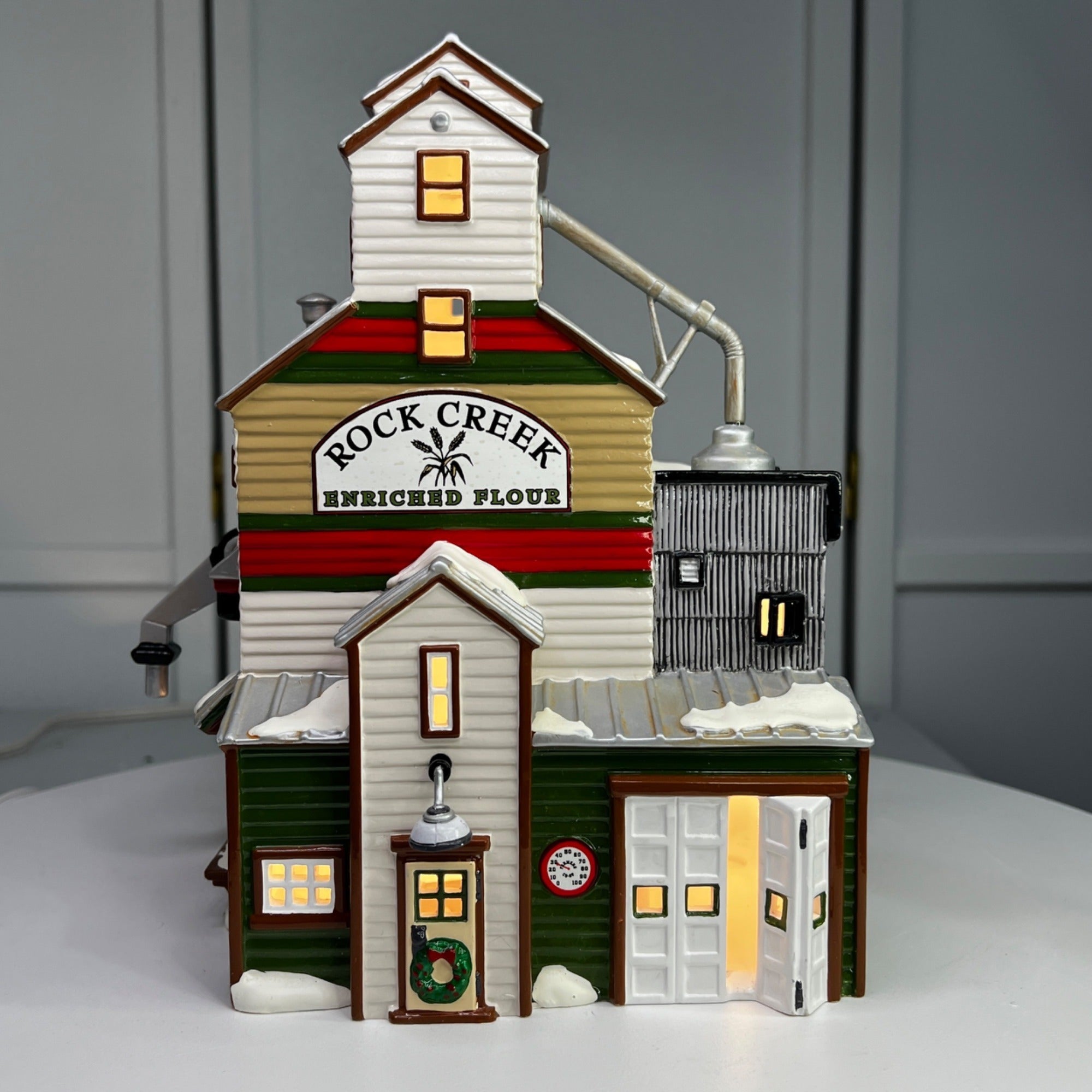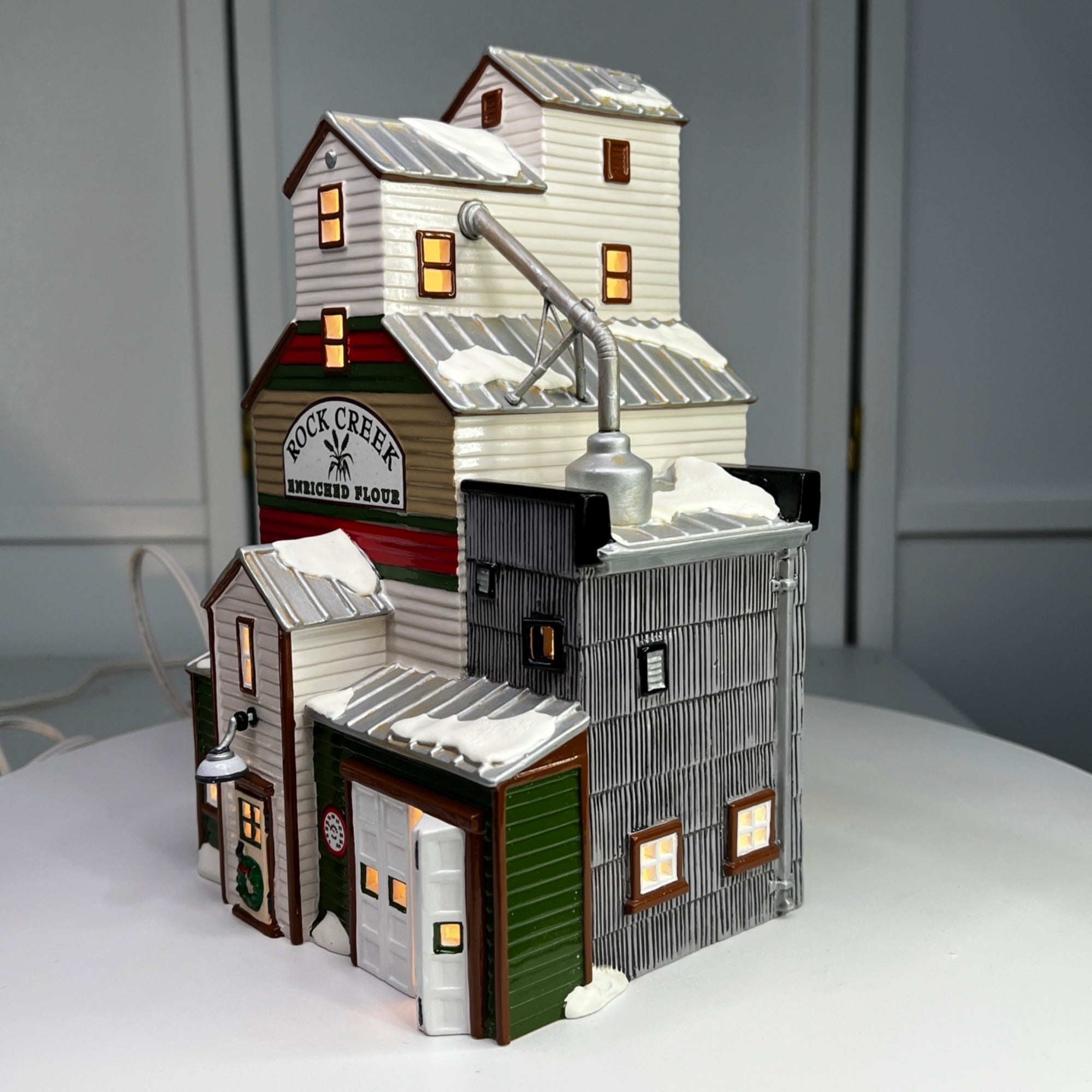 This beautiful Christmas collectible makes a classy addition to any village collection. The Farmer's Co-Op Granary is in good condition for being 25 years old and has beautiful artwork, color and design, each piece is properly marked on the bottom of the piece. Comes with protective case and sleeve (sleeve has wear) and light cord.