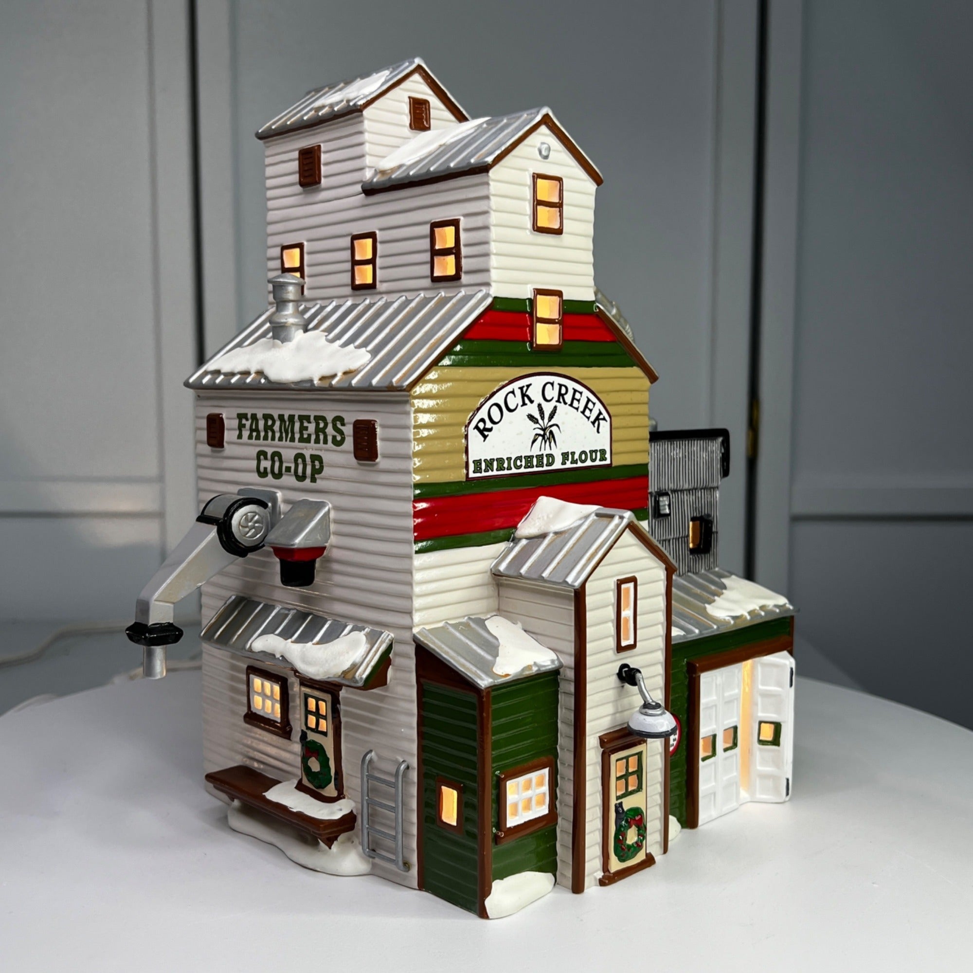Dept 56 Snow Village The Farmer's Co-op Granary lighted Christmas building from 1999. Very beautiful hand-painted porcelain lighted house in the The Original Snow Village Series. When The Tractors, Trucks and Combines Are Put Away For the Season, Farmers Gather Down By the Co-op. The Farmer's Co-Op Granary looks beautiful when lit. Size: 11" x 9" x 8".