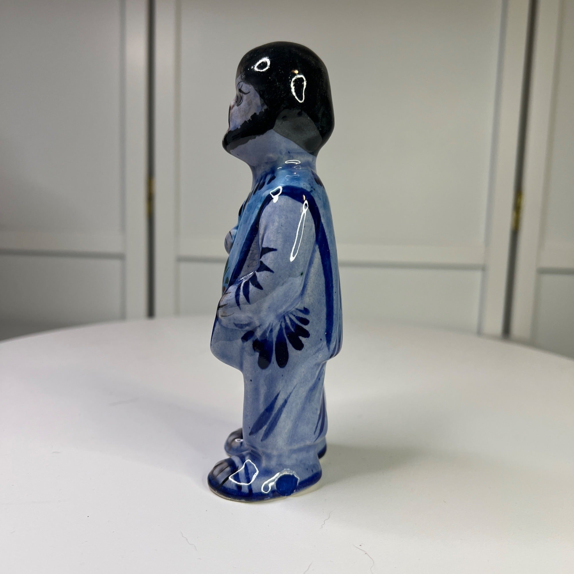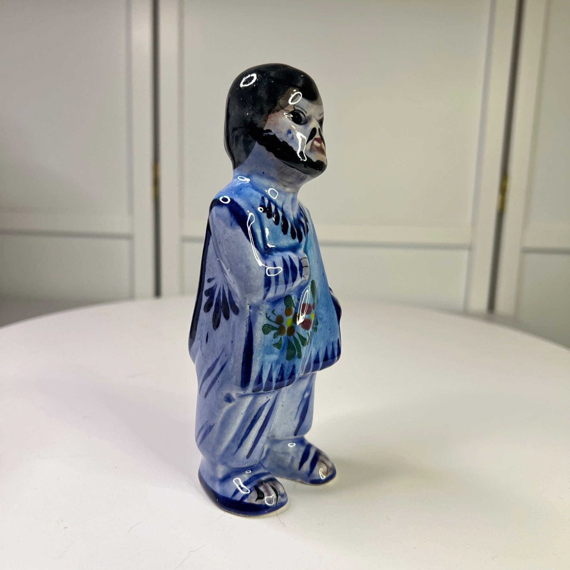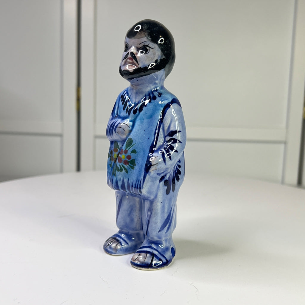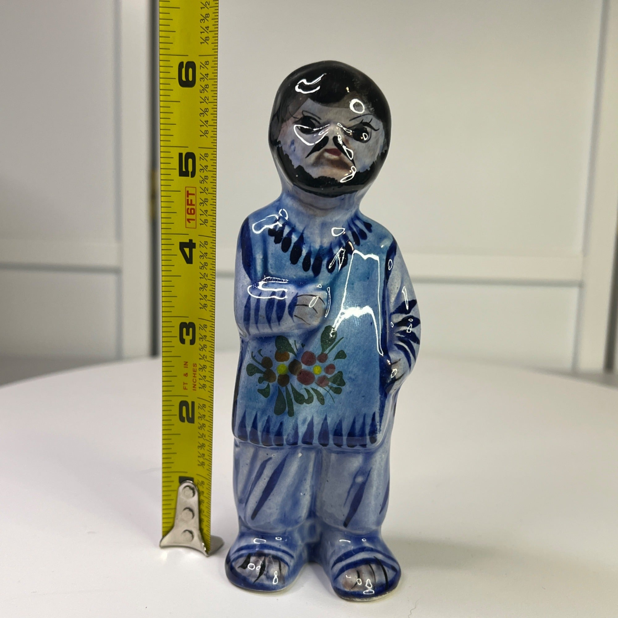 This vintage Tonala Mexican pottery figurine showcases traditional craftsmanship with its hand-painted detailing. Standing at 6 inches tall, it's a charming example of Mexican artistry. Its blue hues and intricate patterns add a cultural touch to any collection.