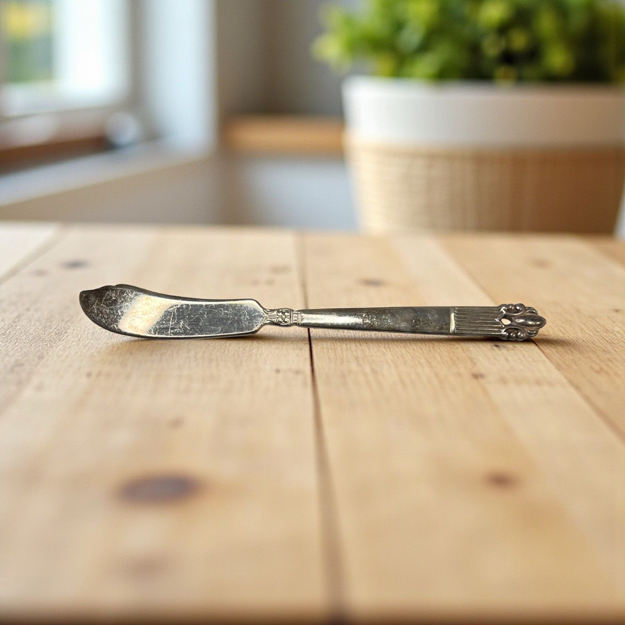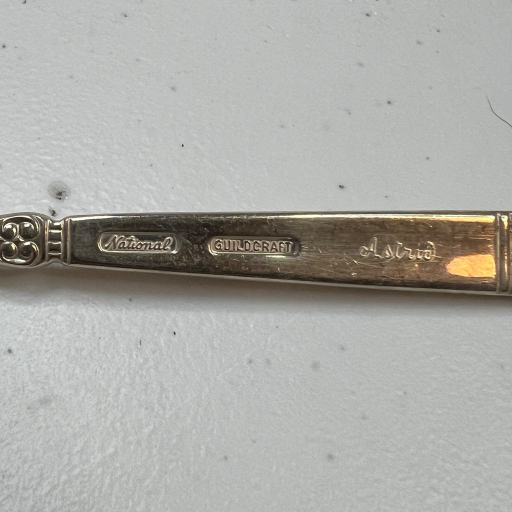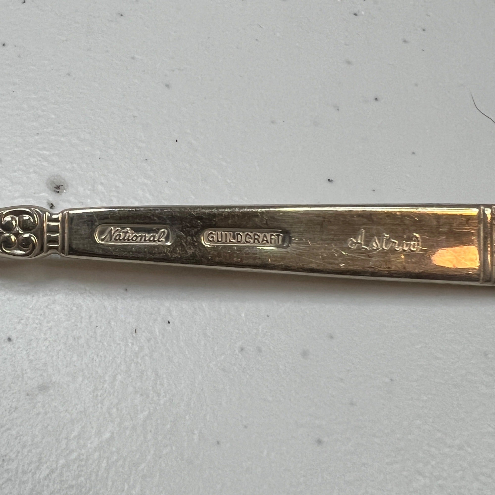 This vintage butter spreader from the 1970s showcases the elegant Astrid pattern by National Guildcraft, making it a refined choice for collectors or those enhancing a classic table setting. Its timeless design complements a sophisticated dining experience, adding a touch of history to your collection or serving needs.