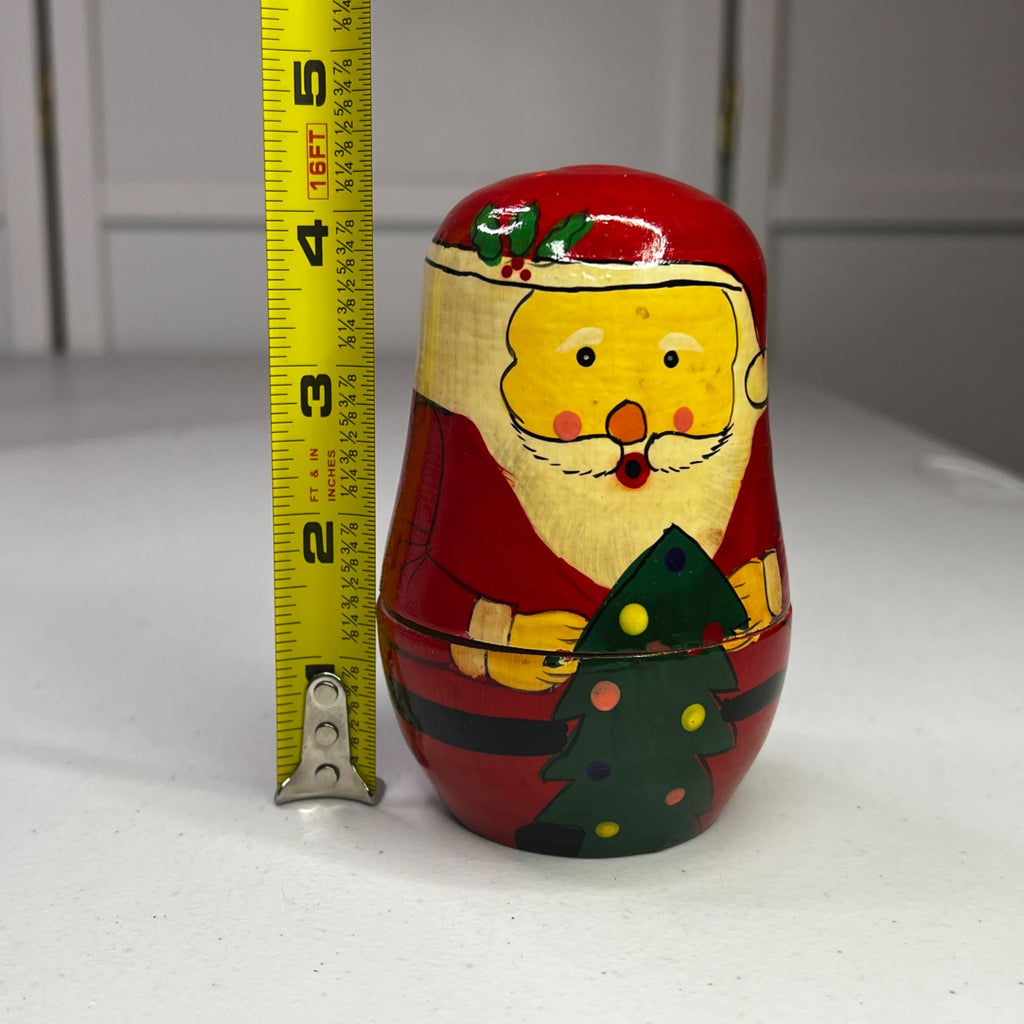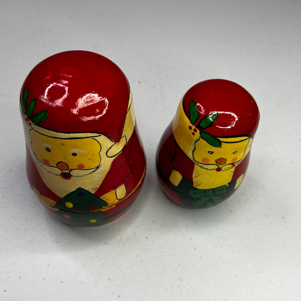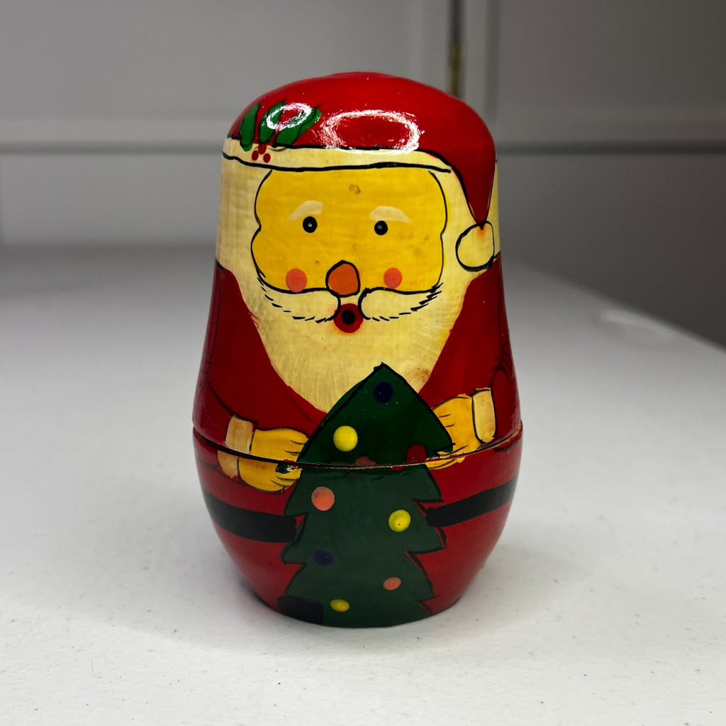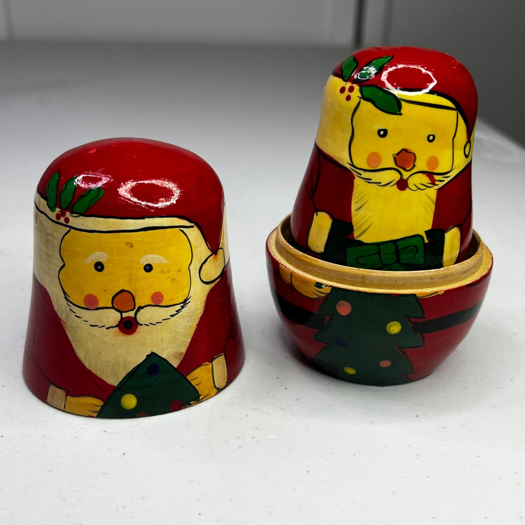 These delightful vintage Santa Claus nesting dolls are hand-painted in vibrant red and yellow hues. Each doll embodies the classic charm of Russian matryoshka art, showcasing intricate detailing and craftsmanship. A nostalgic addition to holiday decor that captures the magic of Christmas with a touch of old-world elegance.