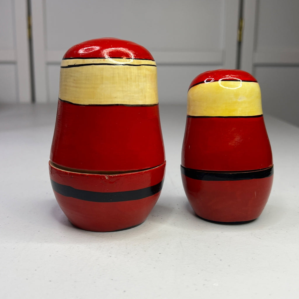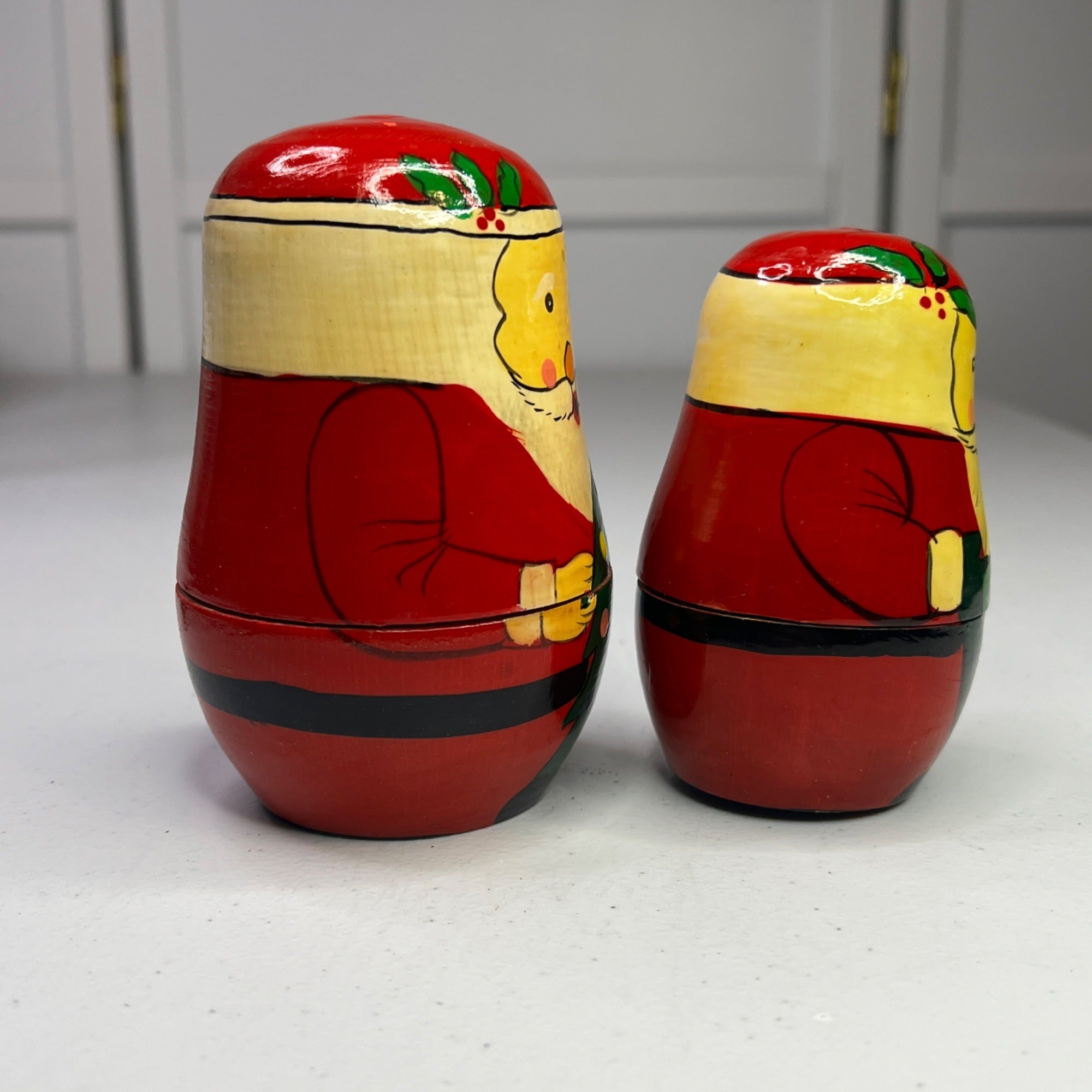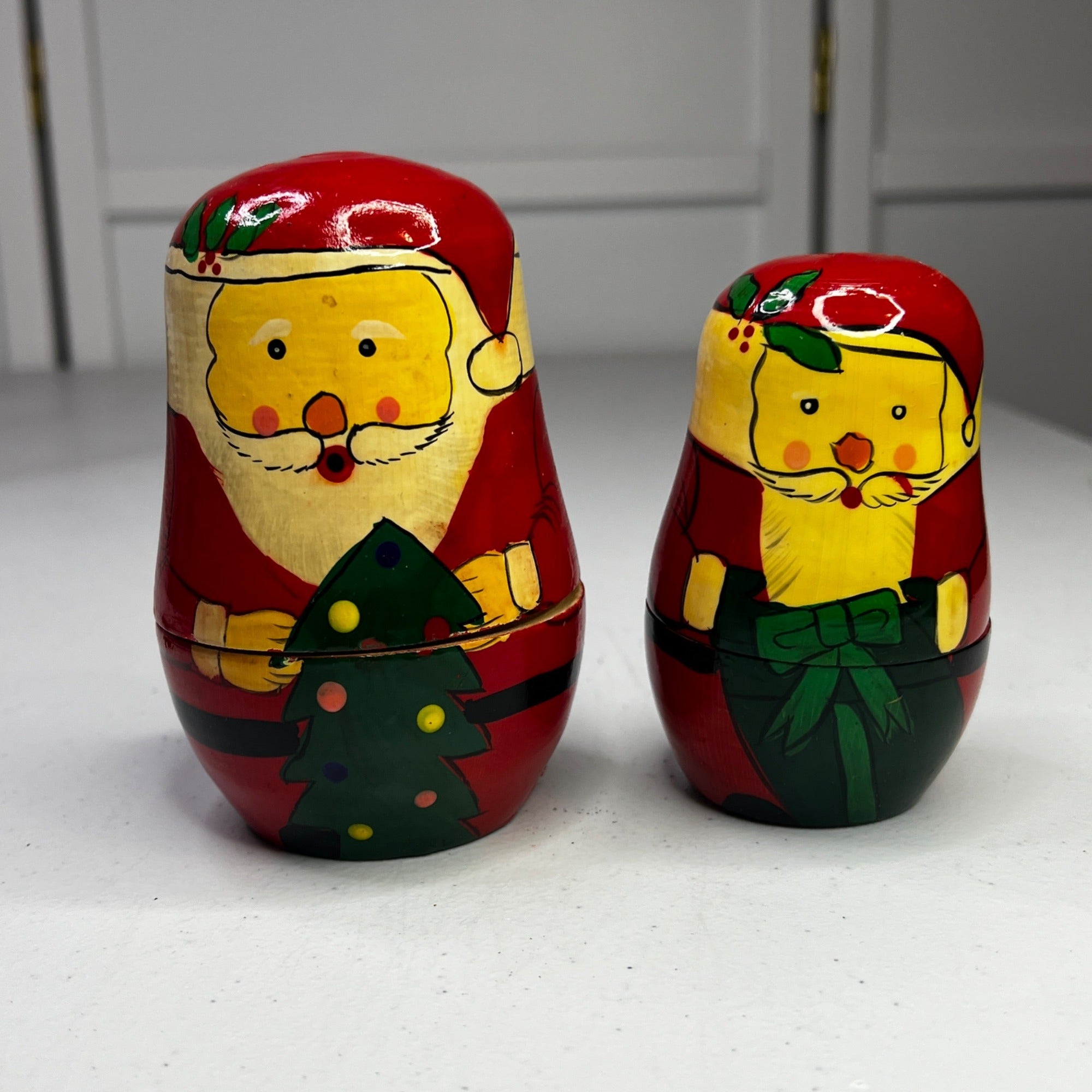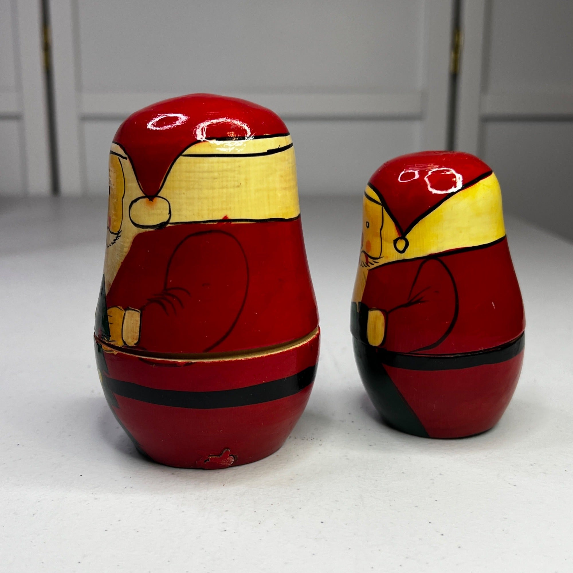These delightful vintage Santa Claus nesting dolls are hand-painted in vibrant red and yellow hues. Each doll embodies the classic charm of Russian matryoshka art, showcasing intricate detailing and craftsmanship. A nostalgic addition to holiday decor that captures the magic of Christmas with a touch of old-world elegance.