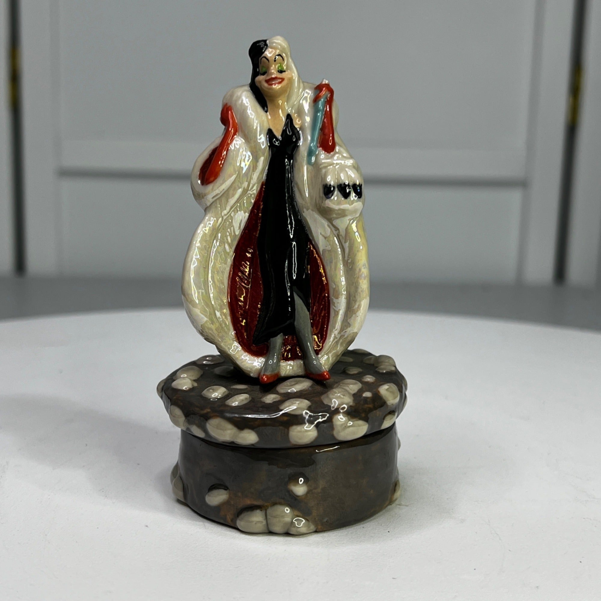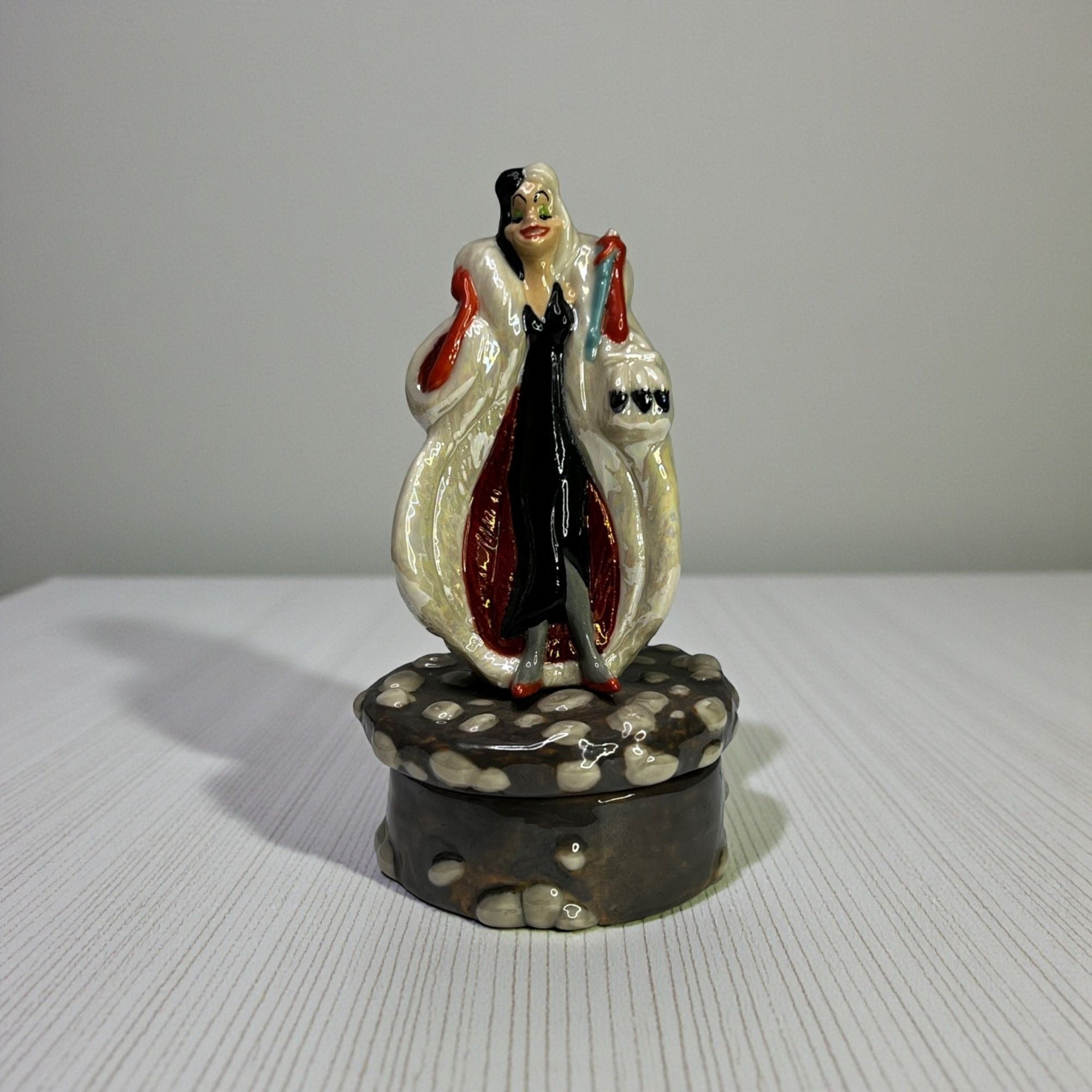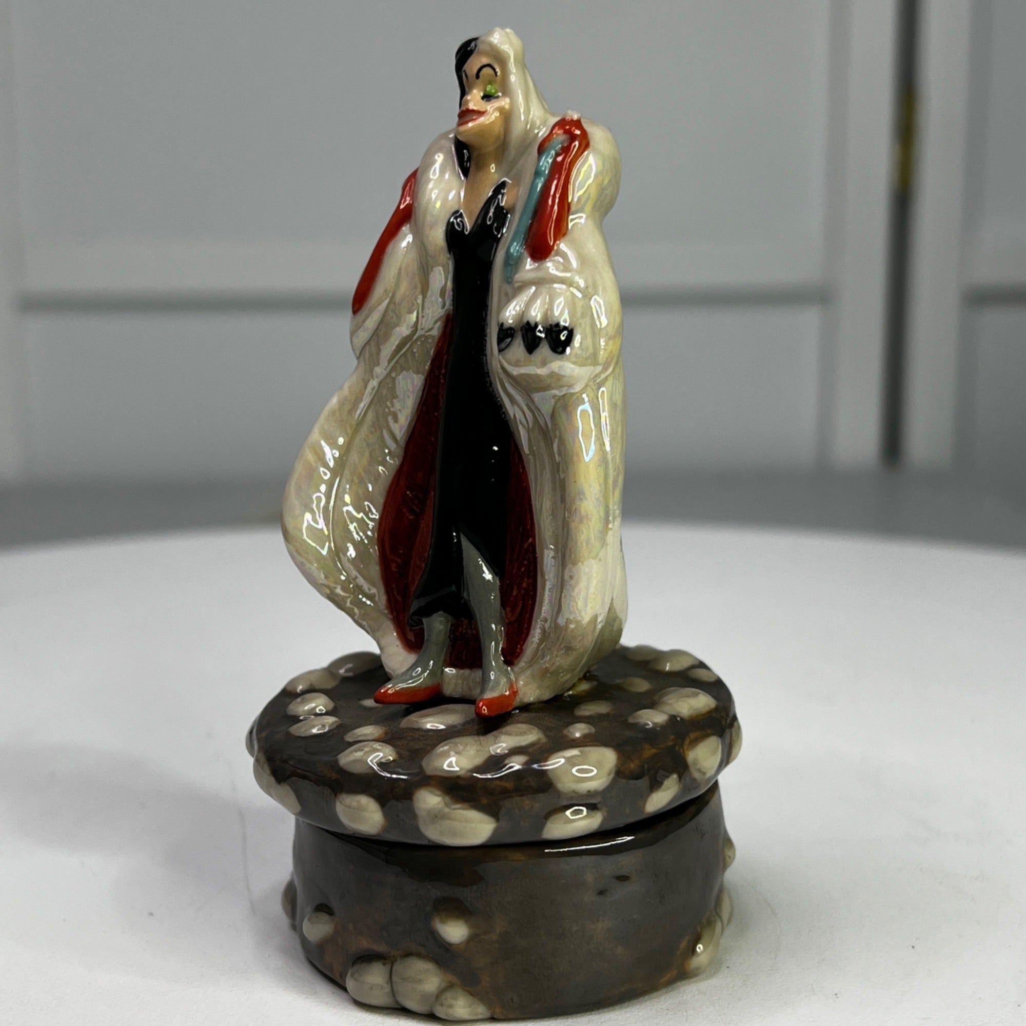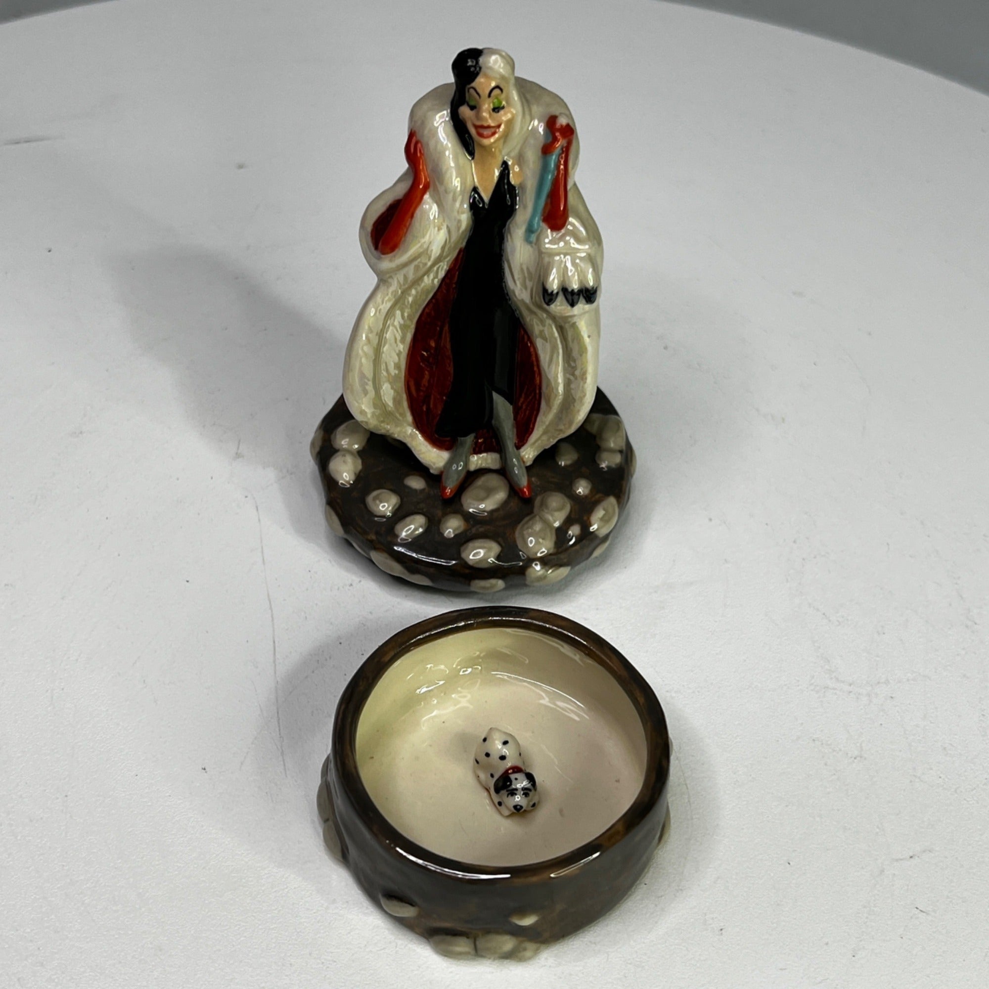 Disney Cruella De Vil 101 Dalmatians Porcelain Box by Michael Lawrence From 1990s. Figurine has beautiful colors and features Druella De Vil standing on a stone lid when when opened features on of the Dalmatian puppies inside. Size: 4 1/2" tall.