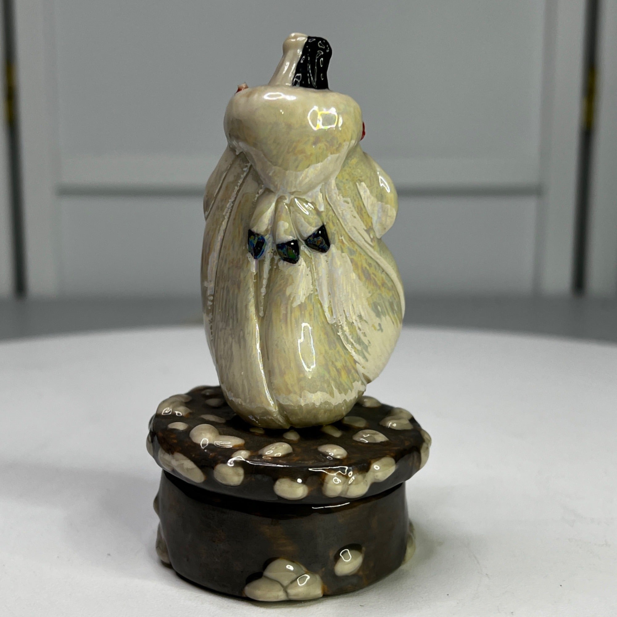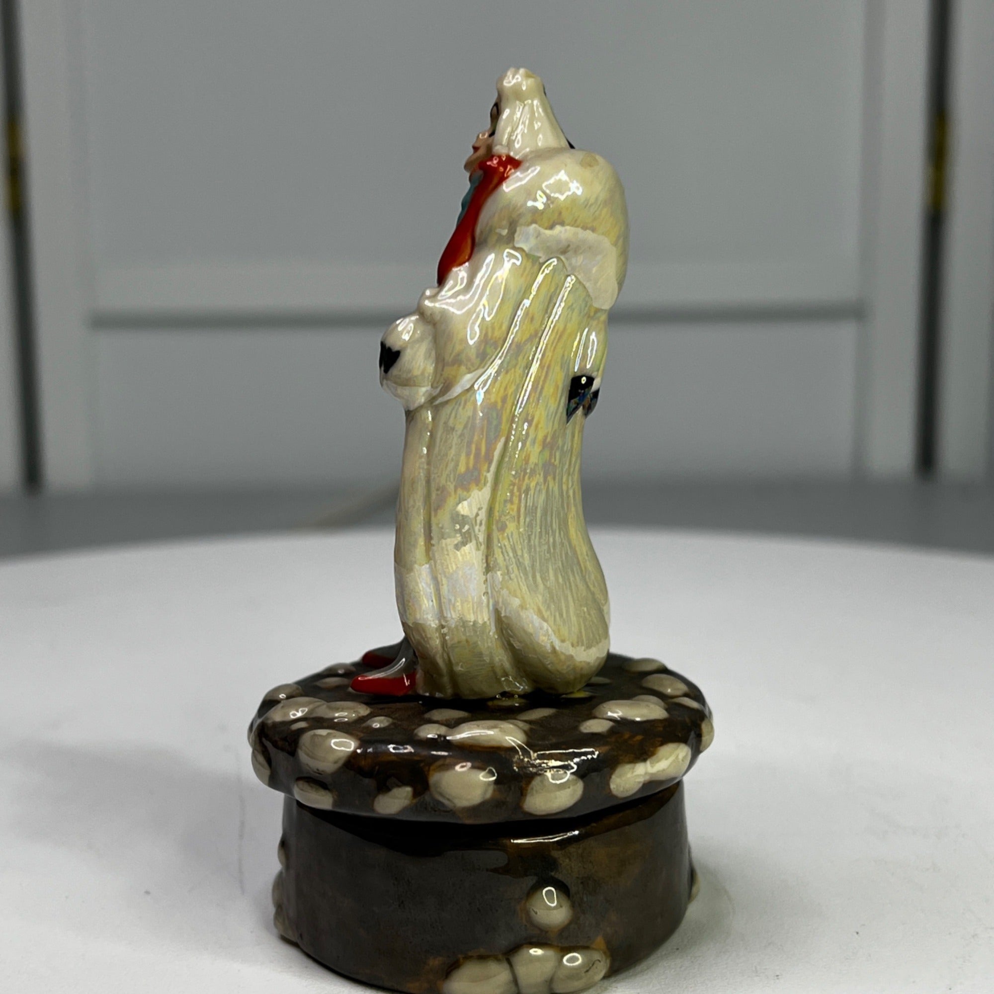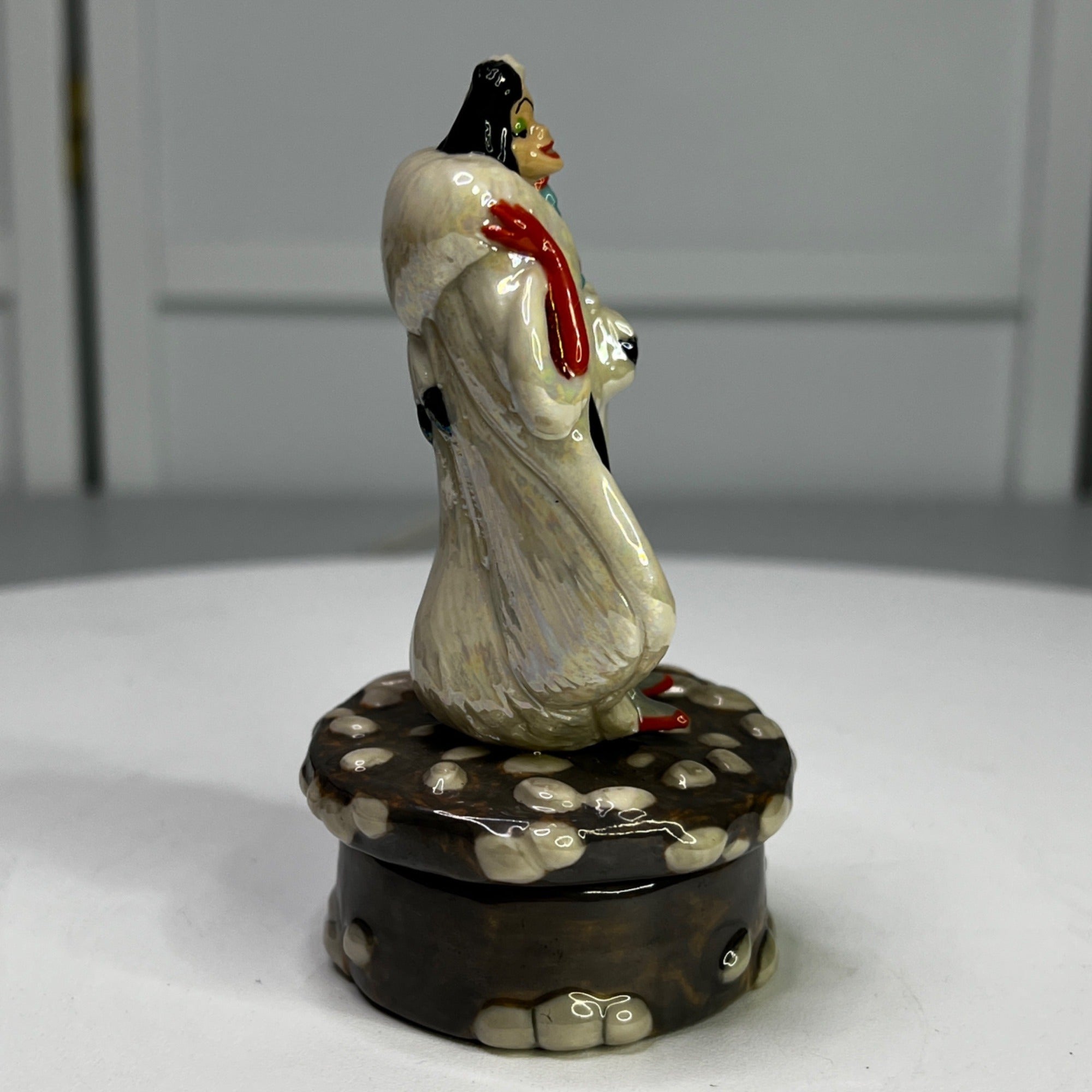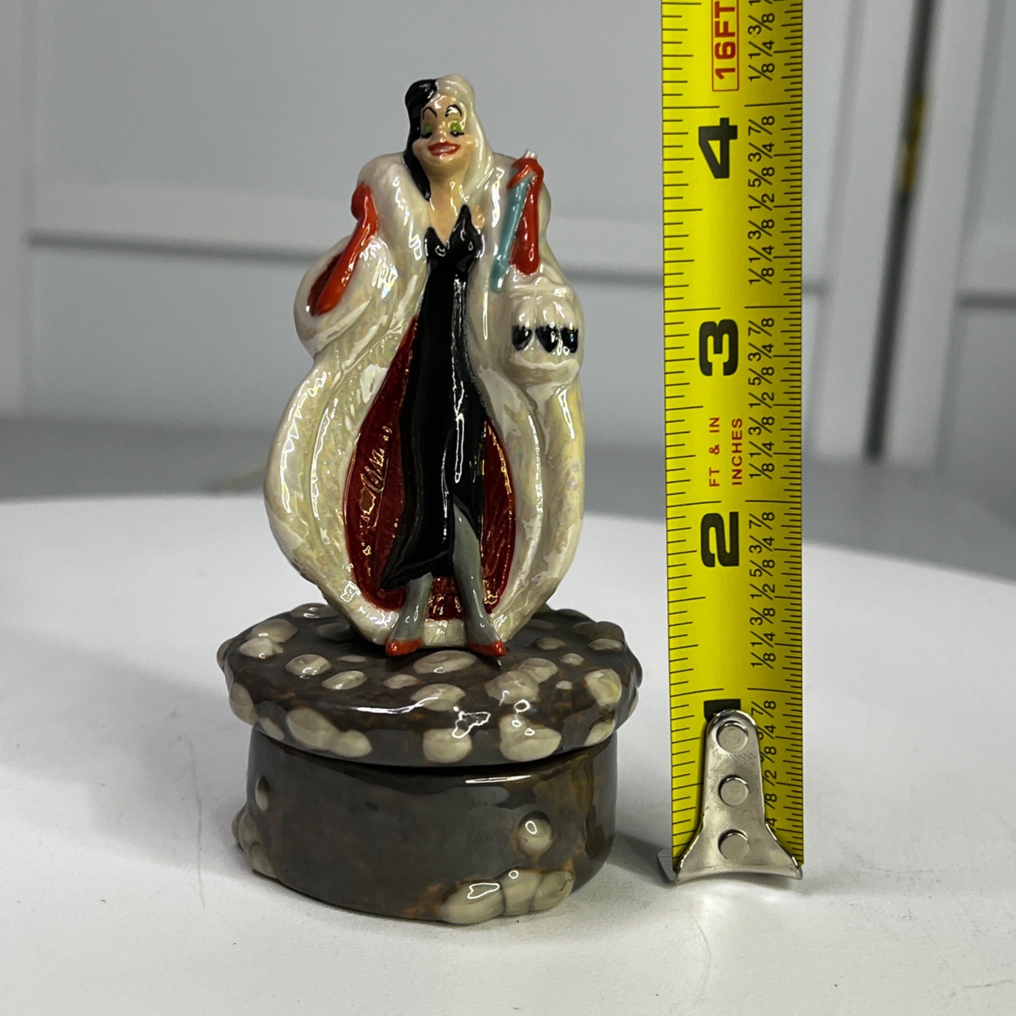 Disney Cruella De Vil 101 Dalmatians Porcelain Box by Michael Lawrence From 1990s. Figurine has beautiful colors and features Druella De Vil standing on a stone lid when when opened features on of the Dalmatian puppies inside. Size: 4 1/2" tall.