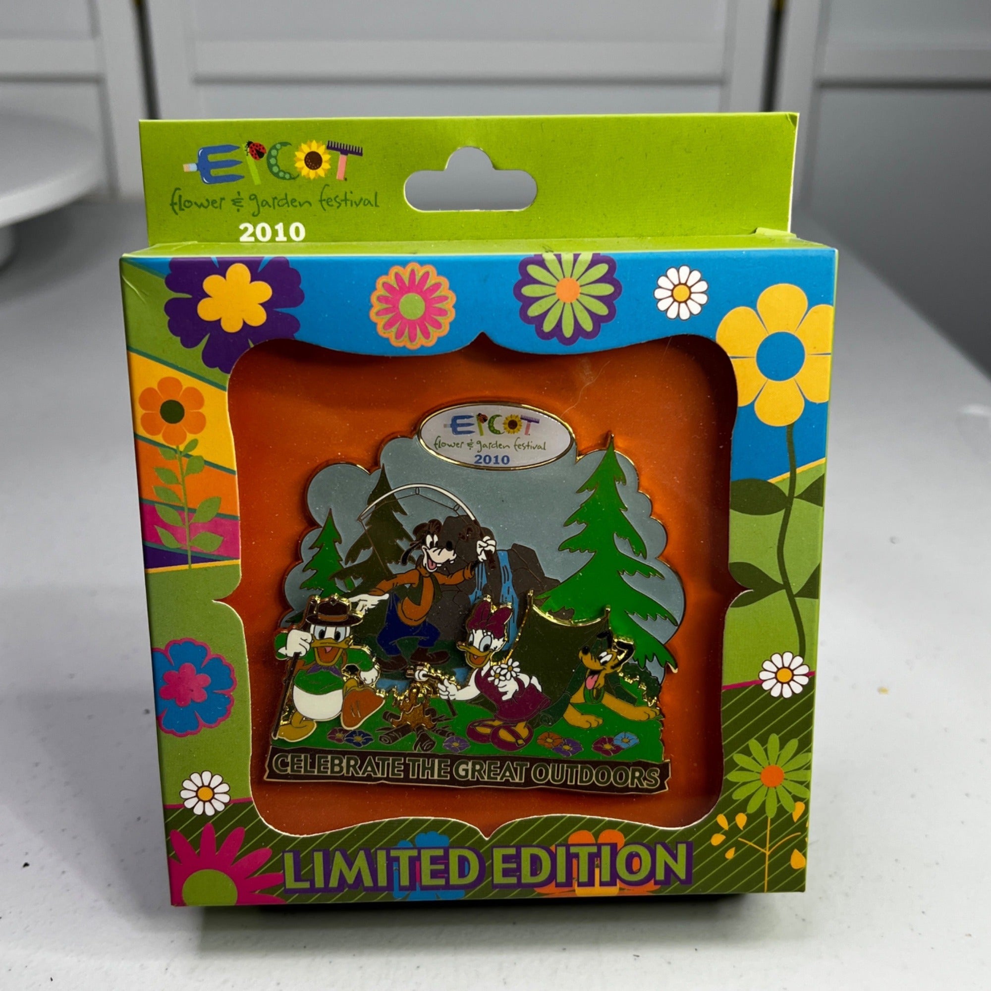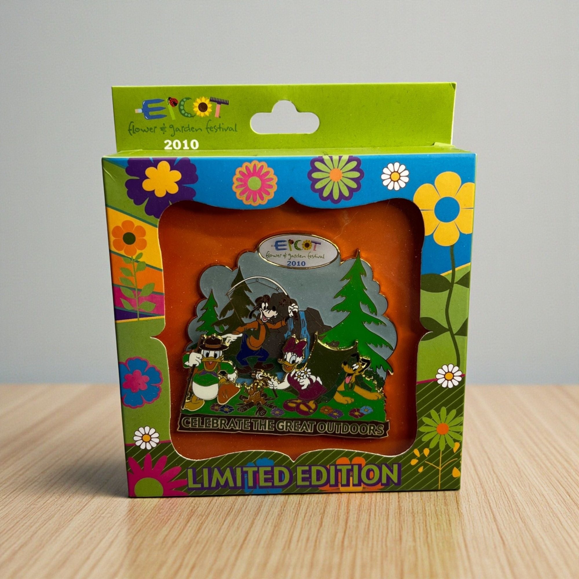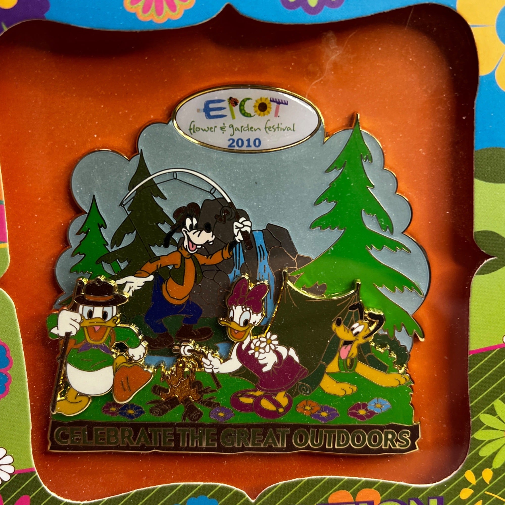 This unique pin features the Disney characters Donald Duck, Daisy Duck, Goofy, and Pluto camping in the great outdoors. The festival ran from March - May 2010. This is a Jumbo sized pin