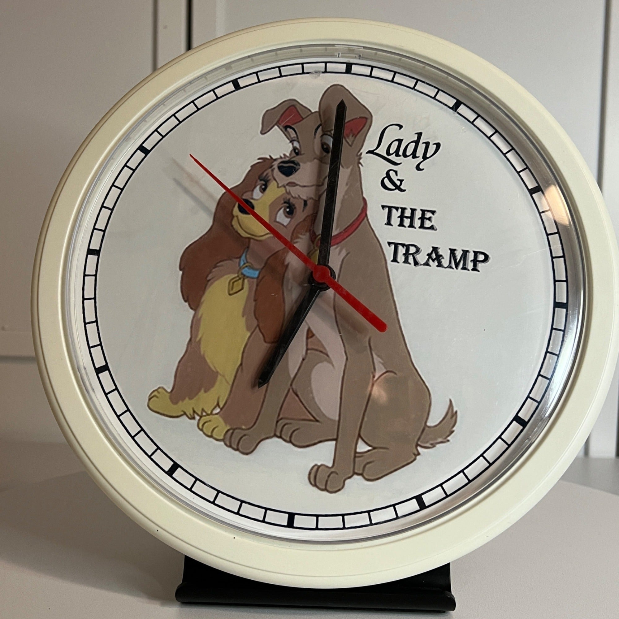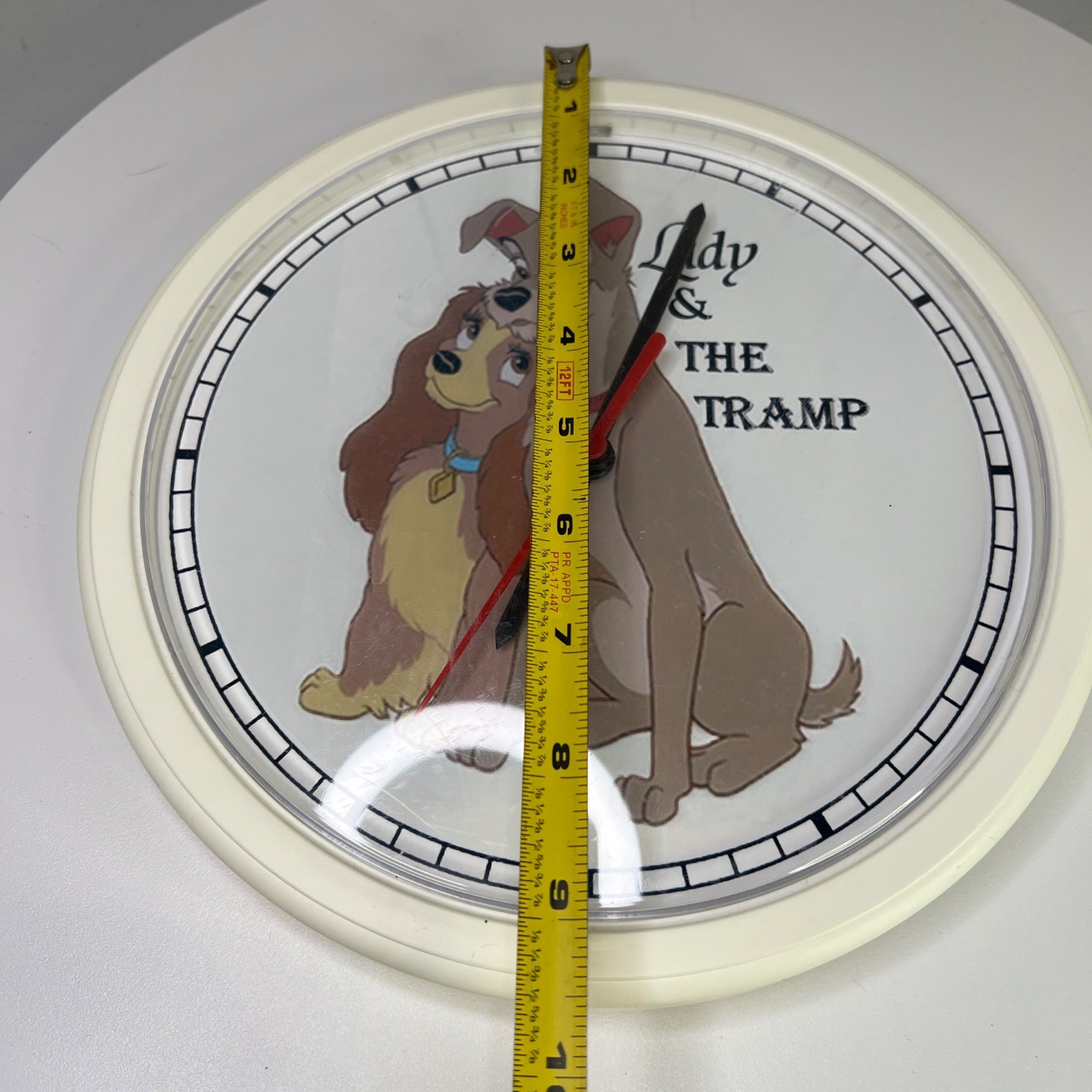 This delightful pre-owned wall clock adorned with the charming duo from Disney's Lady and the Tramp captures the nostalgic essence of a bygone era. Its classic design serves as a whimsical reminder of the beloved animated tale, adding a touch of vintage Disney magic to any space. Made of durable plastic, it is both lightweight and enduring.