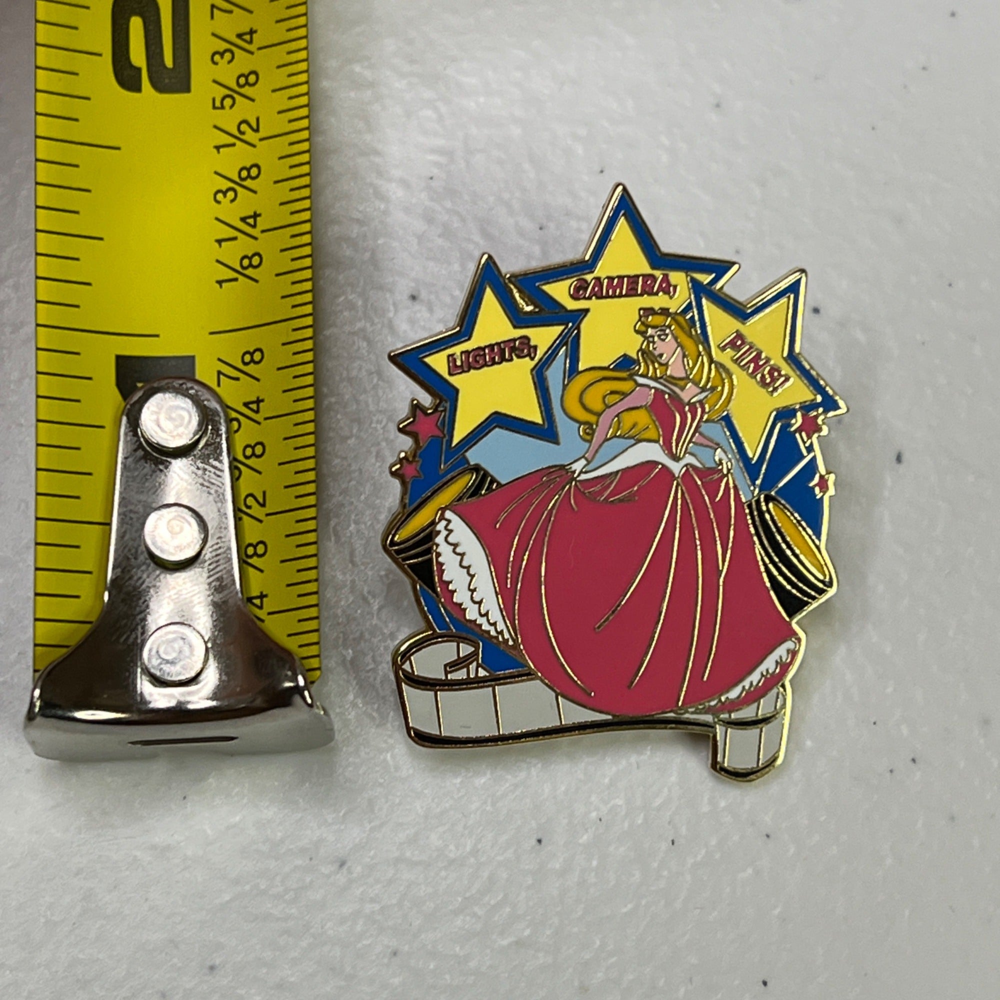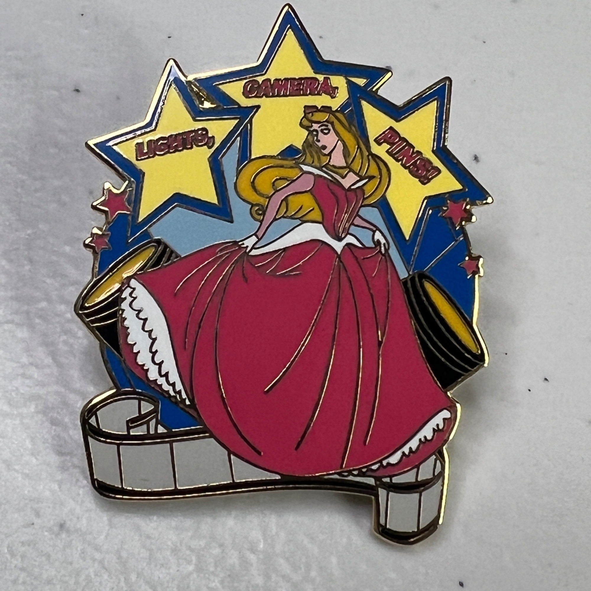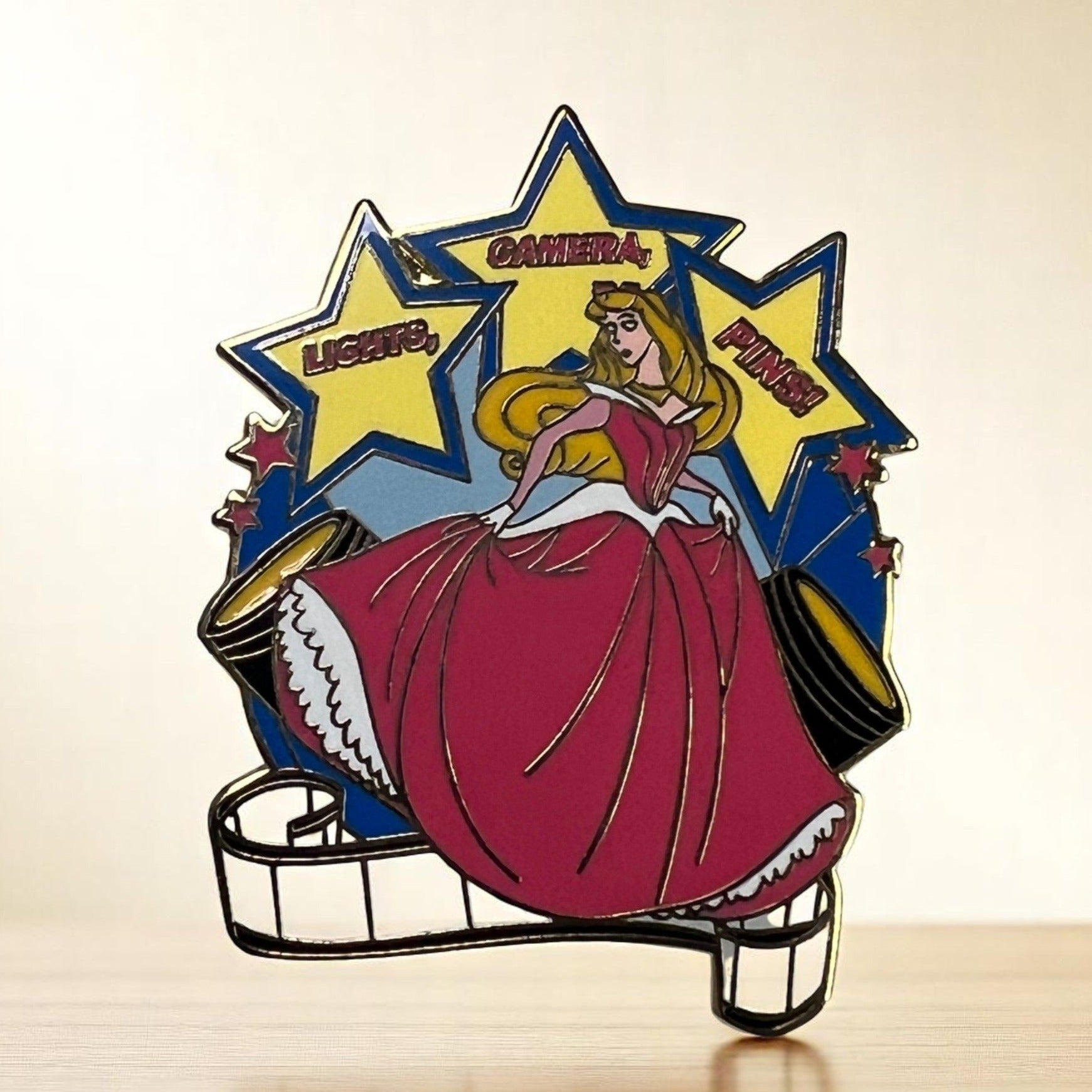 This unique pin features the Disney character Aurora in her pink dress, posing in front of movie search lights with the words Lights, Camera, Pins! in stars above her.