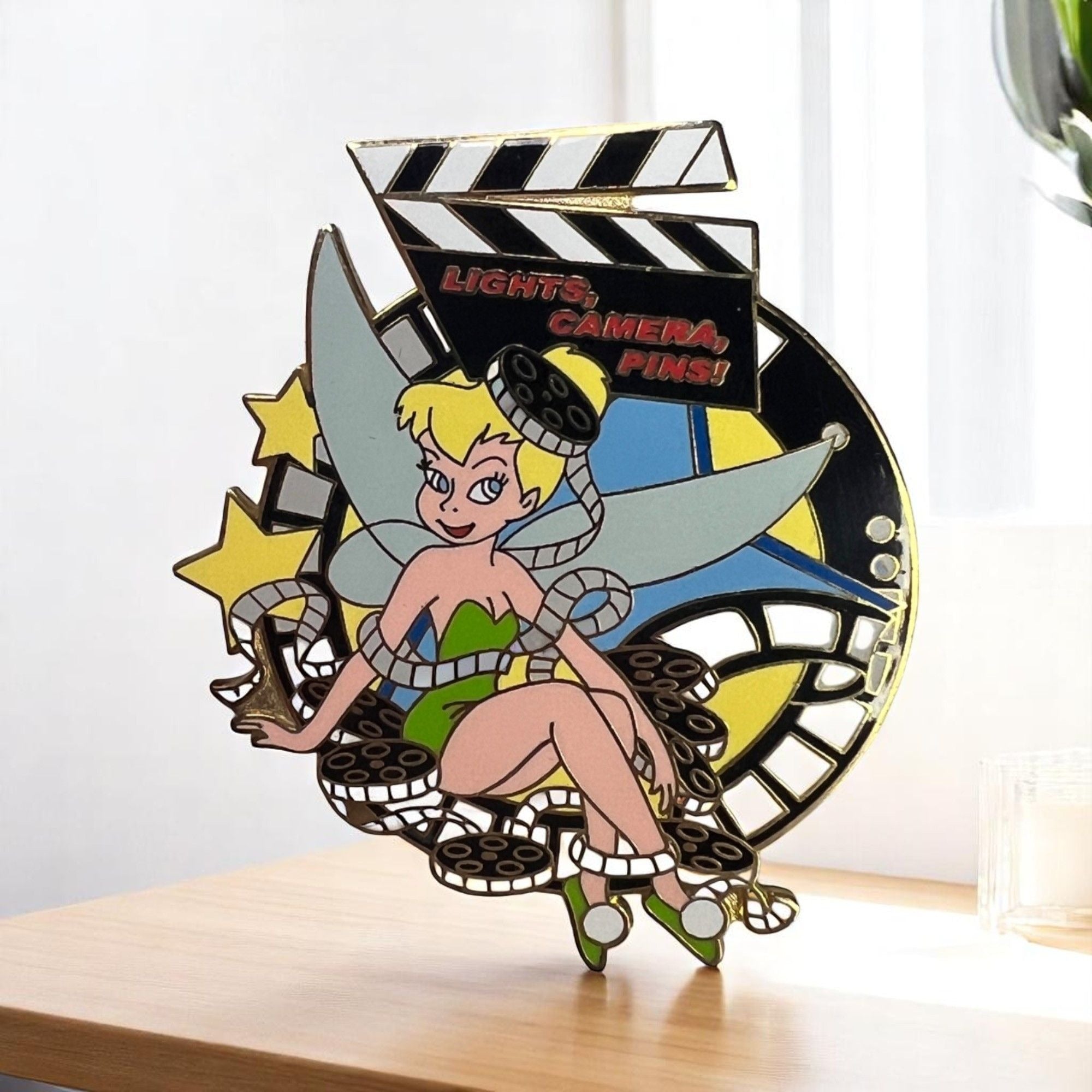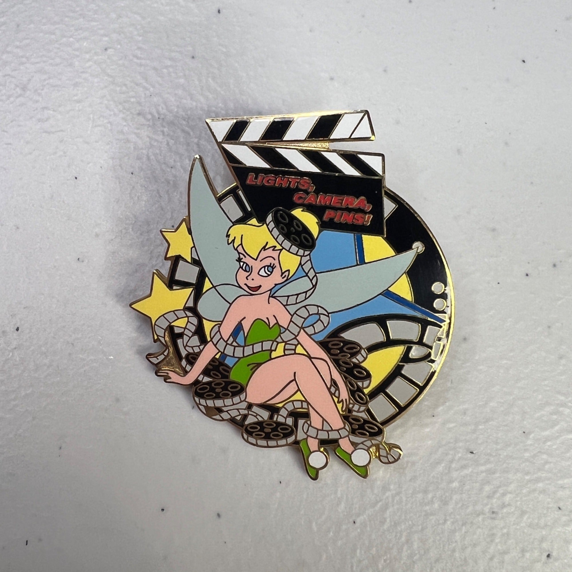 This unique pin features the Disney character Tinker Bell sitting in a pile of unwound film reels with a clapboard above her head that reads "Lights, Camera, Pins".