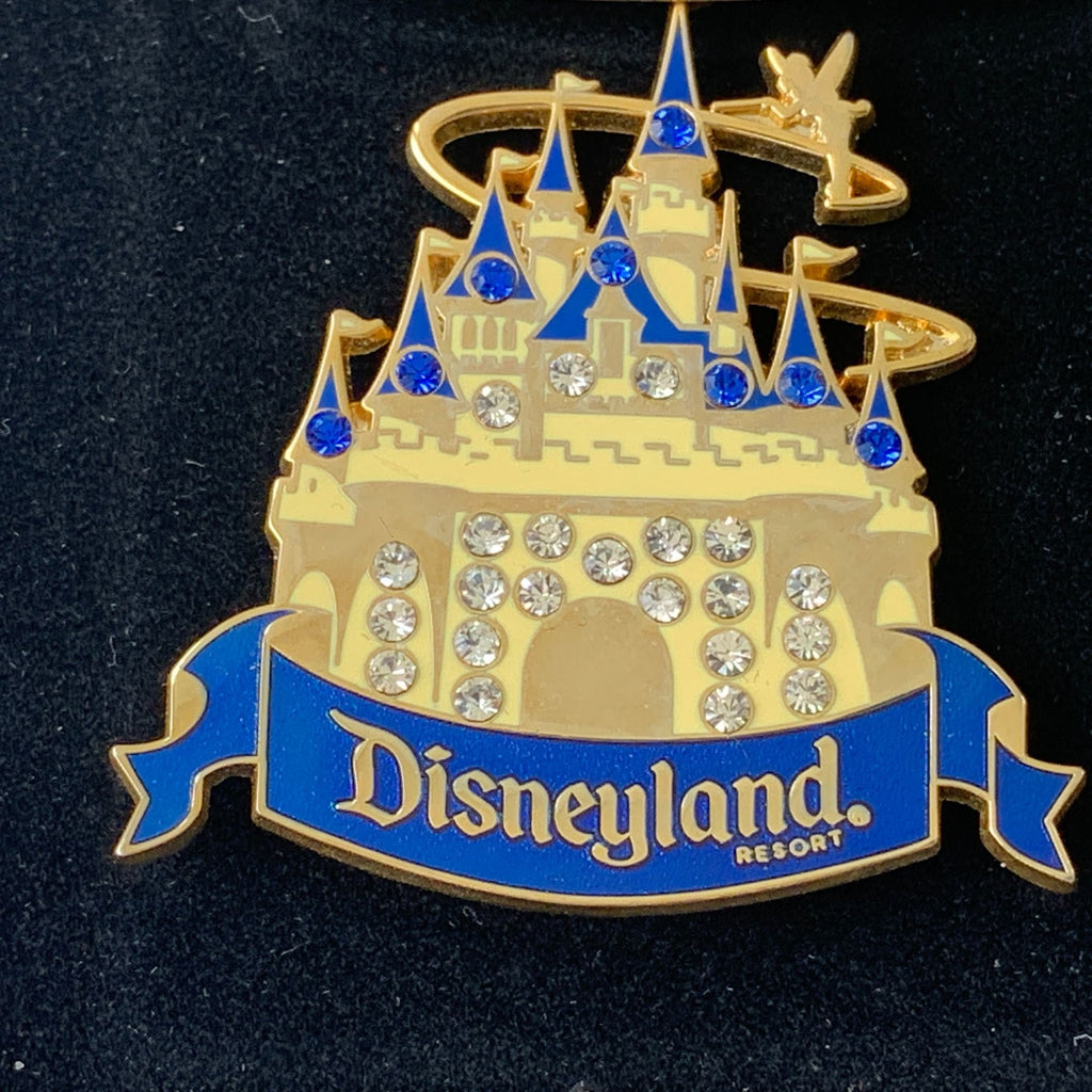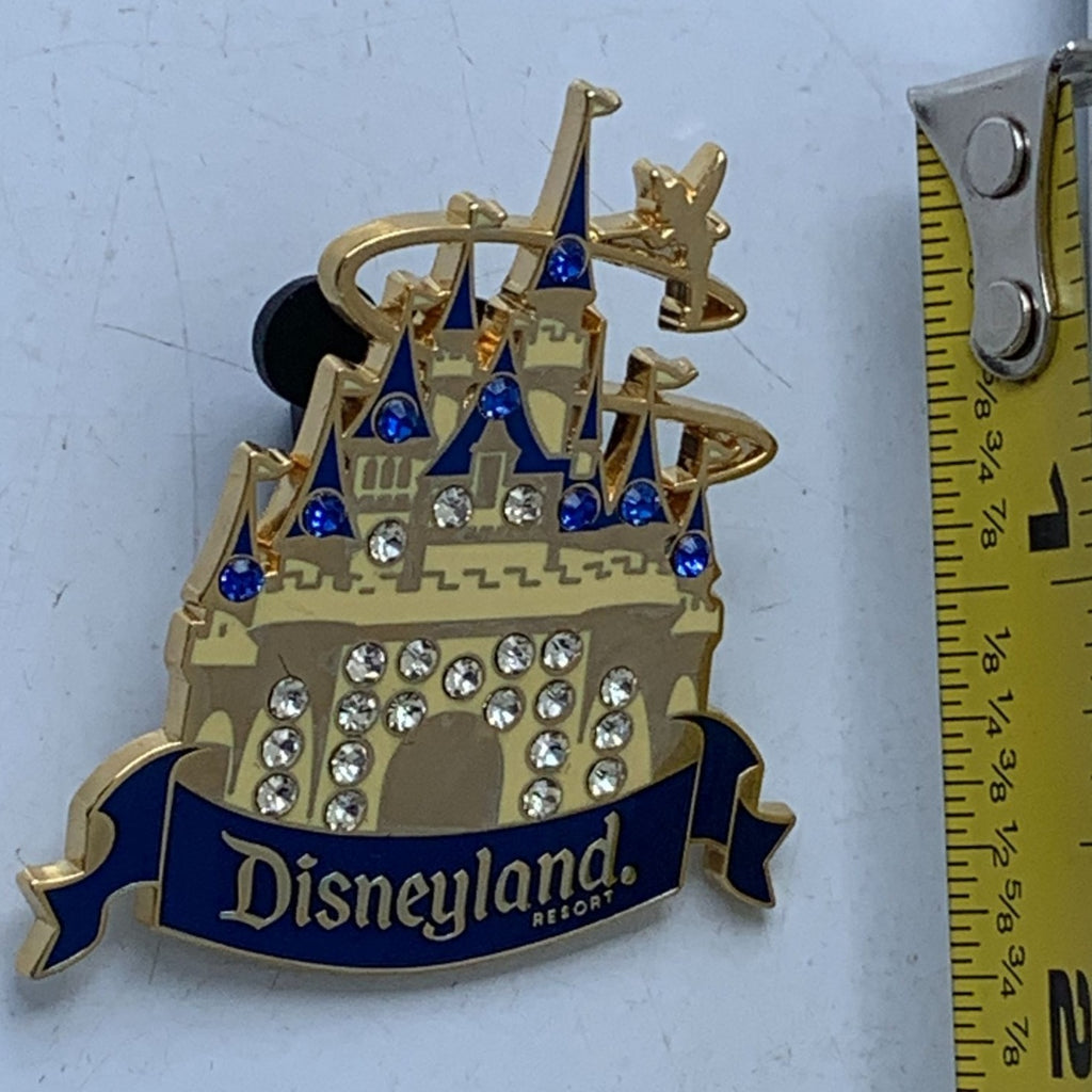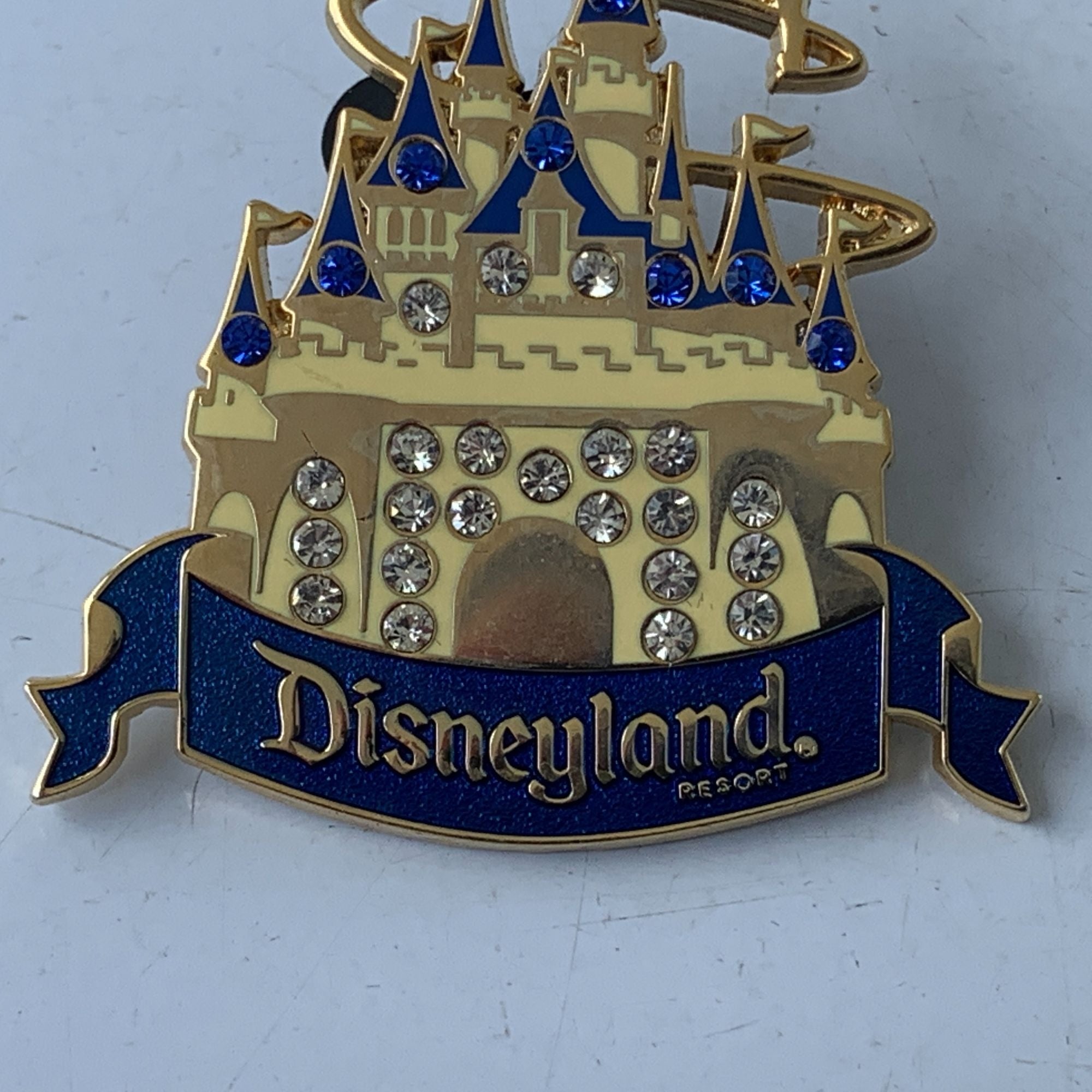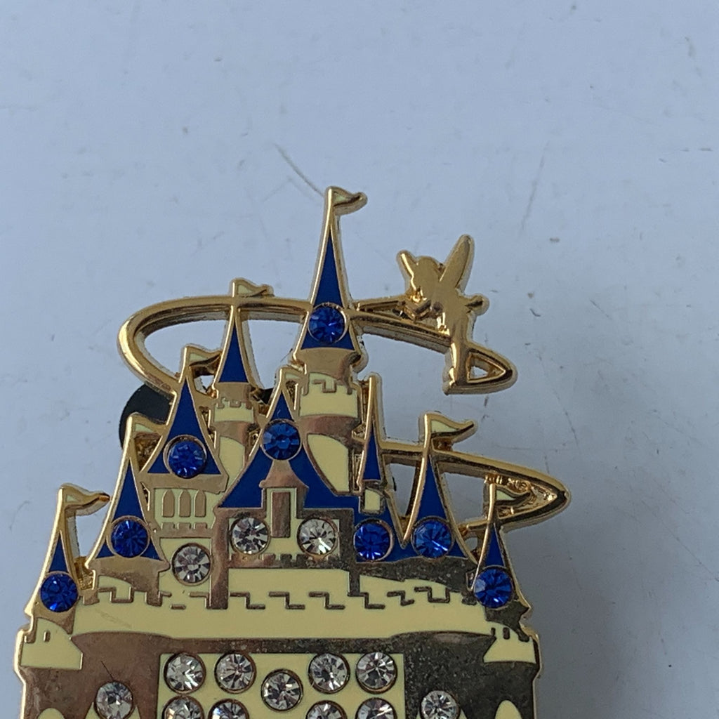 This unique pin features the Disney's Sleeping Beauty's castle at Disneyland and has Tinker Bell flying over the right side of the castle. The pin has blue and white rhinestones surrounding the entrance to the castle and among the spires. It also has a blue ribbon at the bottom of the pin saying Disneyland.