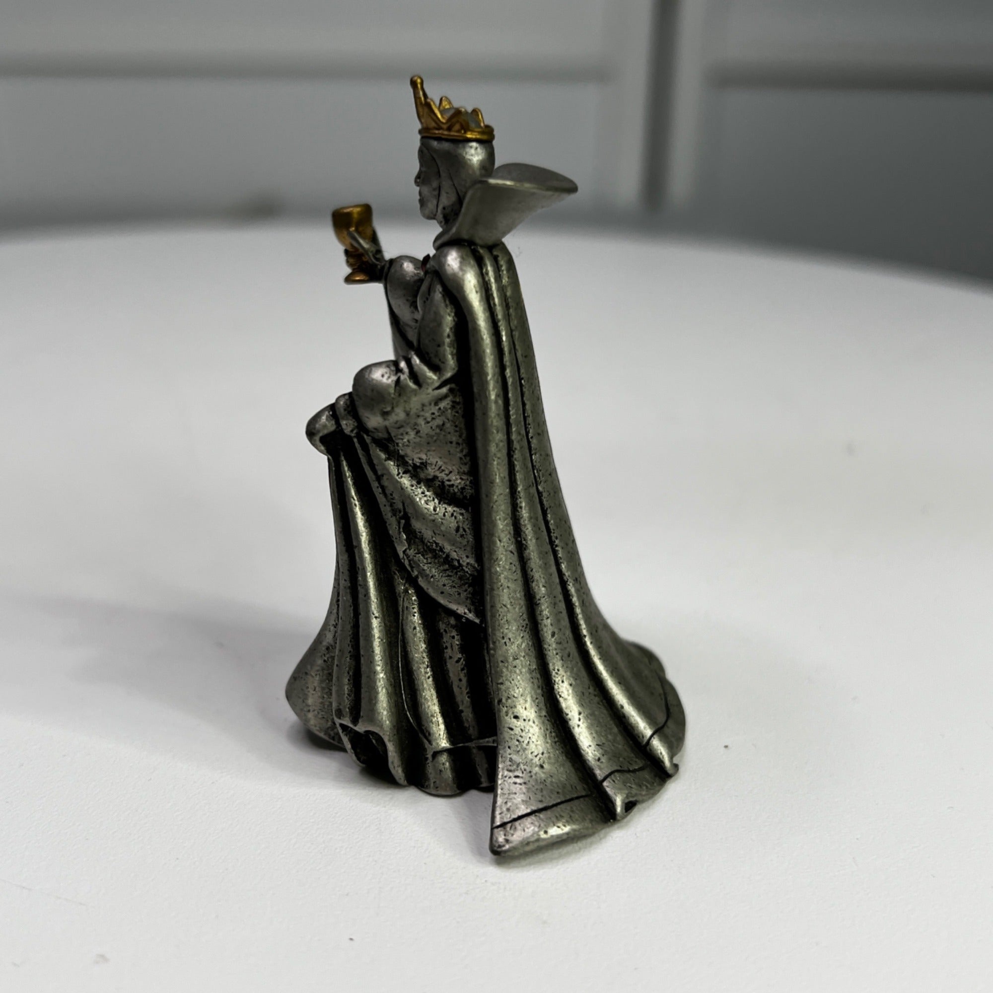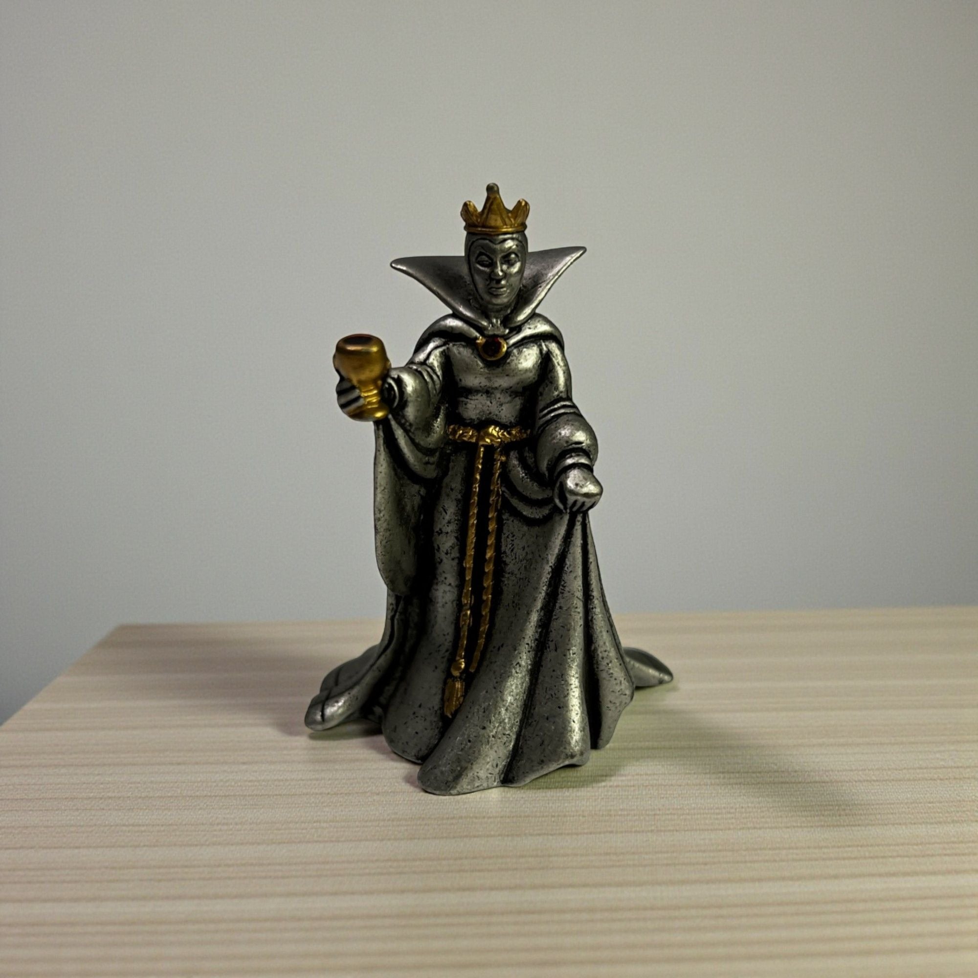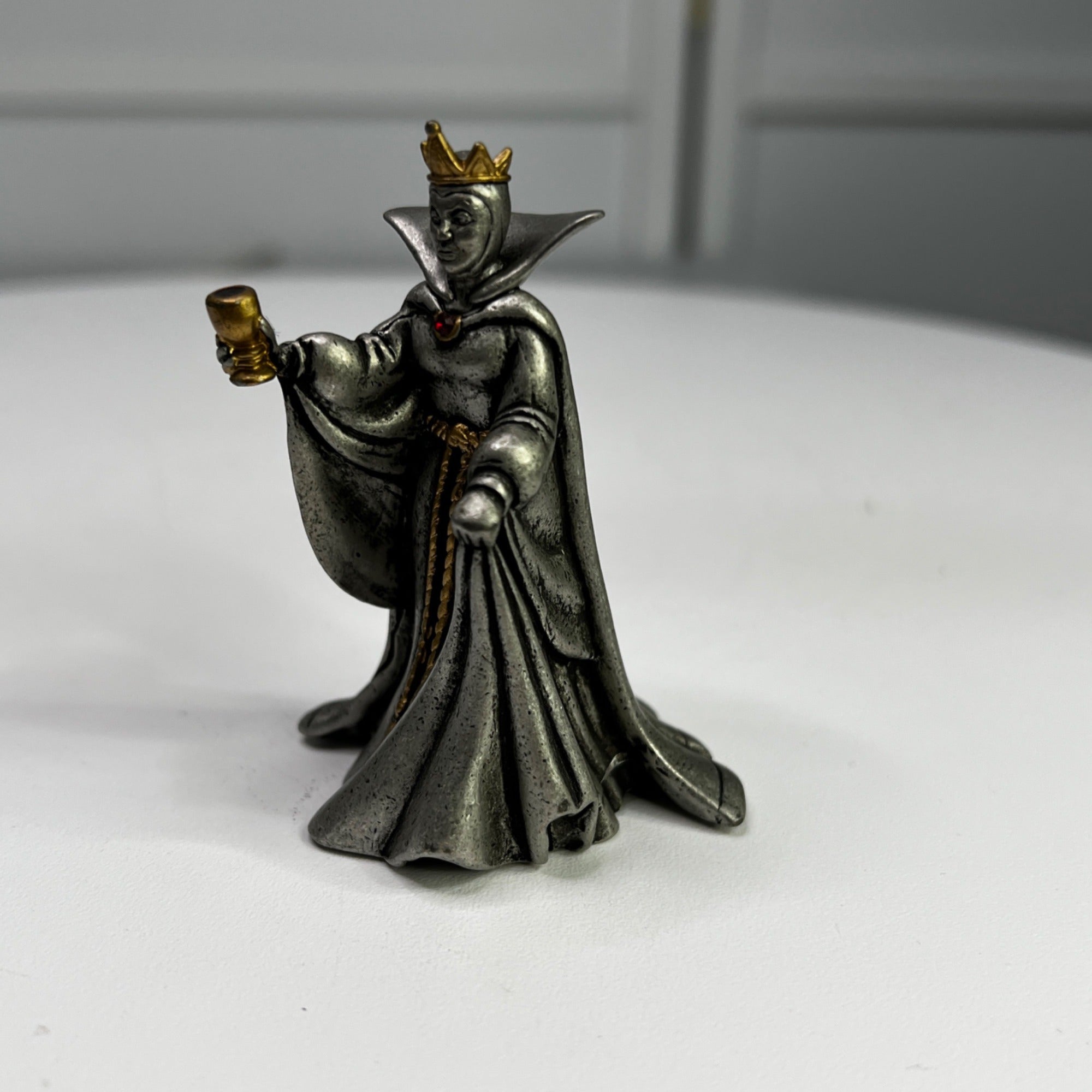 Disney Villains Collection Pewter Evil Queen Figurine from 1997. This was part of the Villains Pewter Sculpture Collection and features the Evil Queen accented with purple enamel and a gold-plated metal crown, goblet, belt and brooch which is accented with a red faceted Swarovski crystal, and inspired by her appearance in Walt Disney’s Snow White and the Seven Dwarfs animated film (1937). Size: 3" tall.