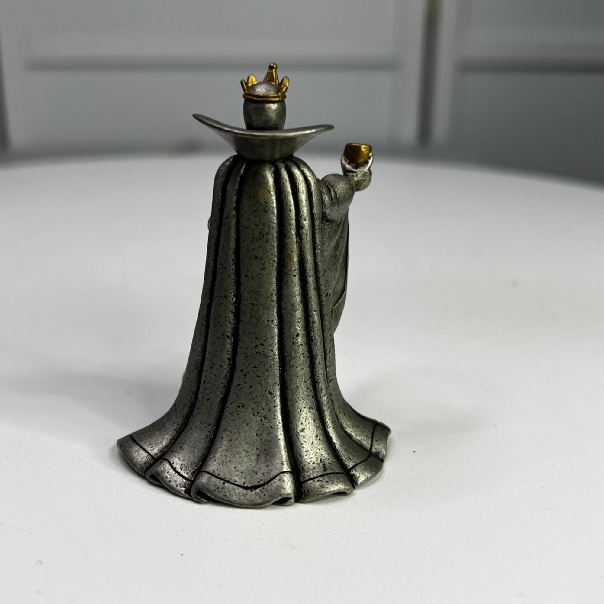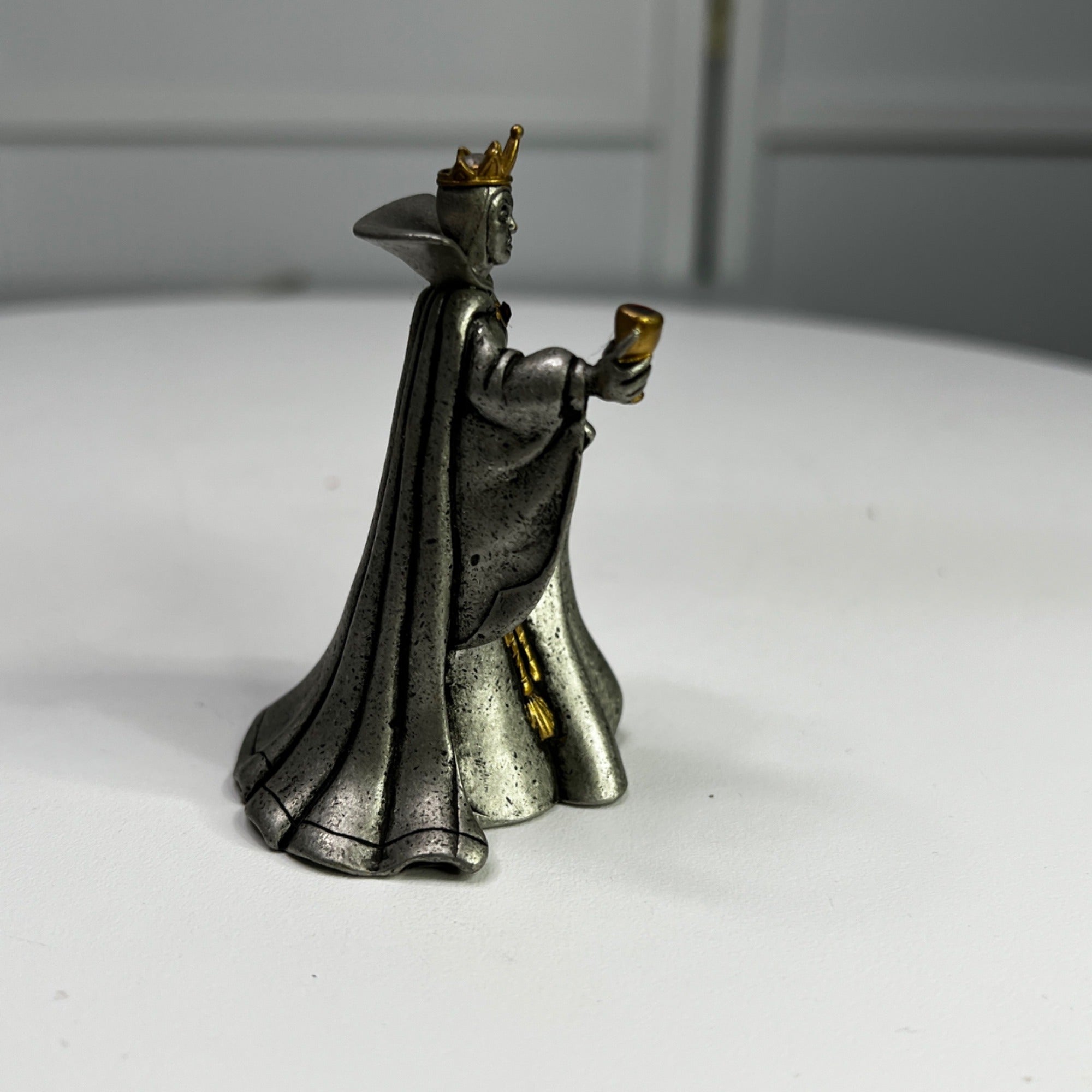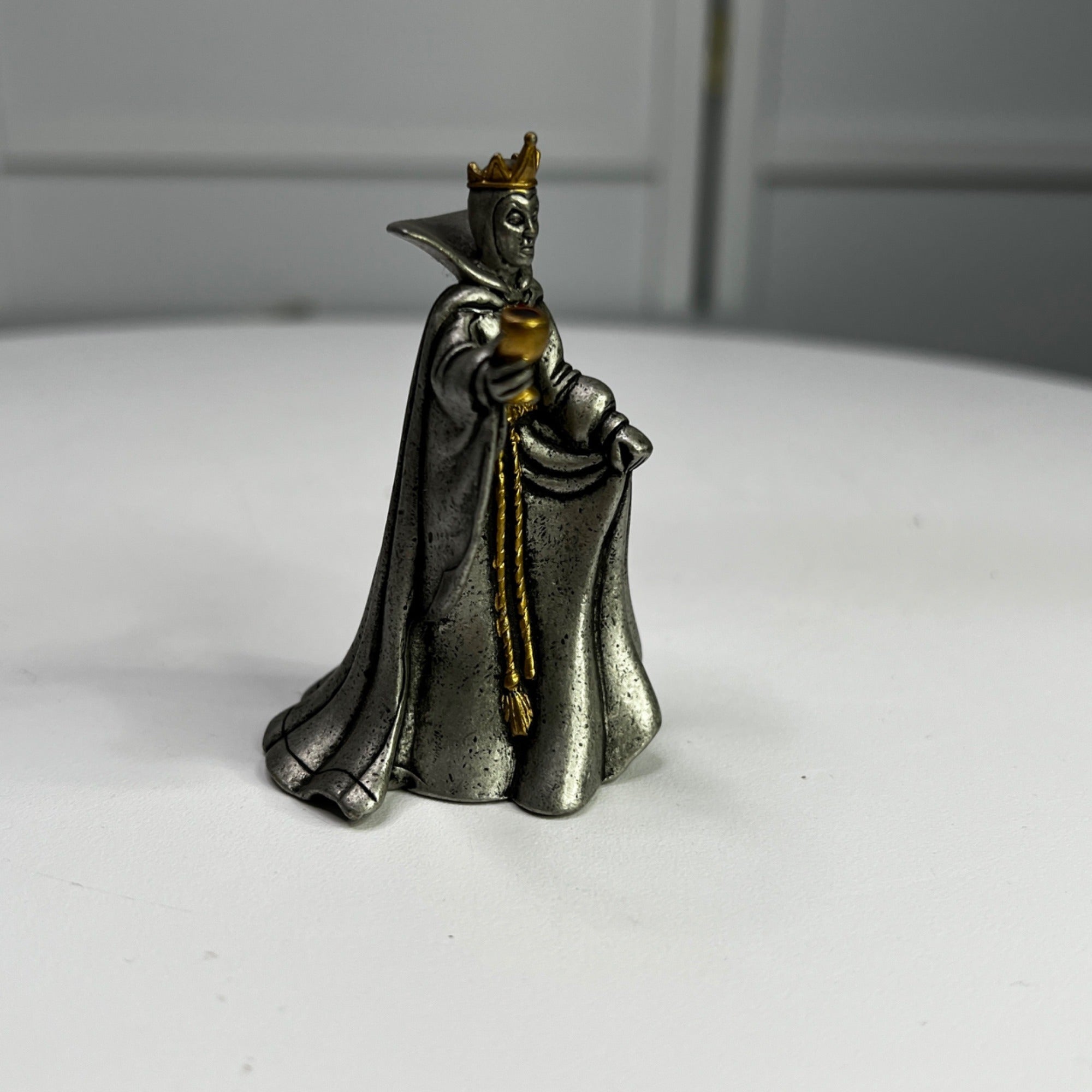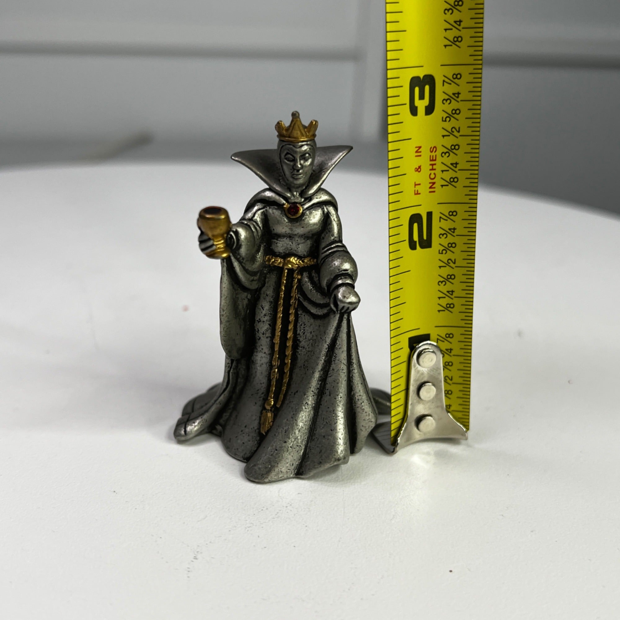 Disney Villains Collection Pewter Evil Queen Figurine from 1997. This was part of the Villains Pewter Sculpture Collection and features the Evil Queen accented with purple enamel and a gold-plated metal crown, goblet, belt and brooch which is accented with a red faceted Swarovski crystal, and inspired by her appearance in Walt Disney’s Snow White and the Seven Dwarfs animated film (1937). Size: 3" tall.