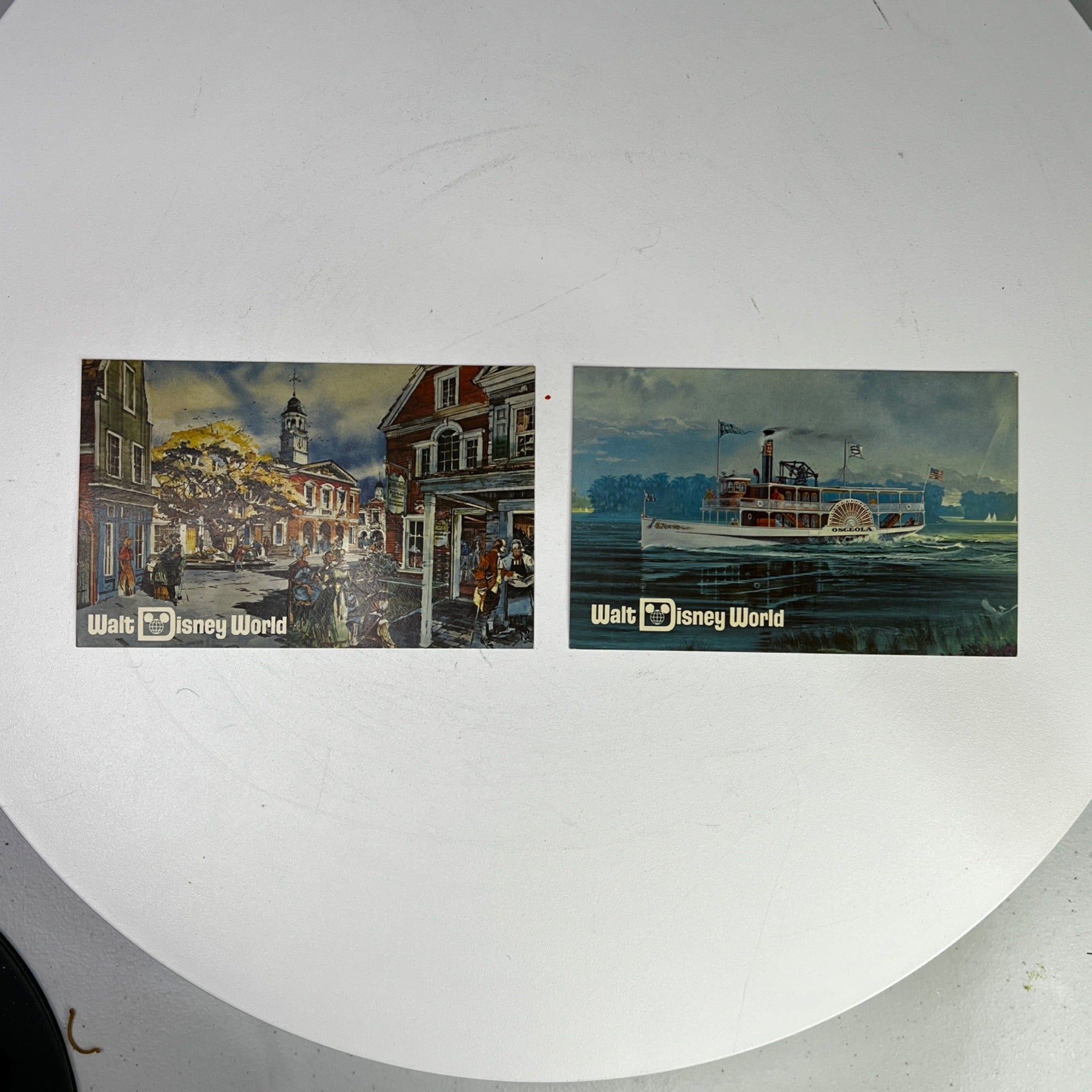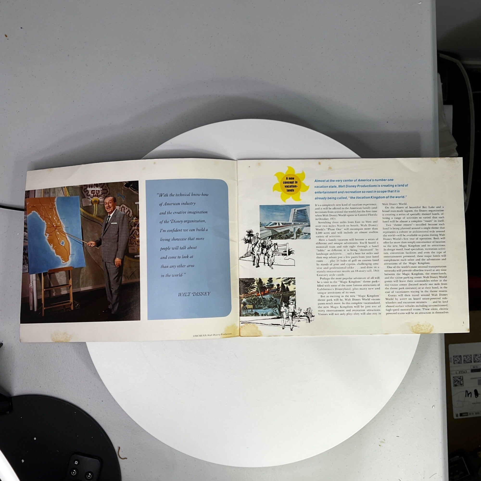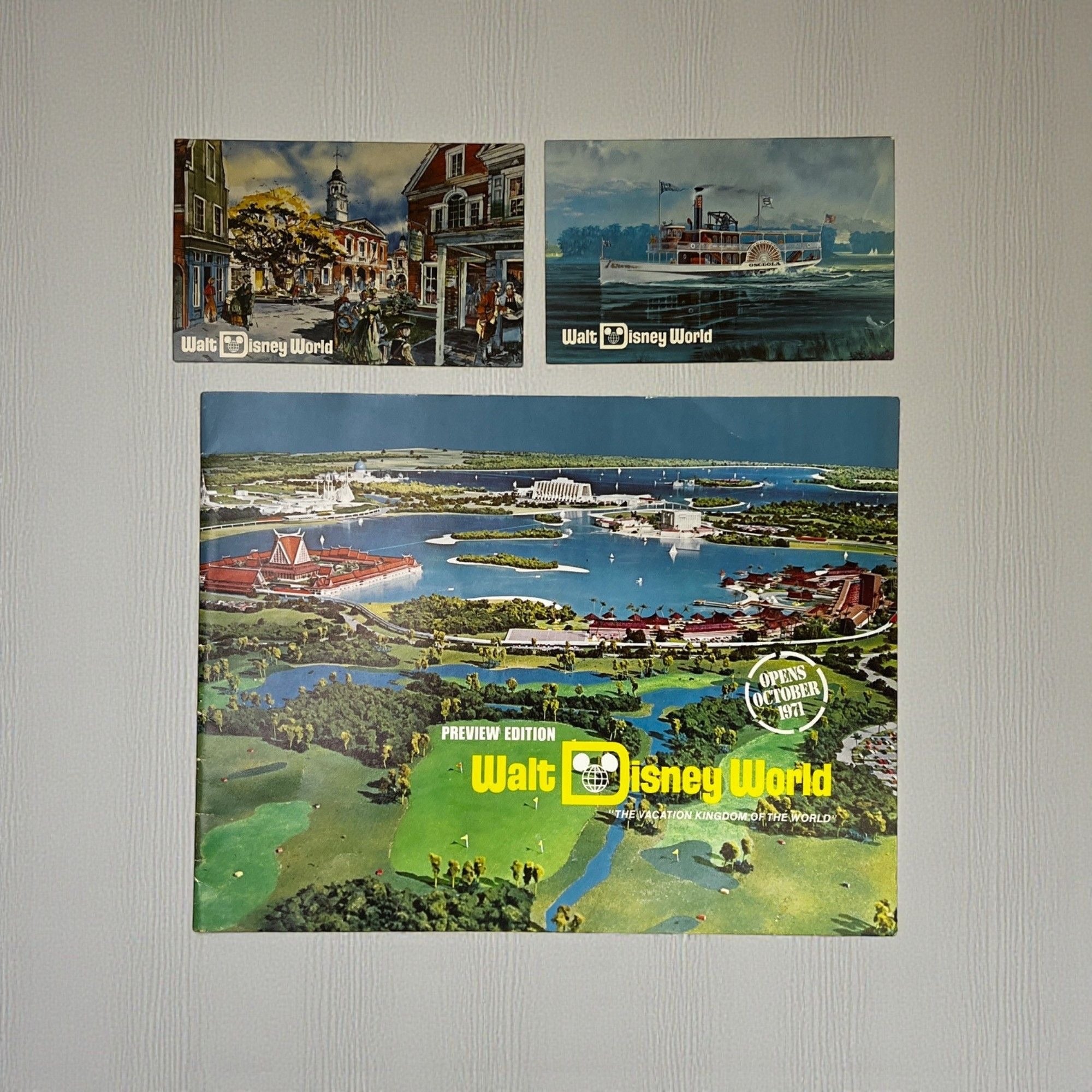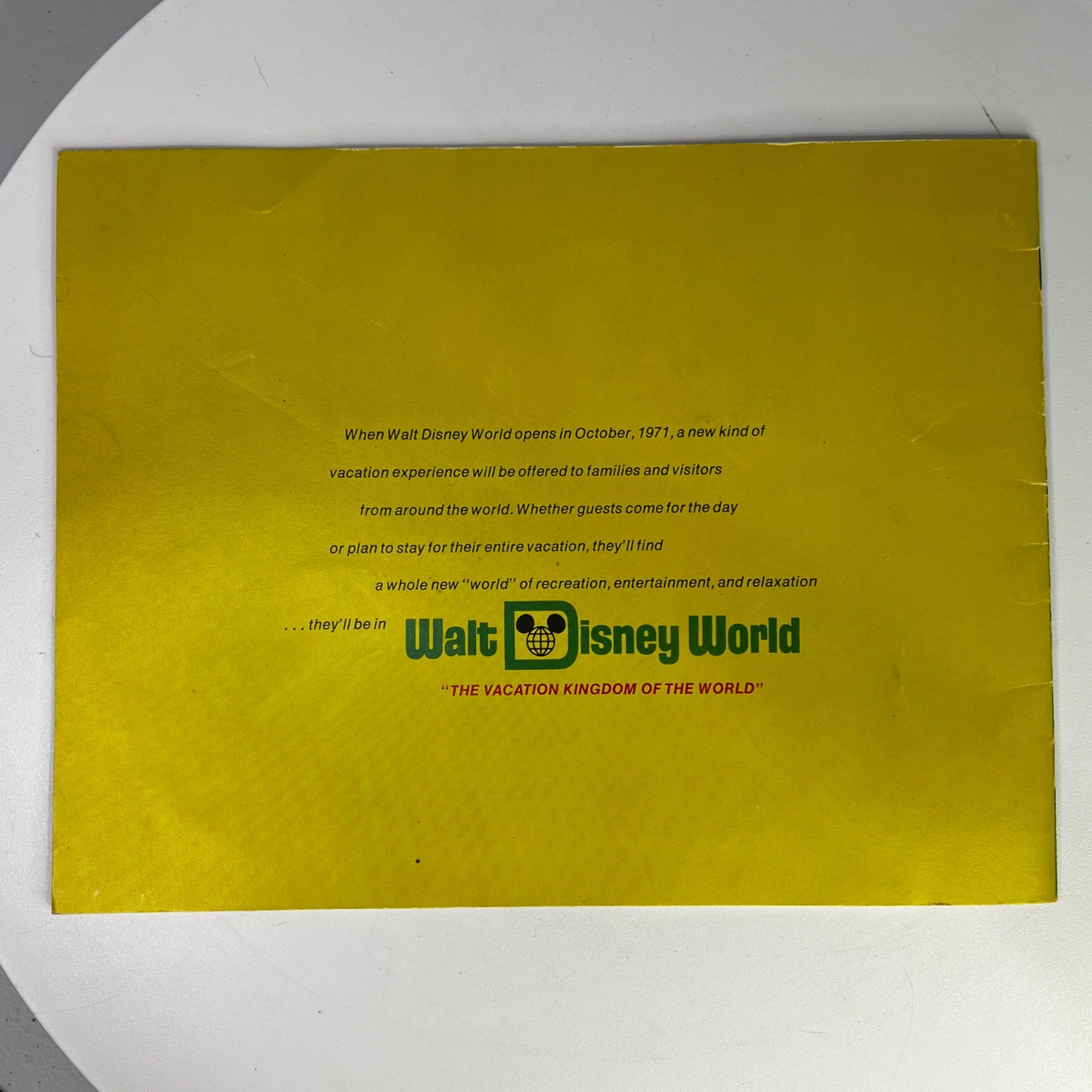 Walt Disney World Preview Edition Promotional Brochure & Post Cards from the 1970. Pretty rare piece of Disney history and also includes 2 unused post cards from the early 1970s period. Note the inscription on the back of the brochure "the vacation kingdom of the world". Some of the pages have some water stains as shown in the pictures. All pages are intact with no rips or tears.